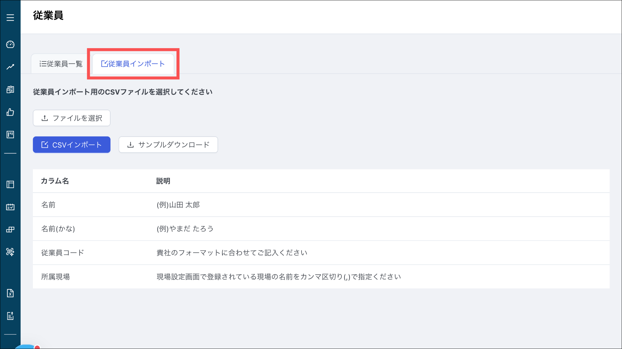 CSVに必要な項目は「名前」「名前(かな)」「従業員コード(従業員管理番号)」「所属現場」です。