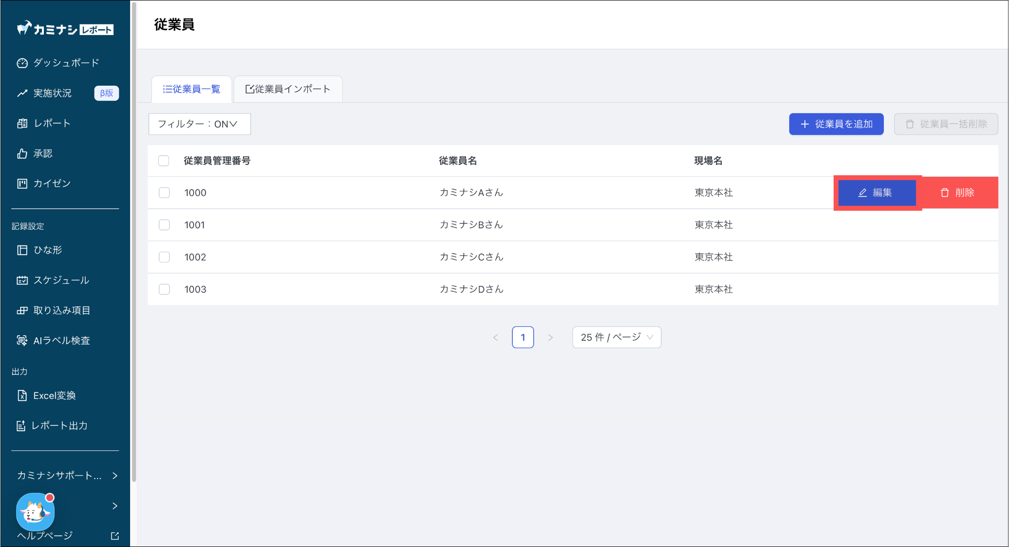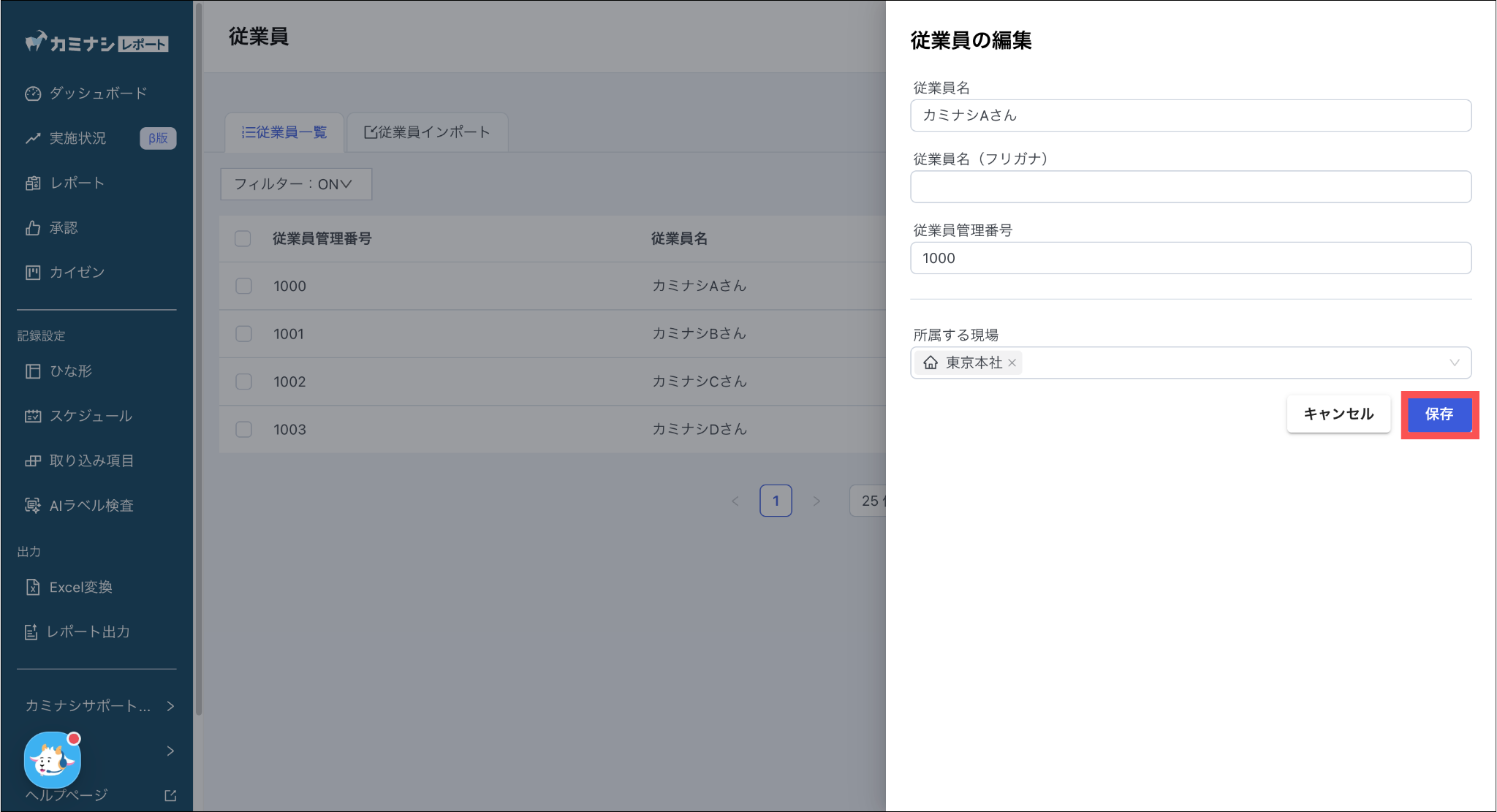 1. カミナシレポート 管理画面にログインする2.「設定」を選択し、「従業員」を押す3.「従業員一覧」を選択し、編集する従業員の「編集」を押す4. 従業員情報を編集し、「保存」を押すよくある質問は、こちらからご確認ください。