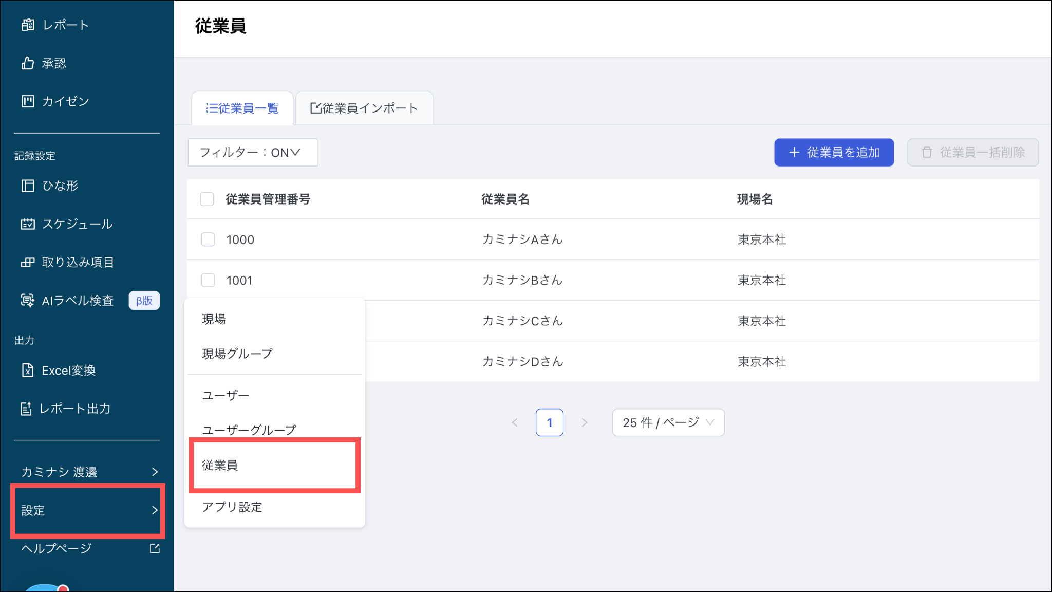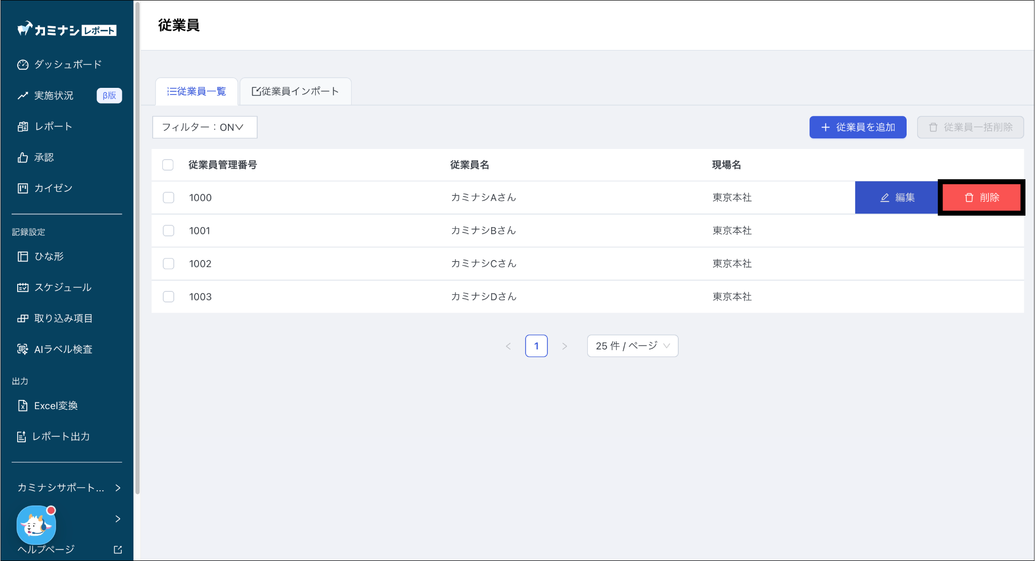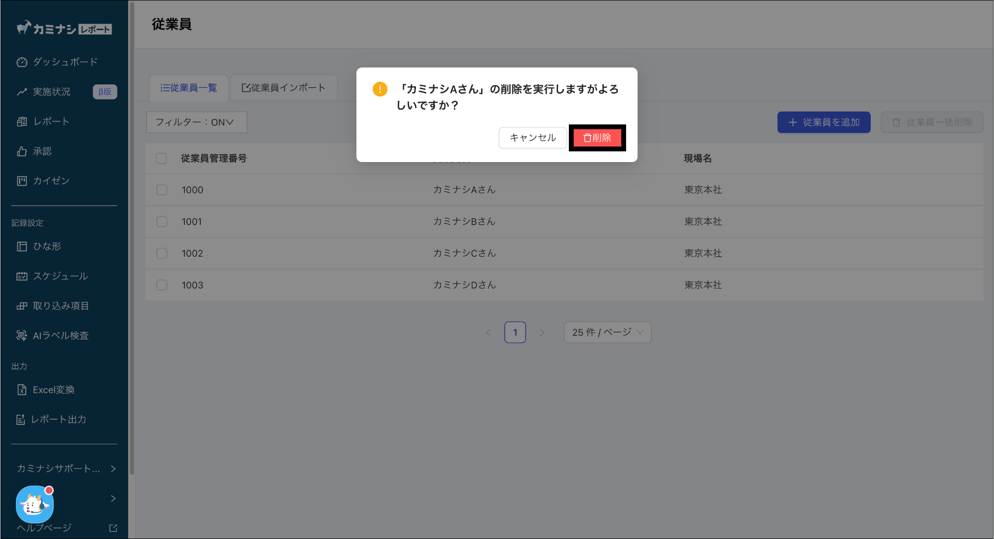 1. カミナシレポート 管理画面にログインする2.「設定」を選択し、「従業員」を押す3.「従業員一覧」を選択し、削除する従業員の「削除」を押す4.再度確認し、 「削除」を押す一度削除された従業員は復元できませんのでご注意ください。よくある質問は、こちらからご確認ください。