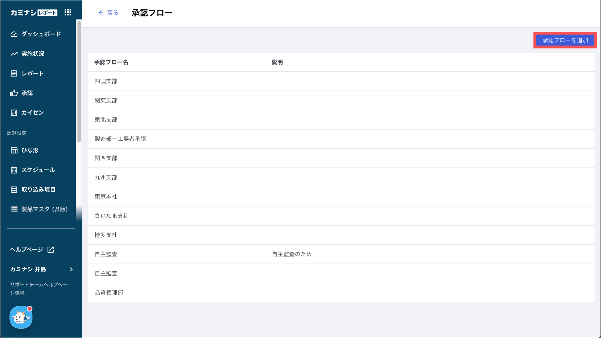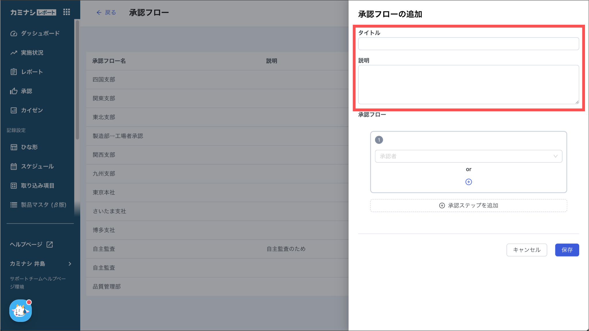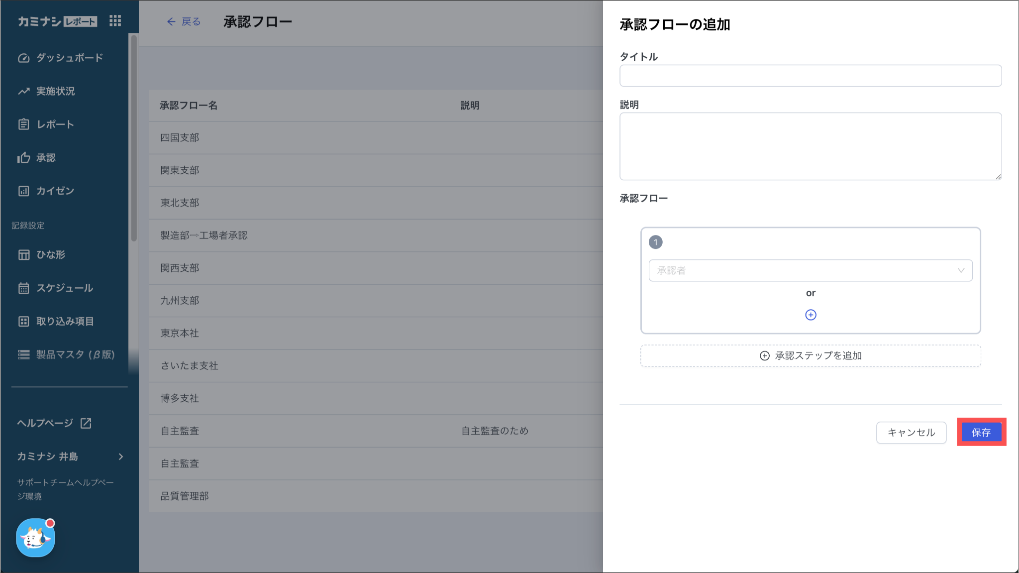 表形式のひな形(取り込み項目あり)の設定方法については、「表形式のひな形(取り込み項目あり)を作成する:8.承認フローを選択する」をご参照ください。