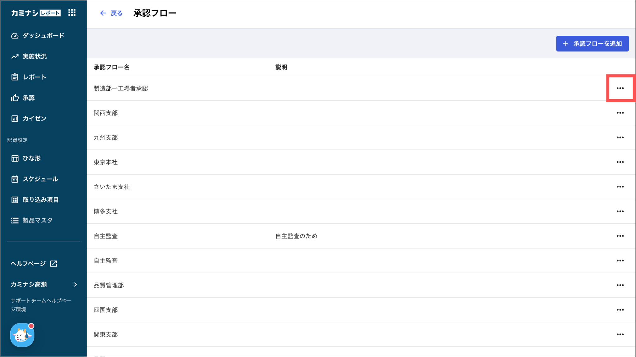 1. カミナシレポート 管理画面にログインする2.「承認」を開き、「承認フロー設定」を押す3. 削除する承認フローの「⋯」を押す4. 「削除」を押す一度削除された承認フローは復元できませんのでご注意ください。よくある質問は、こちらからご確認ください。