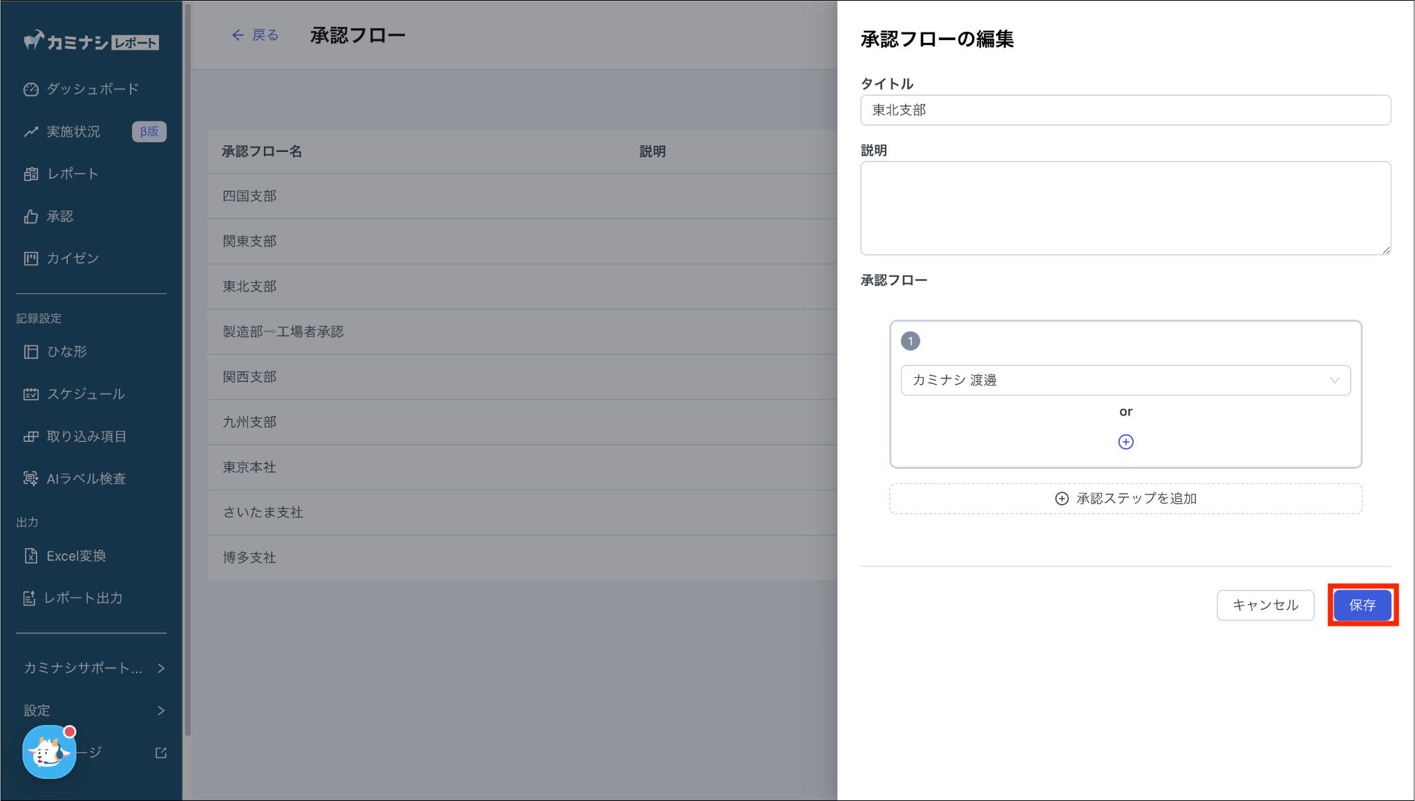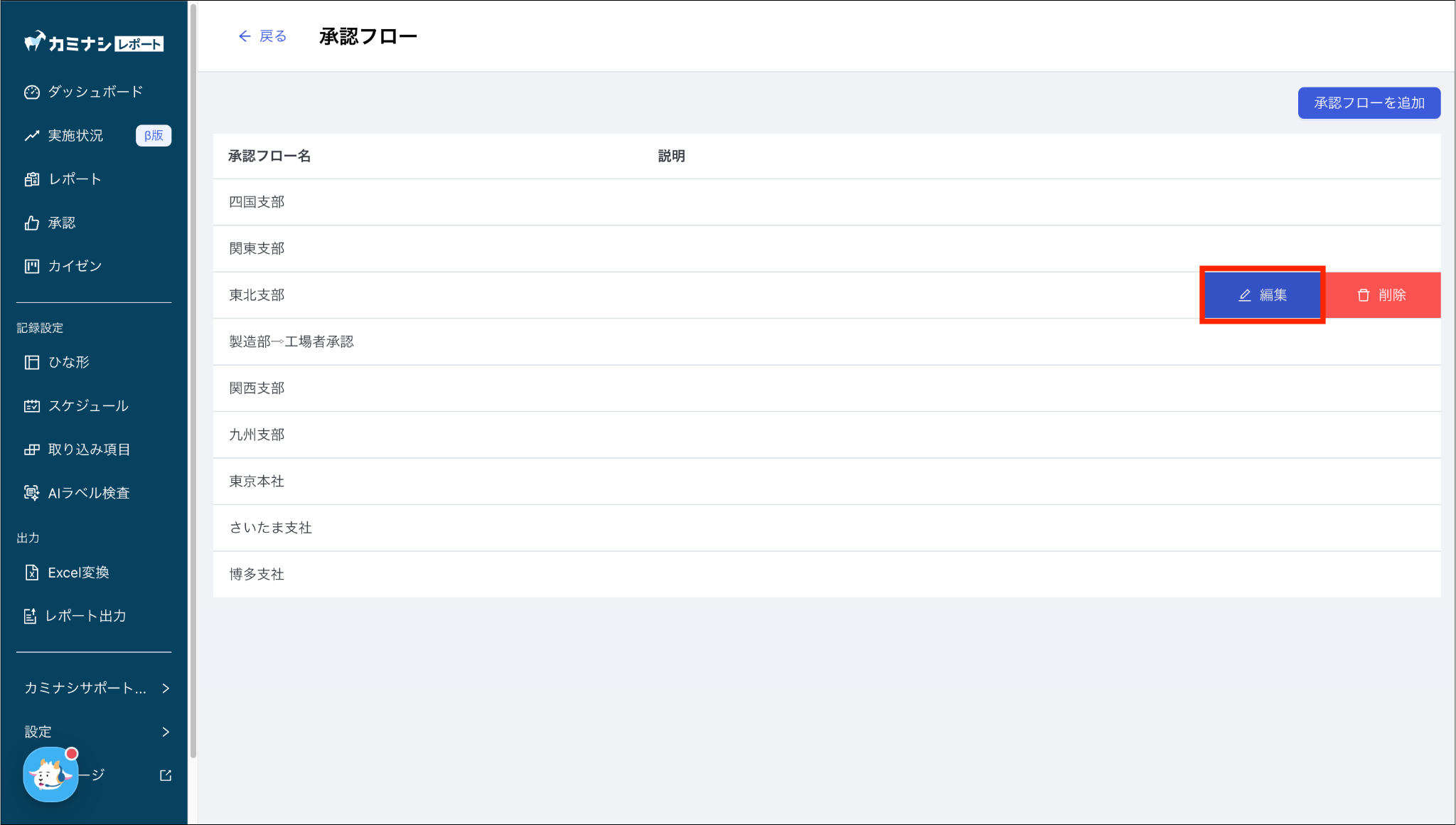 1. カミナシレポート 管理画面にログインする2.「承認」を開き、「承認フロー設定」を押す3. 編集したい承認フローの「編集」を押す4. 内容を編集し、「保存」を押すよくある質問は、こちらからご確認ください。