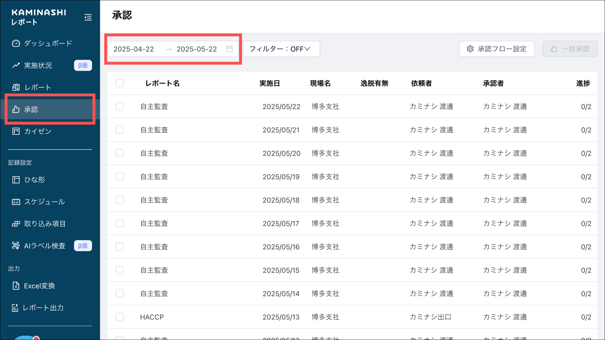 ログイン中のユーザーの承認対象レポートが初期状態で直近1ヶ月分表示されます。