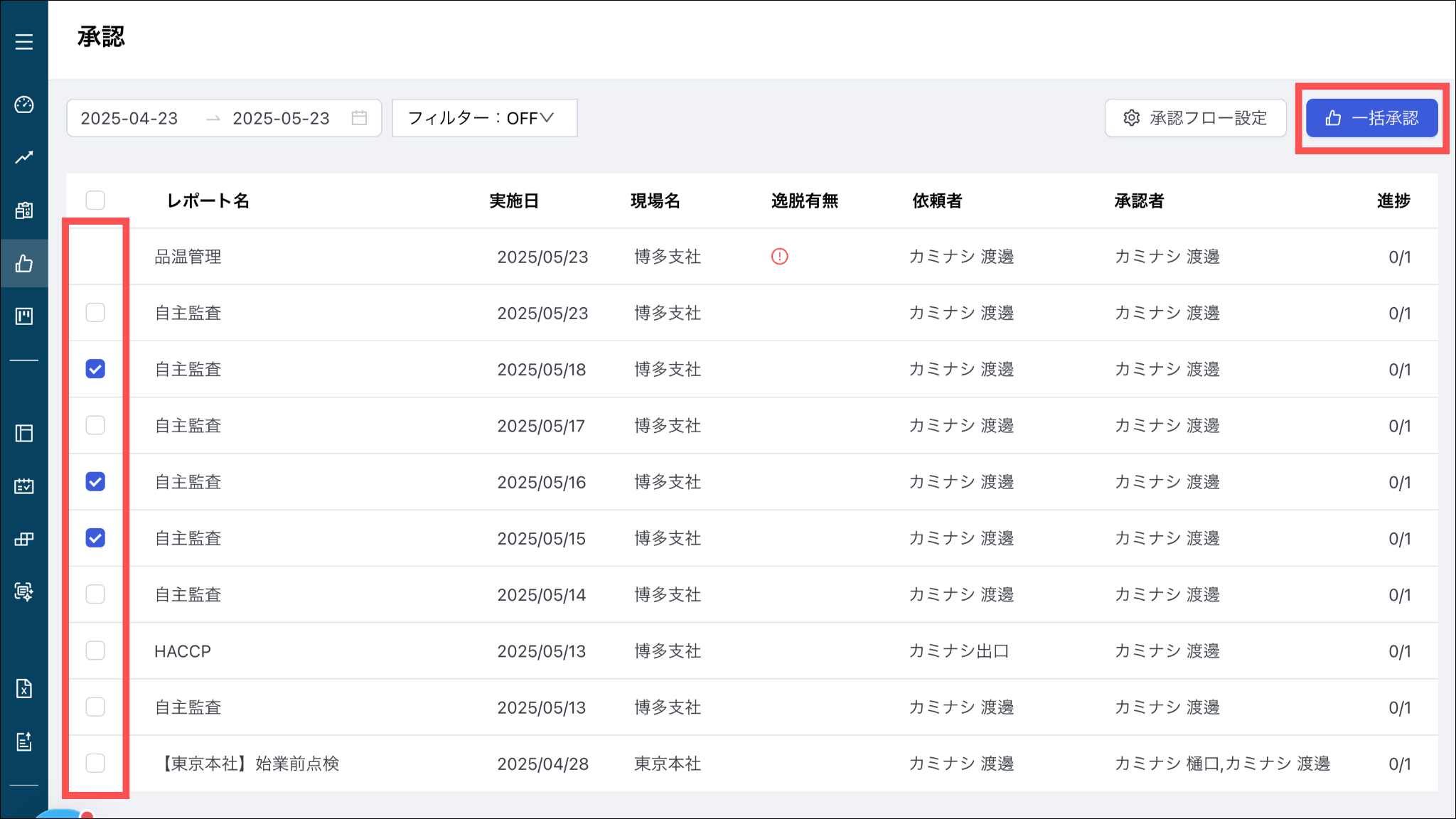 逸脱項目があるレポートはチェックボックスが表示されず、一括承認できません。