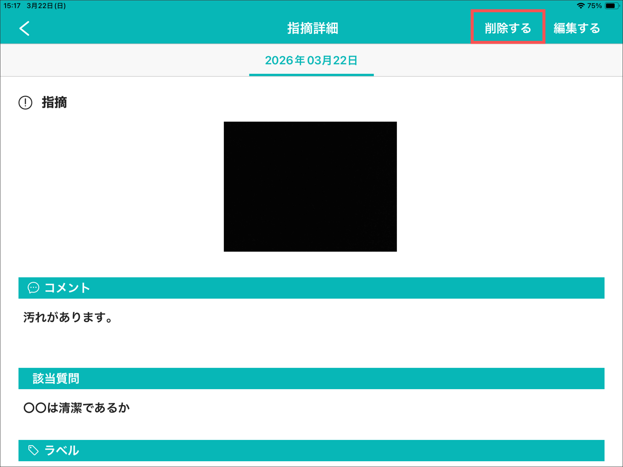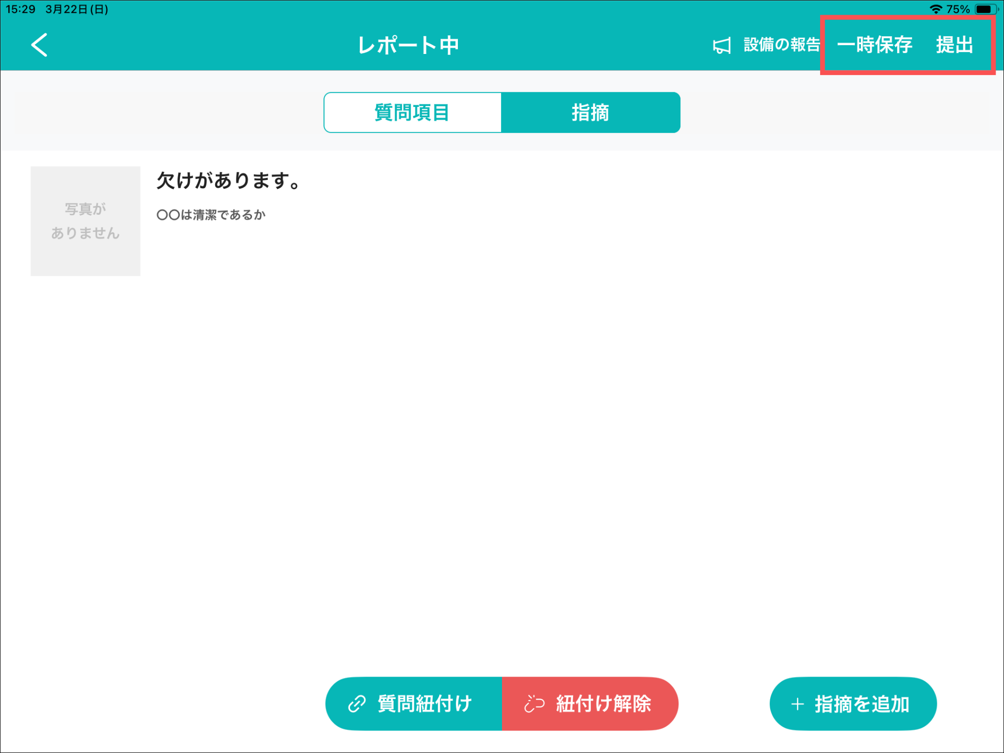 1.記録アプリ(iOS/iPadOS)にログインする2.カイゼンのレポートを記録再開するレポートの記録再開方法については、「記録アプリ(iOS/iPadOS)にて、記録中のレポートを再開する」をご参照ください。3.「指摘」を開き、削除する指摘の赤枠で囲われた箇所を押す4.「削除する」を押す5.「一時保存」または「完了」を押すよくある質問は、こちらからご確認ください。