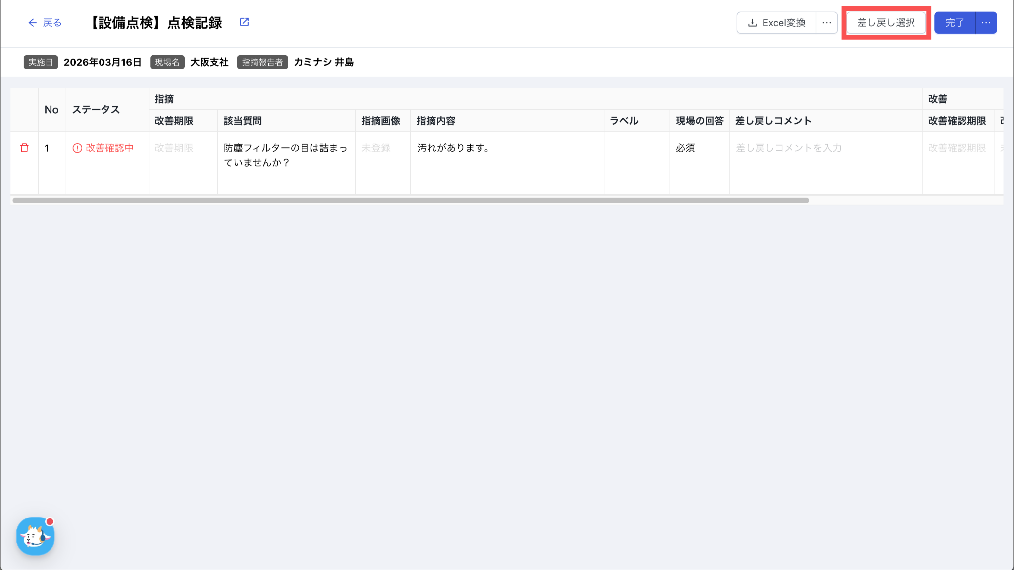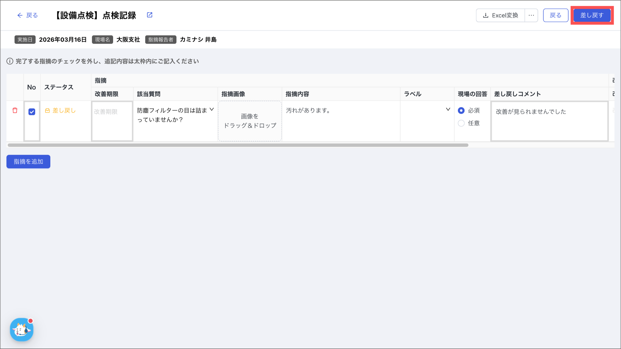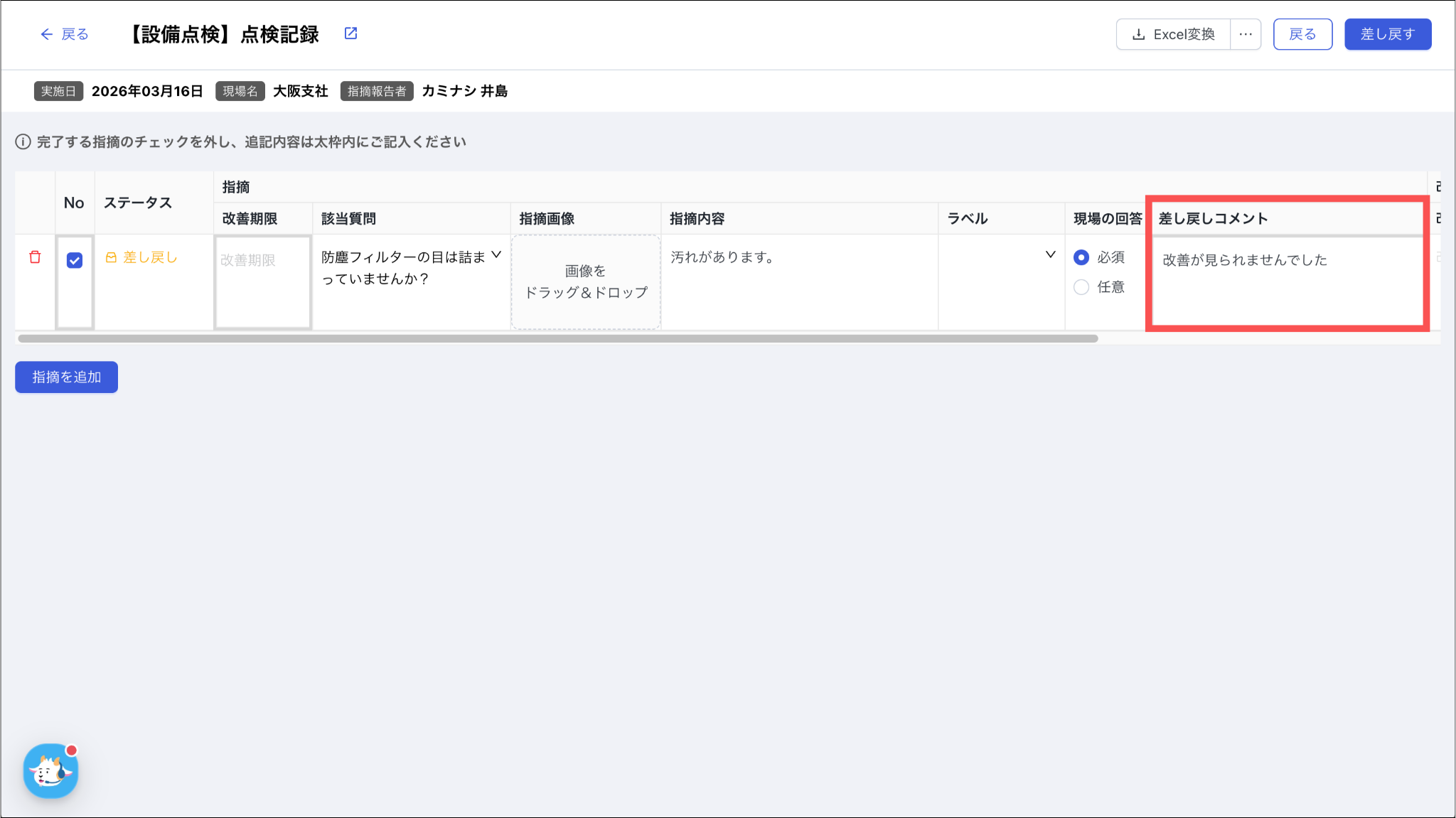 被監査者の入力した改善内容に不備があれば、差し戻しを行います。