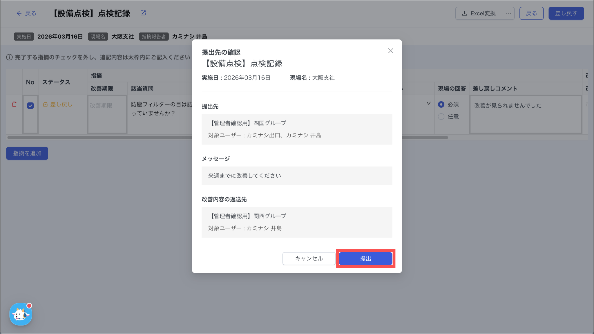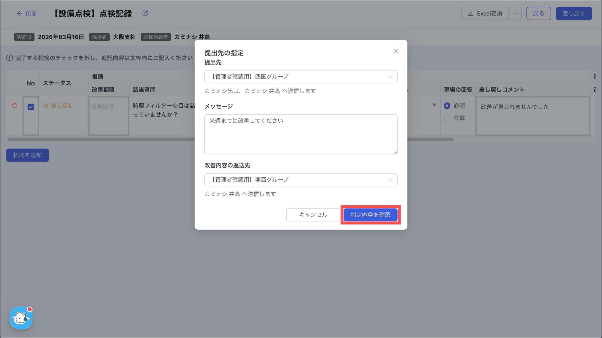 また、監査者が指摘を提出する際、「改善内容の返送先」として指定した「ユーザーグループ」にログイン中のユーザーが含まれていないと、改善内容を完了または、差し戻しすることはできません。