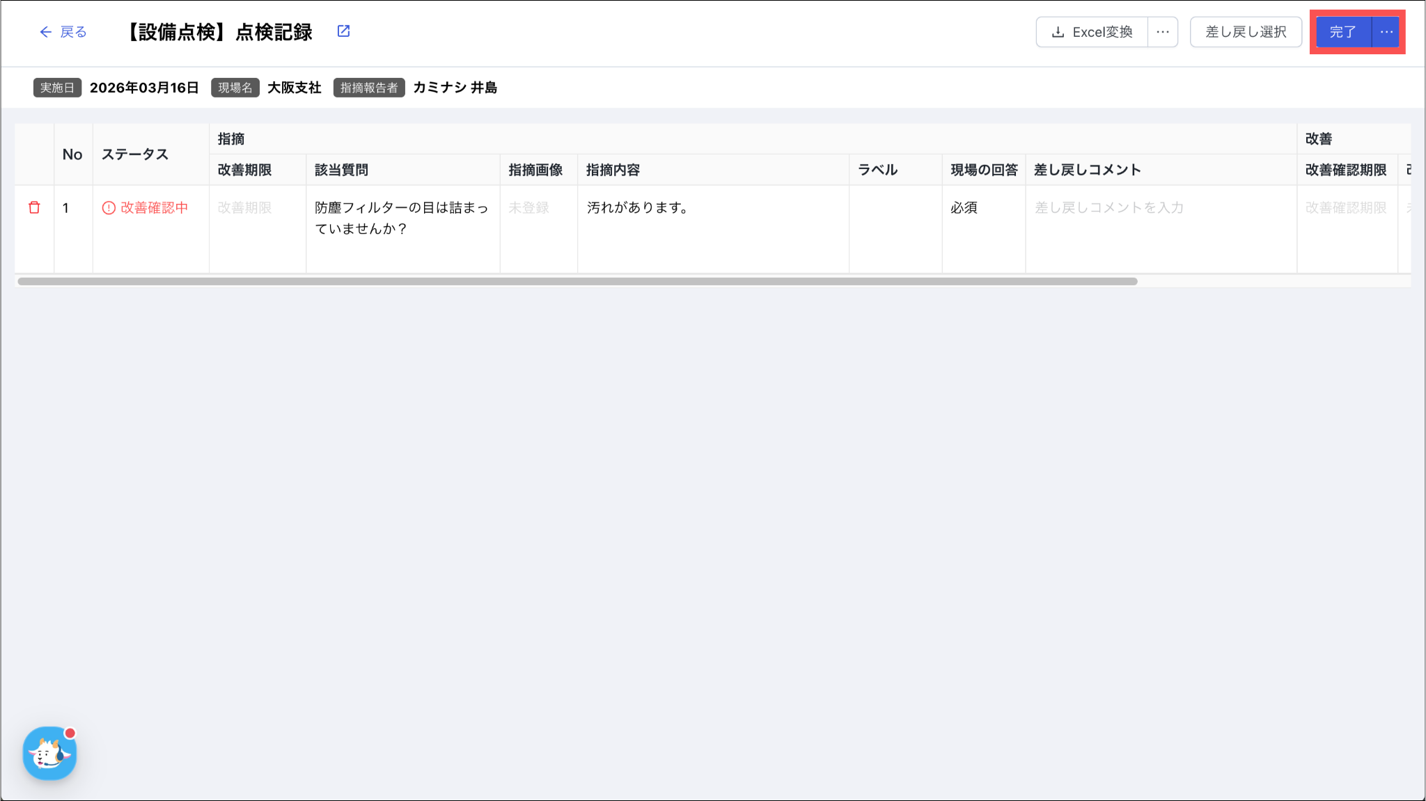 被監査者の入力した改善内容に不備がなければ、指摘を完了にします。