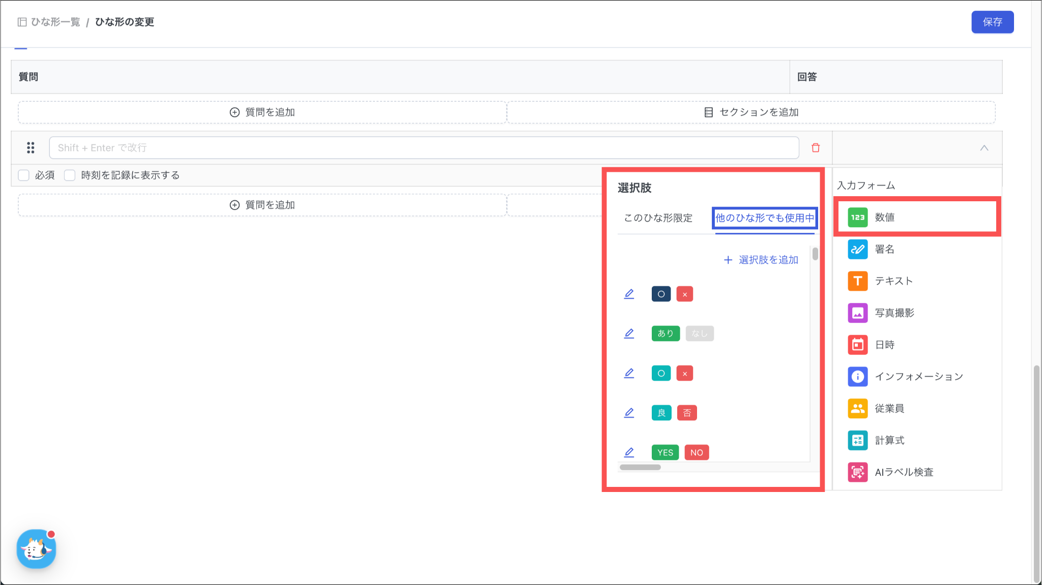 また、選択肢の内容(「◯・✕」を「あり・なし」に変えるなど)も変更できません。