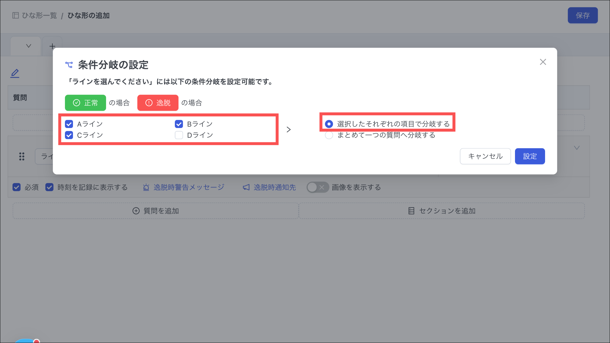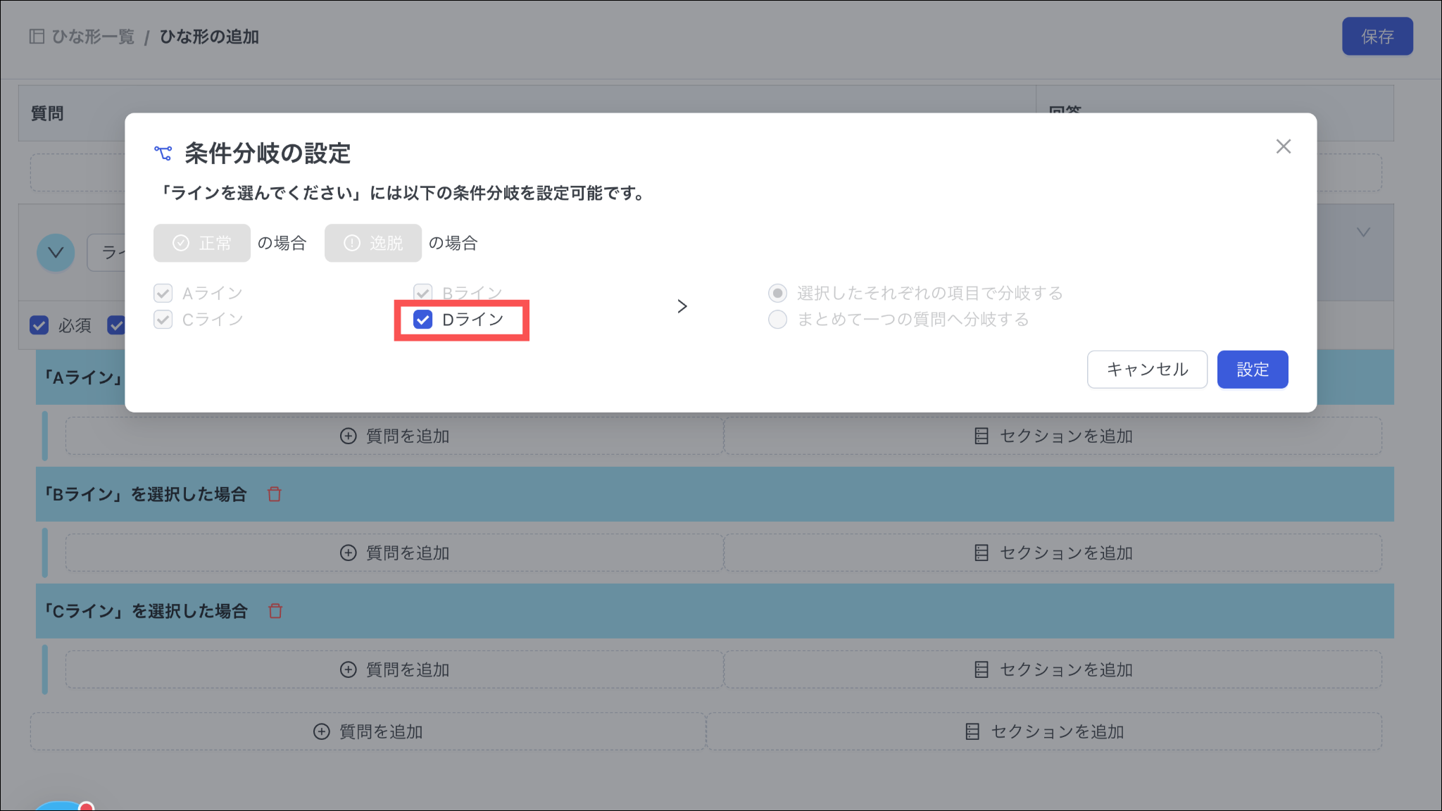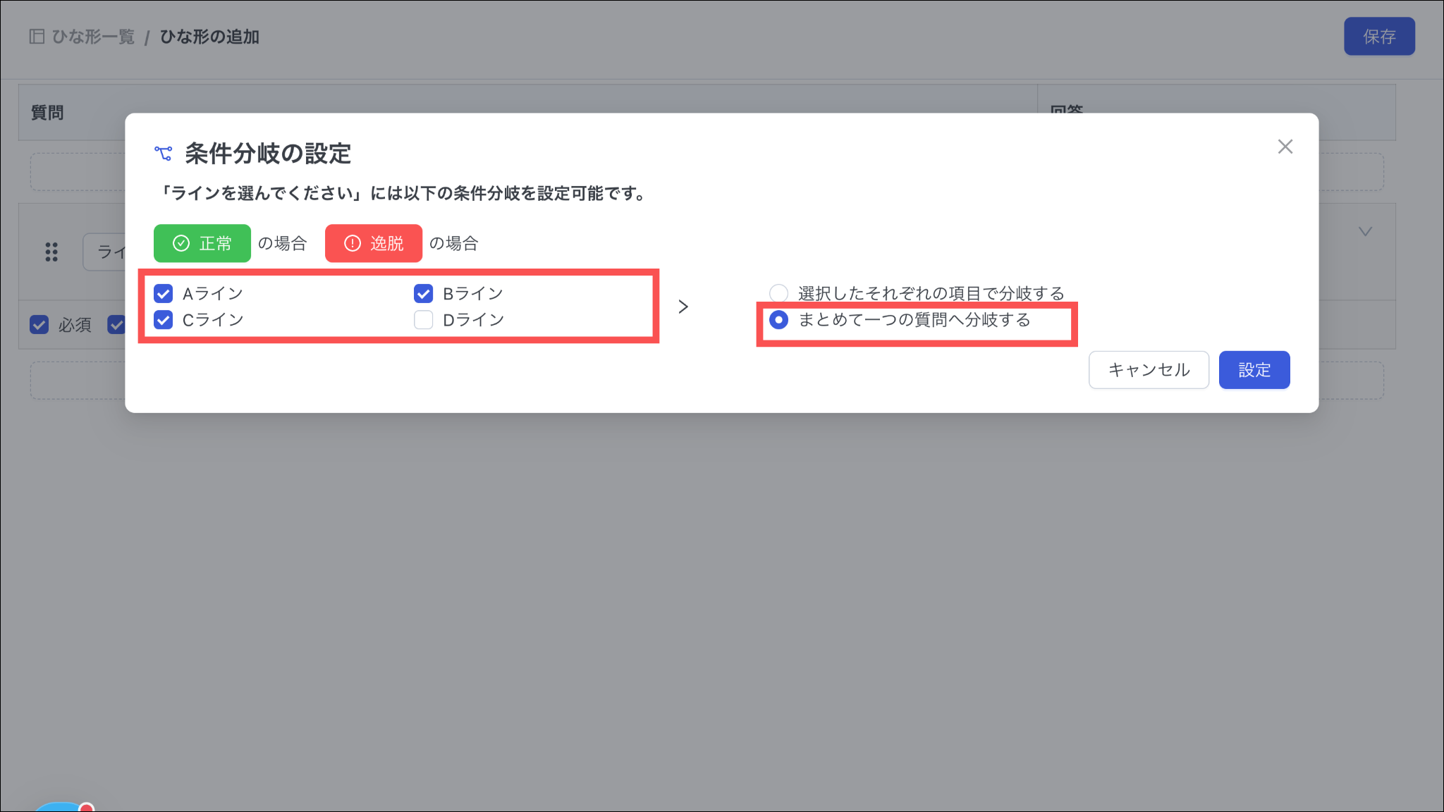 「選択したそれぞれの項目で分岐する」と「まとめて一つの質問へ分岐する」のいずれかを選択します。