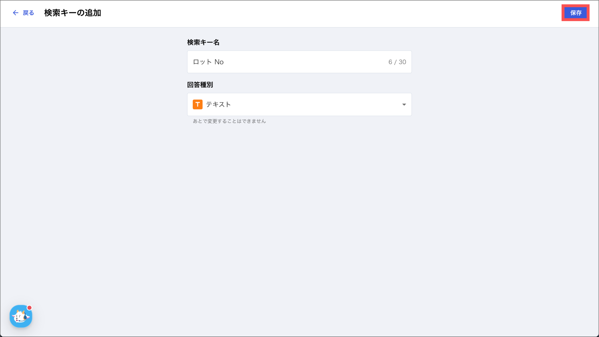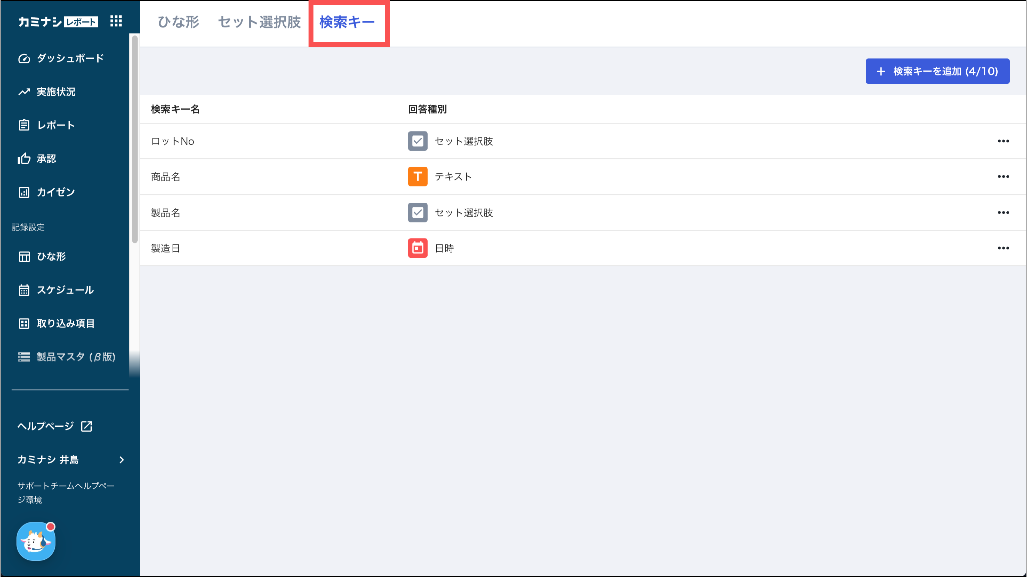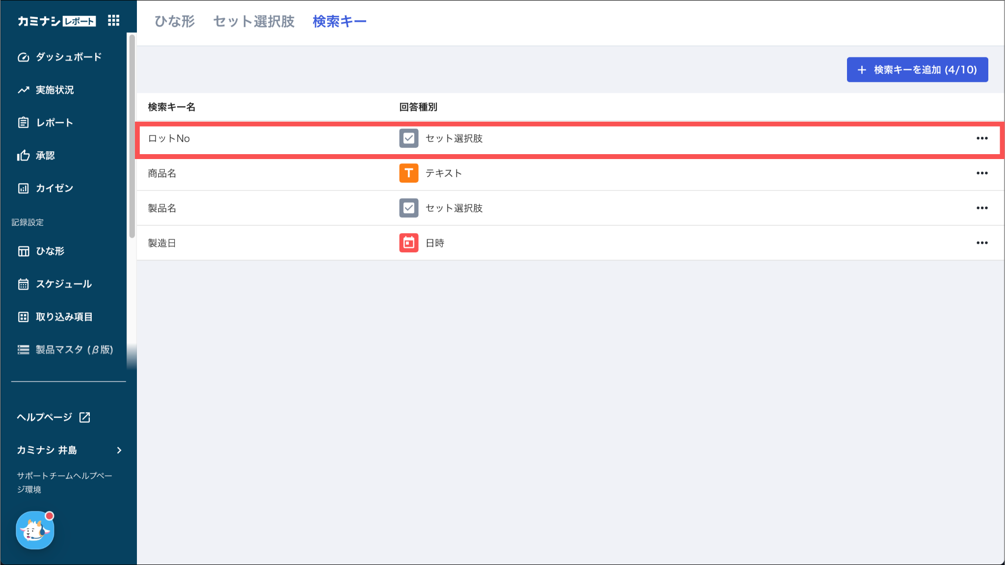 1.カミナシレポート 管理画面にログインする2.「ひな形」を開き、「検索キー」を押す3.編集する検索キーを押す4.「検索キー名」を編集する回答種別を変更することはできません。5.「保存」を押すよくある質問は、こちらからご確認ください。
