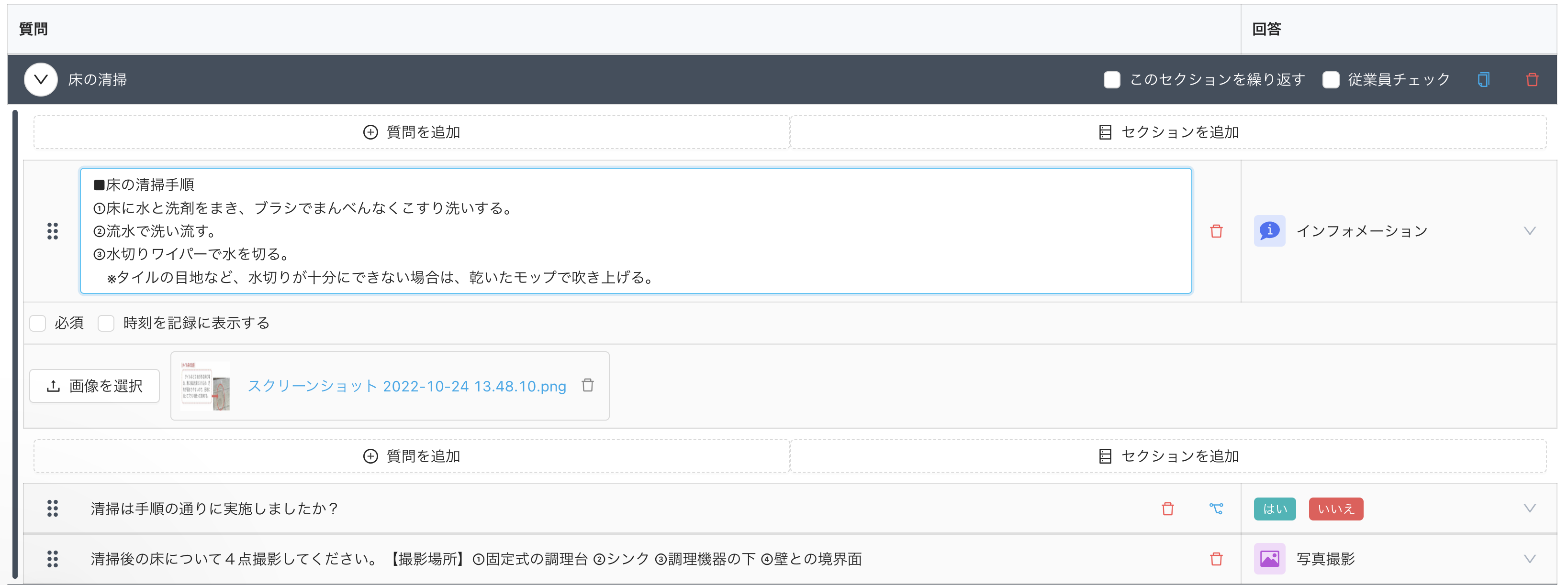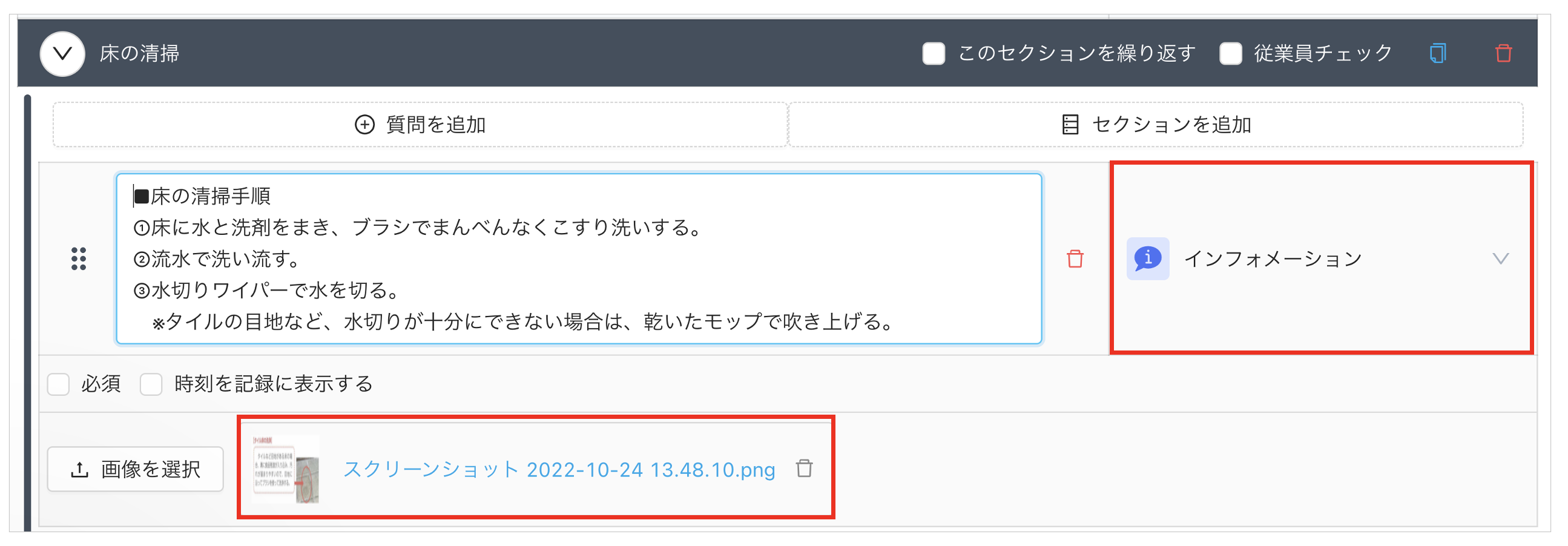 質問ではなく、伝えたいことを「テキスト」と「画像」で表示するのが「インフォメーション」です。初めてこの清掃をする人でも、間違いなく作業ができるようにしましょう。