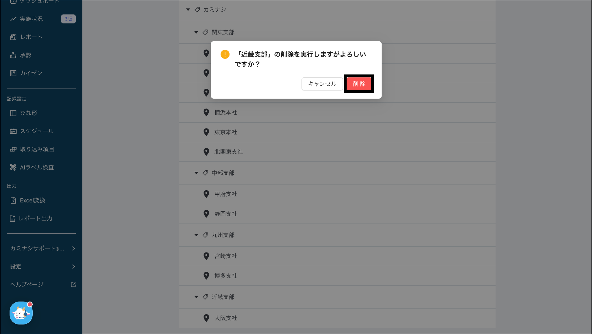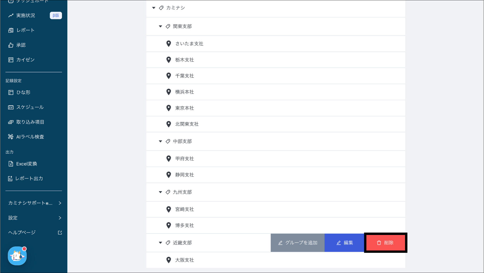 1.カミナシレポート 管理画面にログインする2.「設定」を押し、「現場グループ」を選択する3.削除したい現場グループの「削除」を押す4.「削除」を押す一度削除された現場グループは復元できませんのでご注意ください。よくある質問は、こちらからご確認ください。