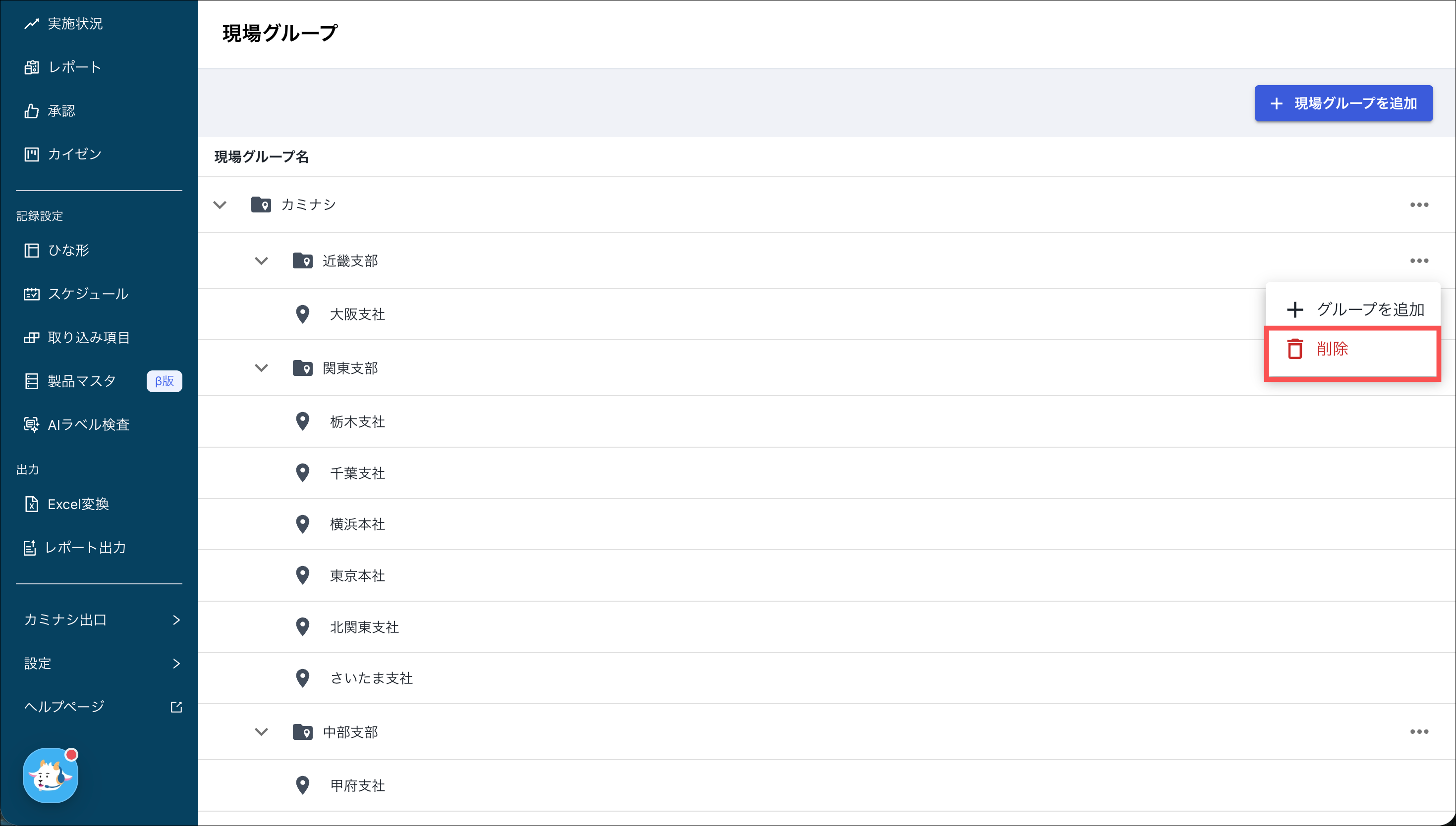 1.カミナシレポート 管理画面にログインする2.「設定」を押し、「現場グループ」を選択する3.削除する現場グループの「⋯」より「削除」を押す4.「削除」を押す一度削除された現場グループは復元できませんのでご注意ください。よくある質問は、こちらからご確認ください。