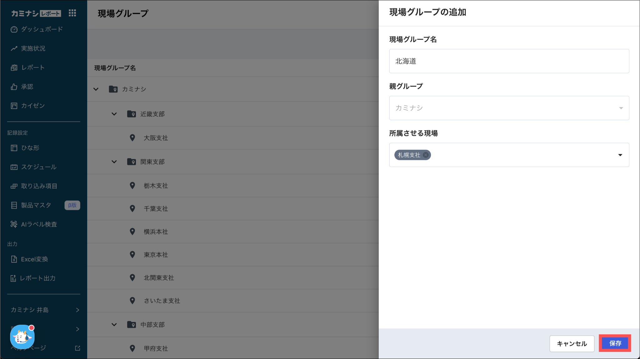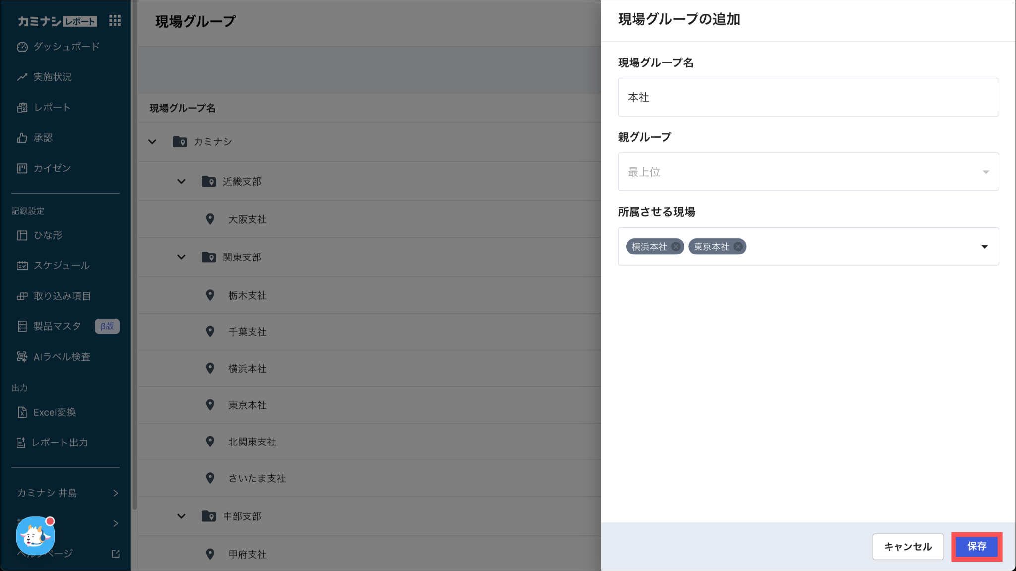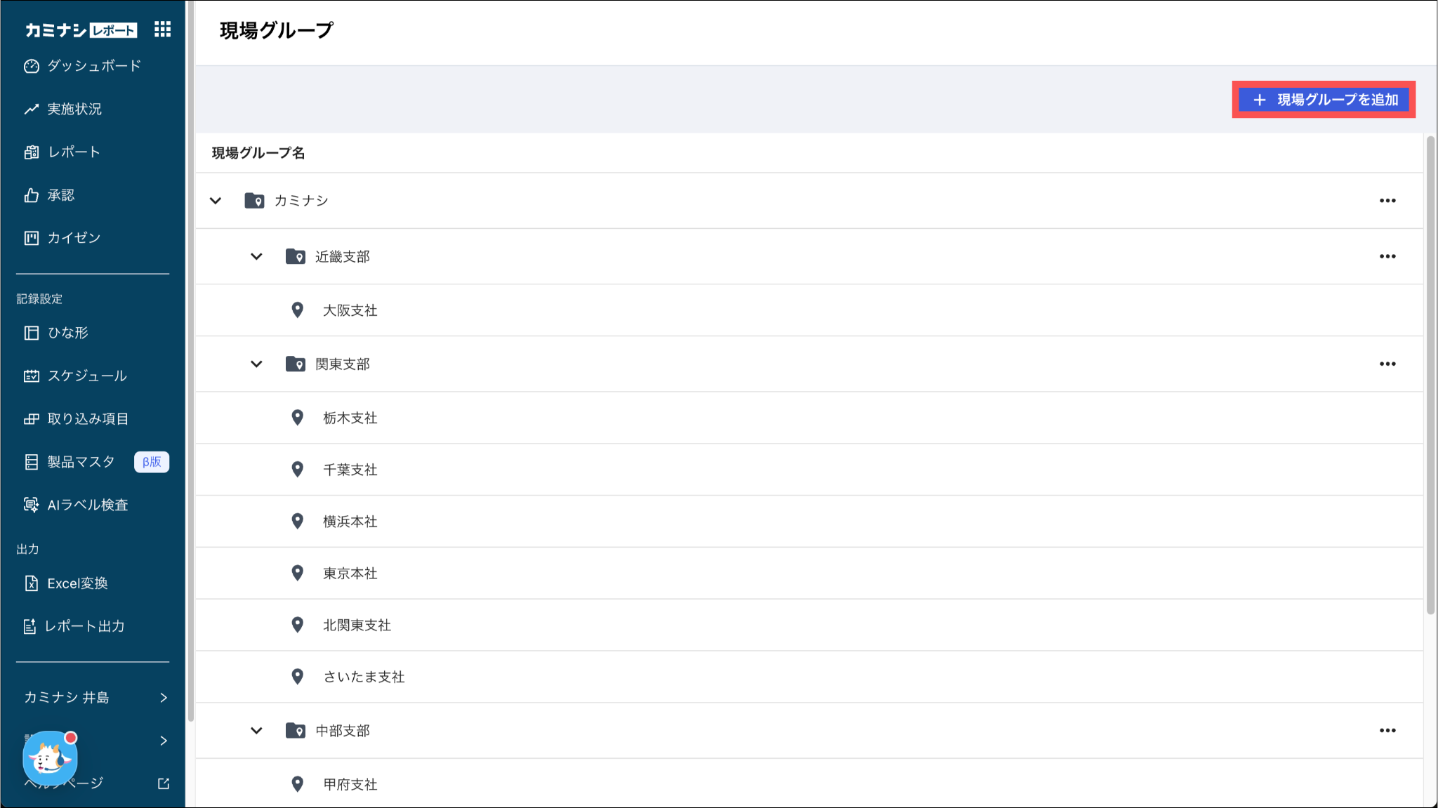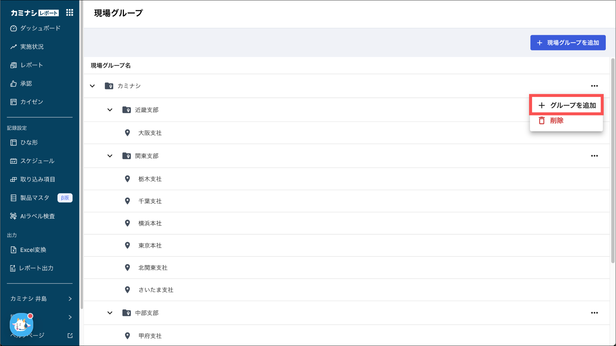 1.カミナシレポート 管理画面にログインする2.「設定」を押し、「現場グループ」を選択する3.最上位の現場グループを登録する新しく一番上の階層となる「最上位の現場グループ」を登録する手順をご紹介します。3-1.「+現場グループを追加」を押す3-2.現場グループ名と所属させる現場を設定し、「保存」を押す4.現場グループ配下に現場グループを登録するすでにある現場グループの下の階層に、別の現場グループを新しく登録する手順をご紹介します。4-1.複数階層作成したい現場グループの「⋯」を押す4-2.「+グループを追加」を押す4-3.現場グループ名と所属させる現場を設定し、「保存」を押すよくある質問は、こちらからご確認ください。