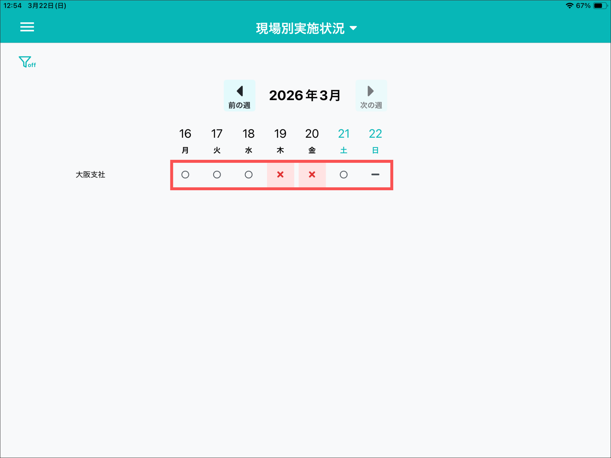 初期状態ではその週の実施状況が表示されます。