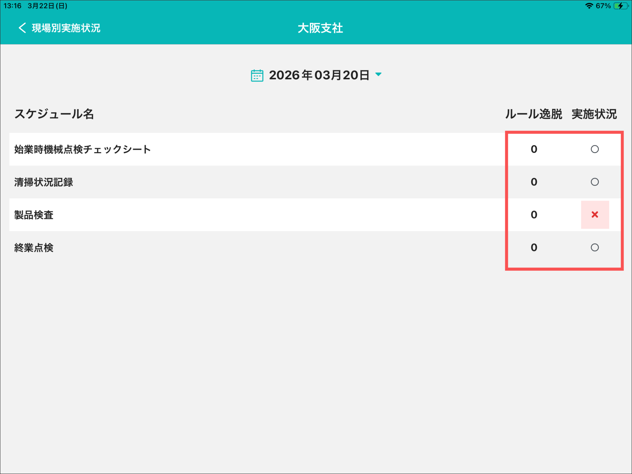 実施状況にあわせて記号(⭕️、❌️、➖)が表示されます。