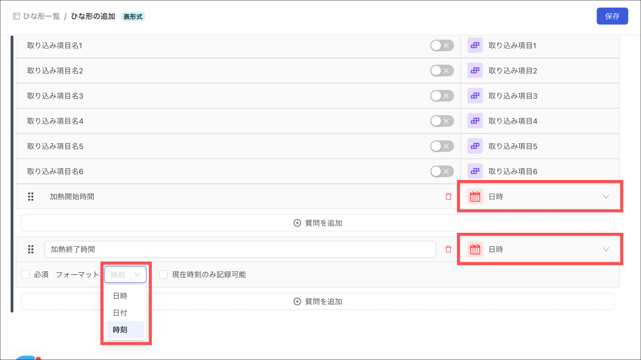 設定範囲は、「日時」のフォーマットが「時刻」の場合は23時間59分まで、