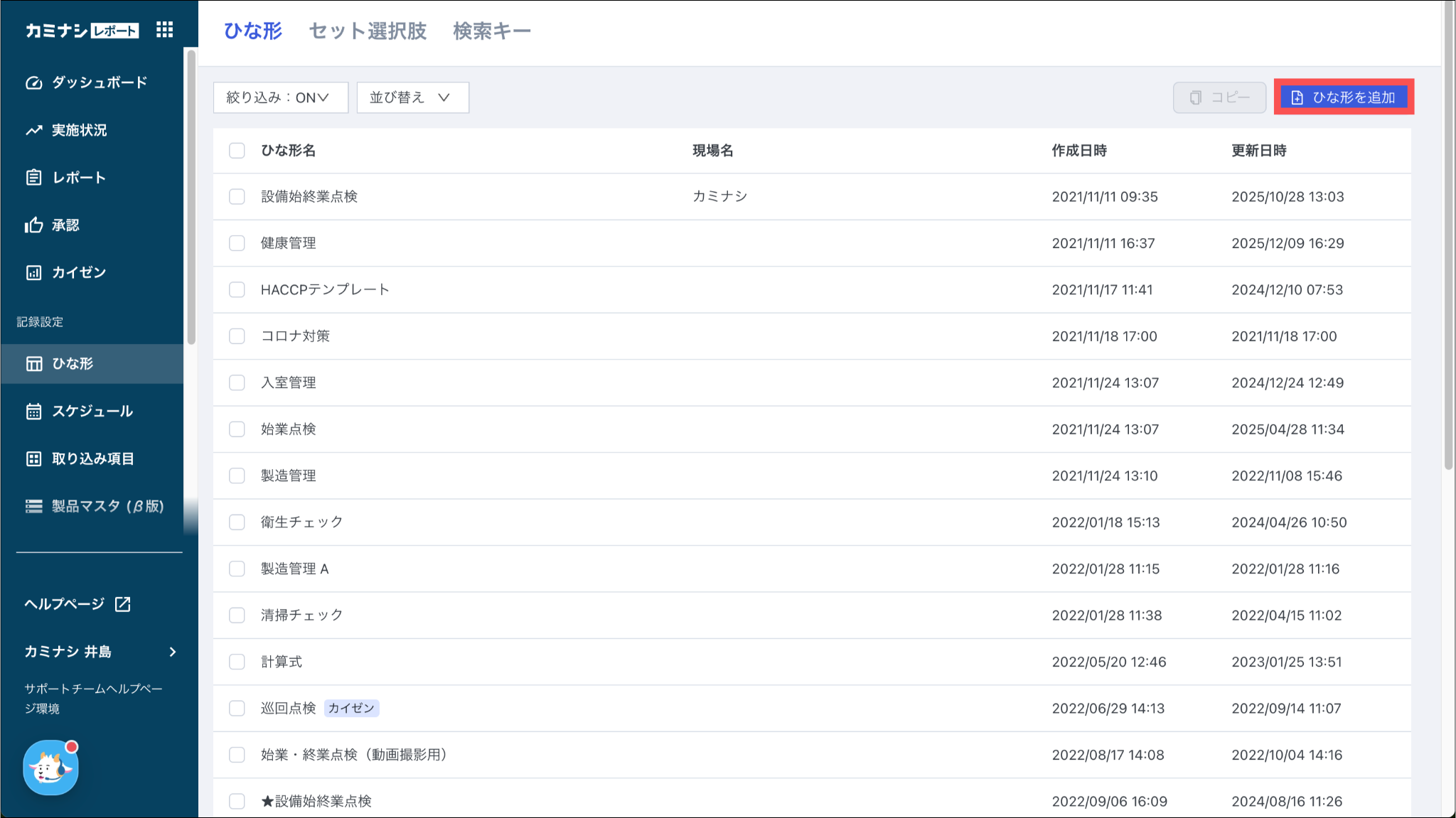 現場の設定を行うと、管理画面や記録アプリでは、ログイン中のユーザーが所属している現場のひな形のみが表示されるようになります。