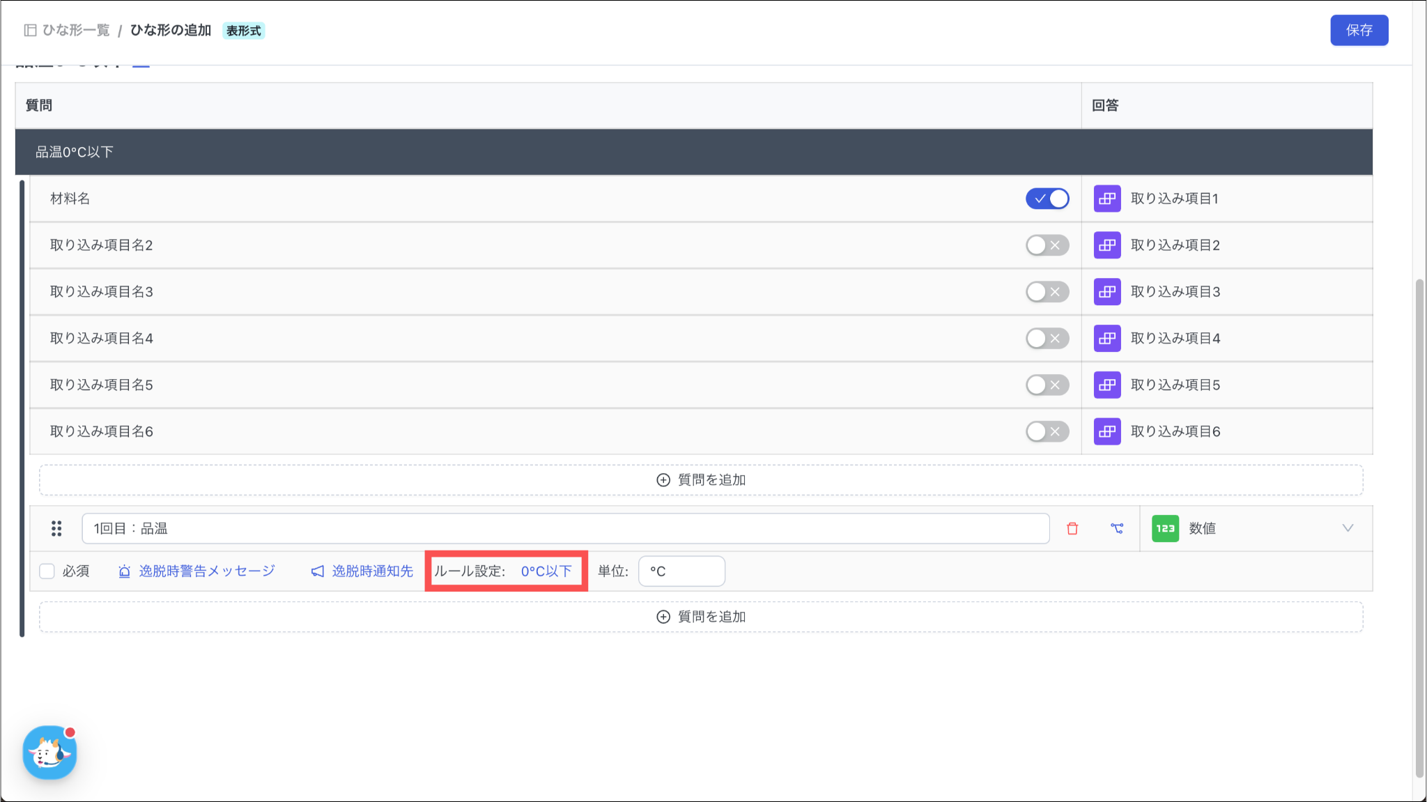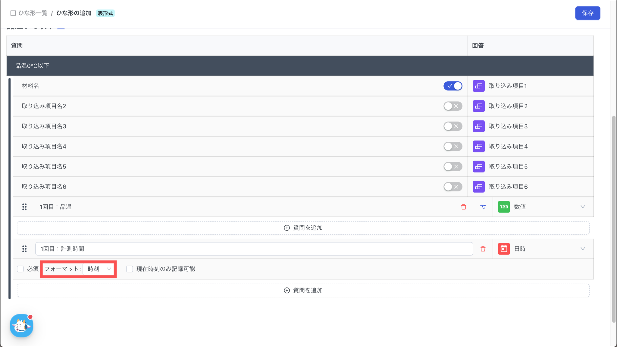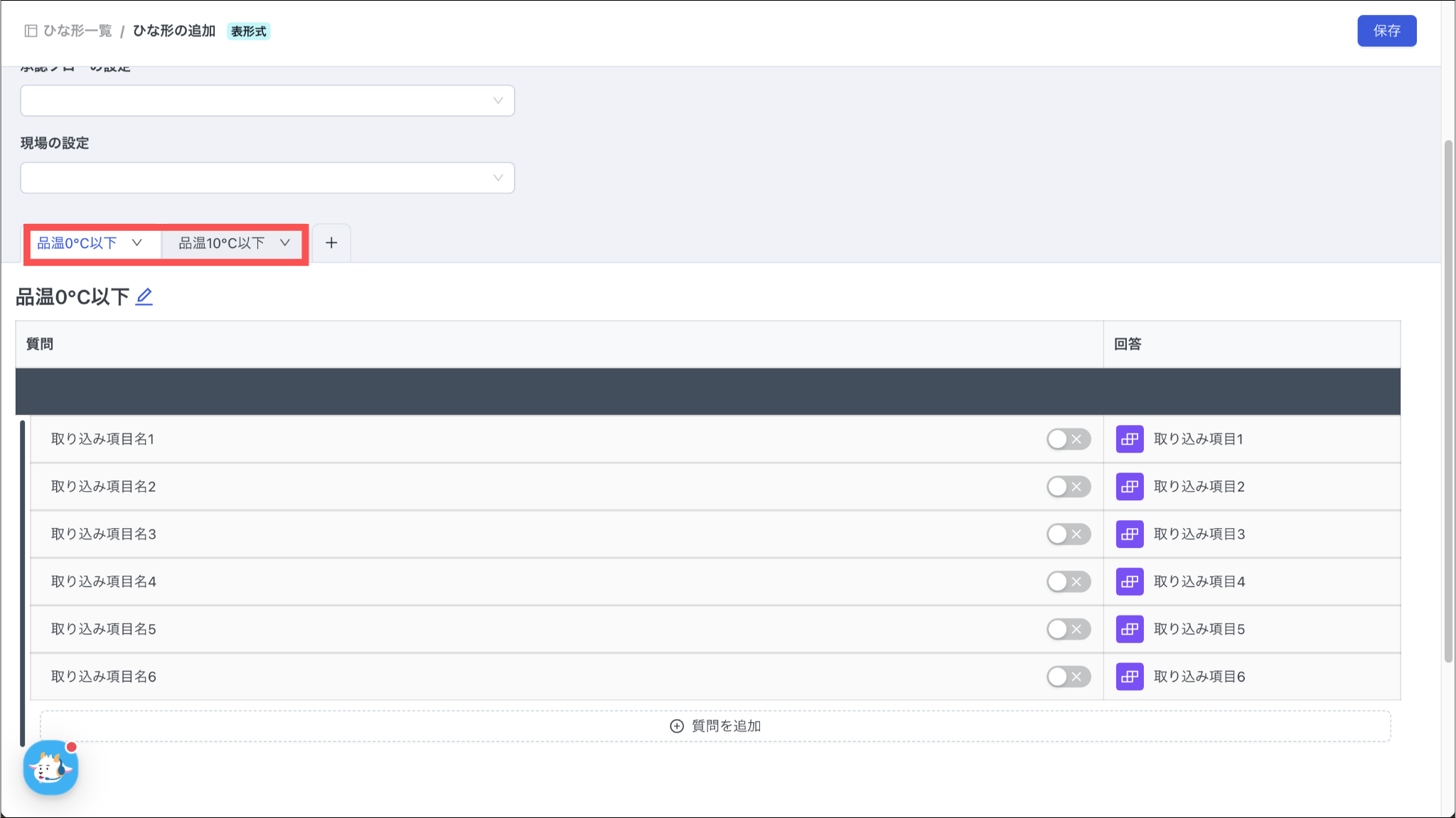 計測回数が複数回ある場合、その分質問を設定します。(1回目:品温、2回目:品温など)