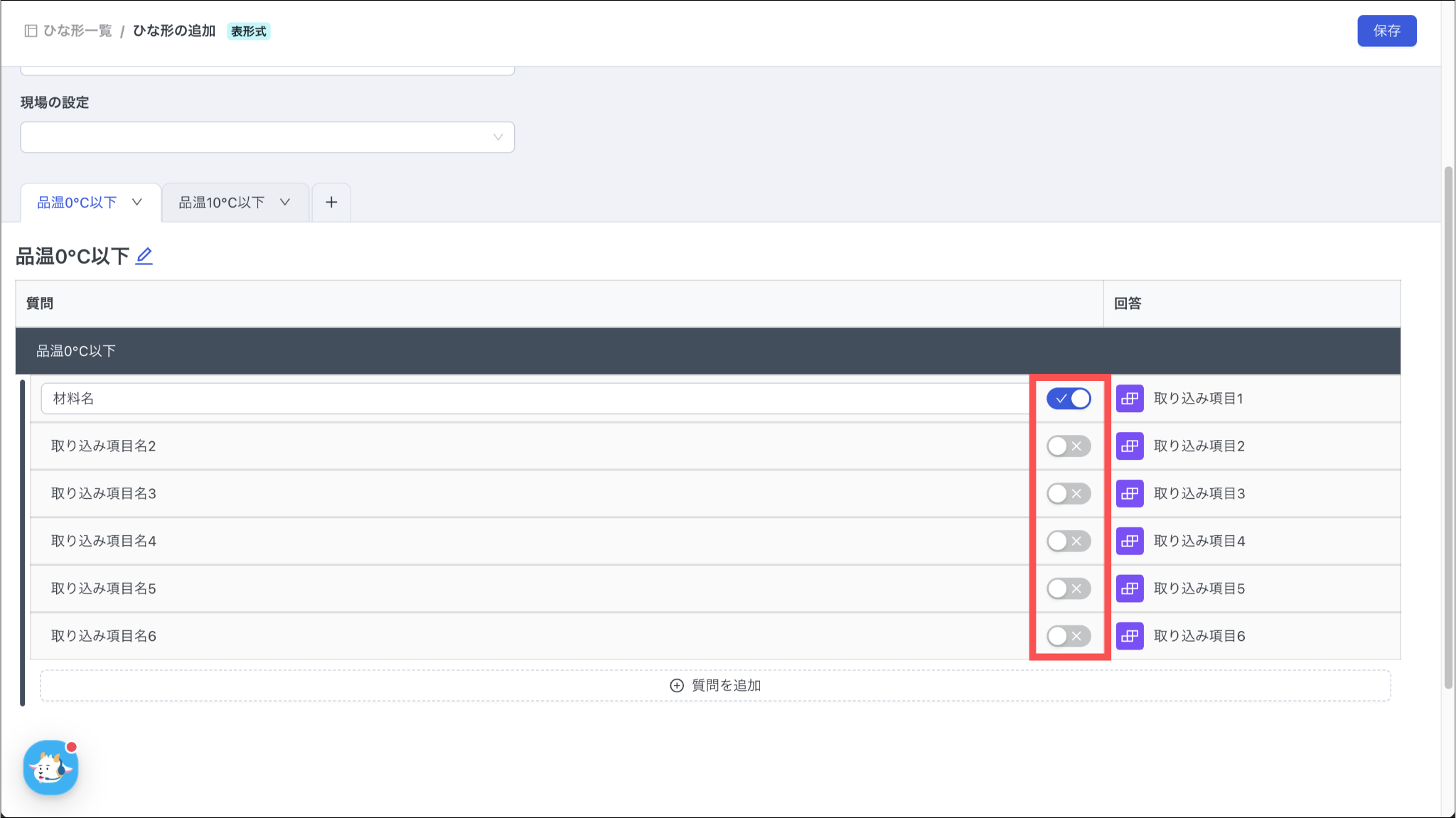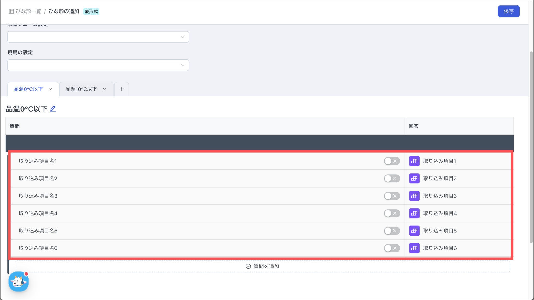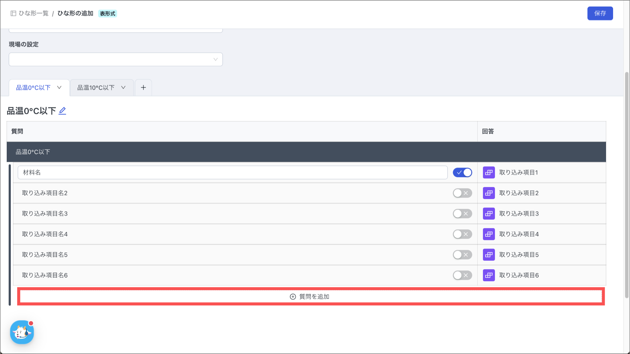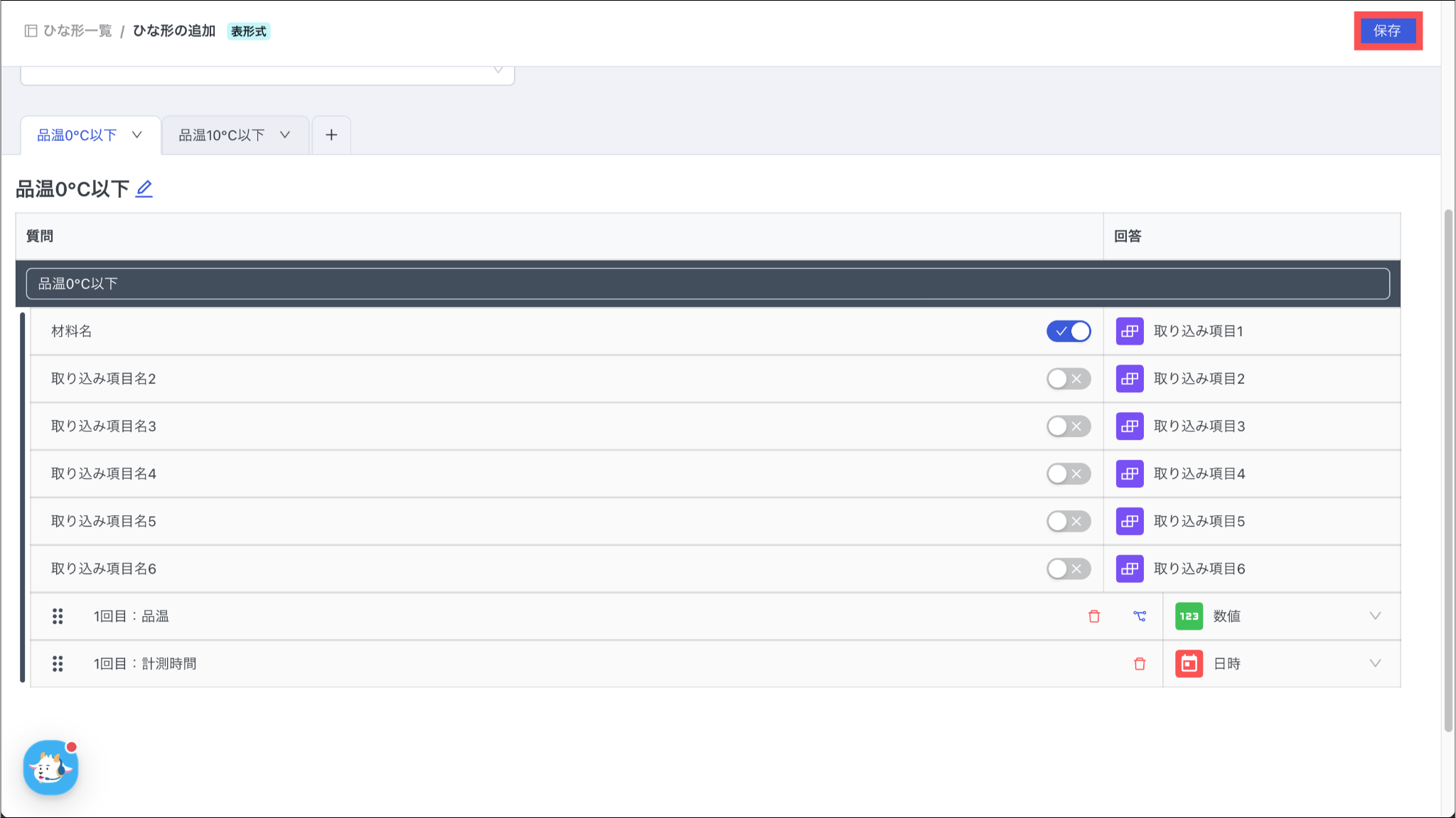 計測回数が複数回ある場合、その分質問を設定します。(1回目:品温、2回目:品温など)