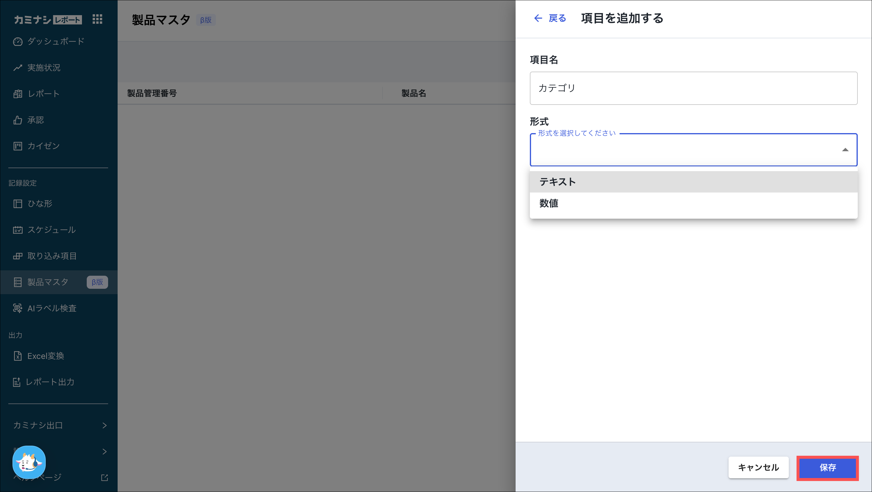 形式は、「テキスト」または「数値」から項目の特性に応じて指定します。