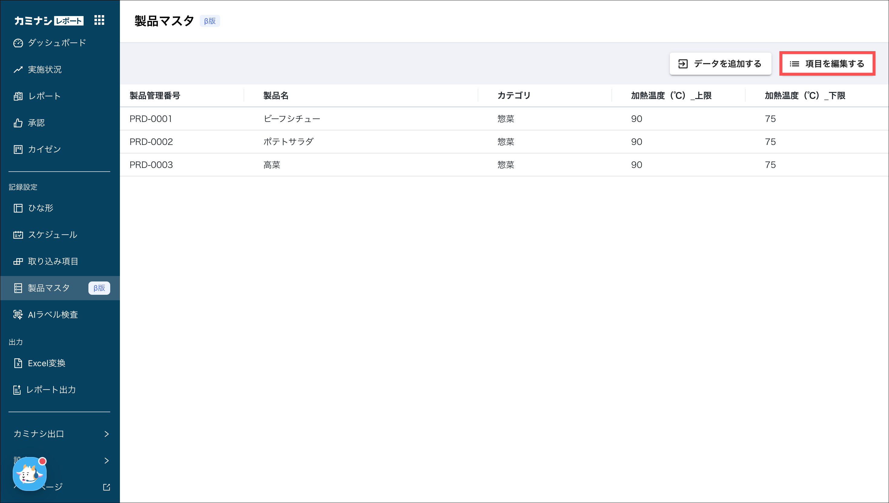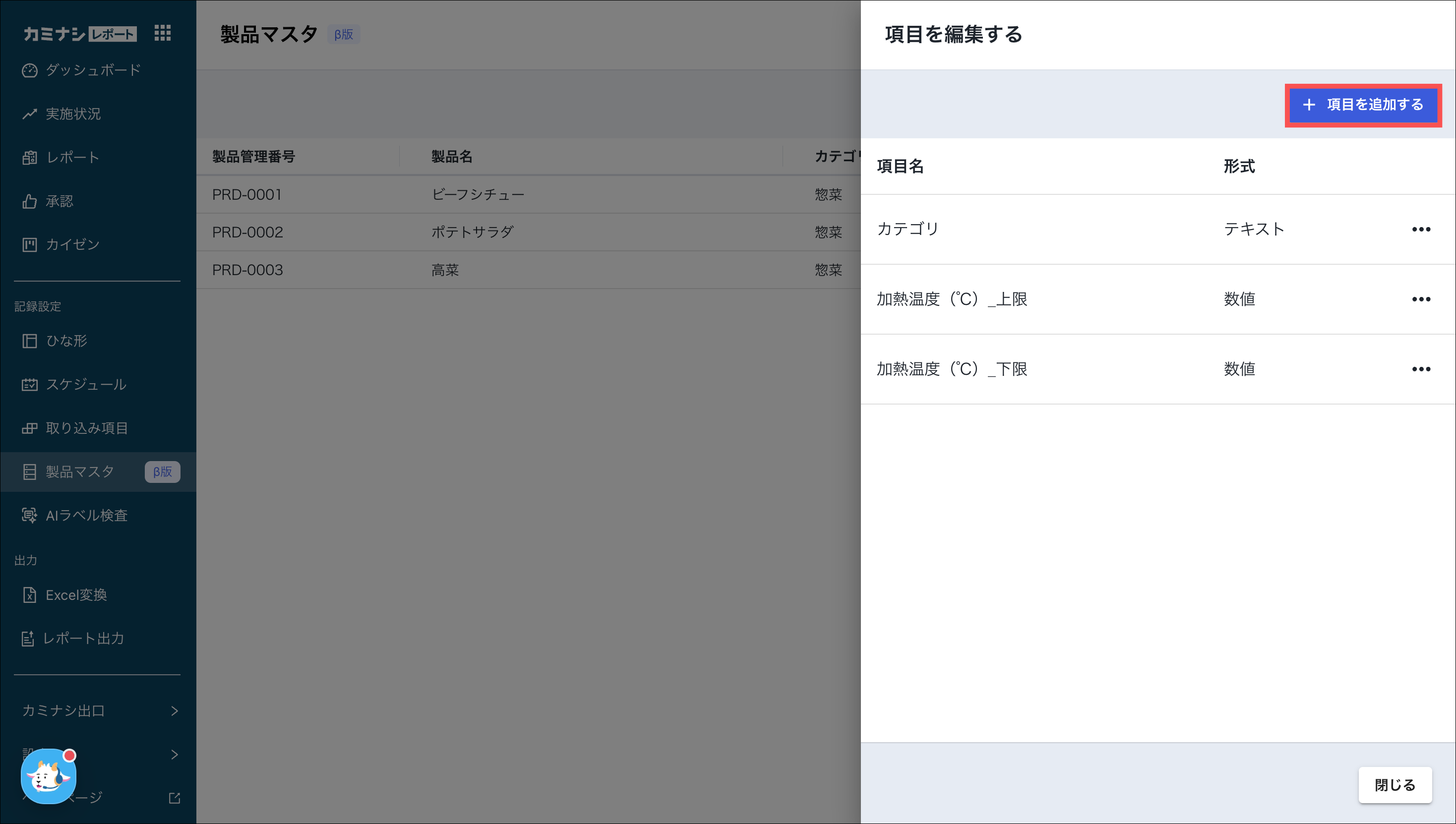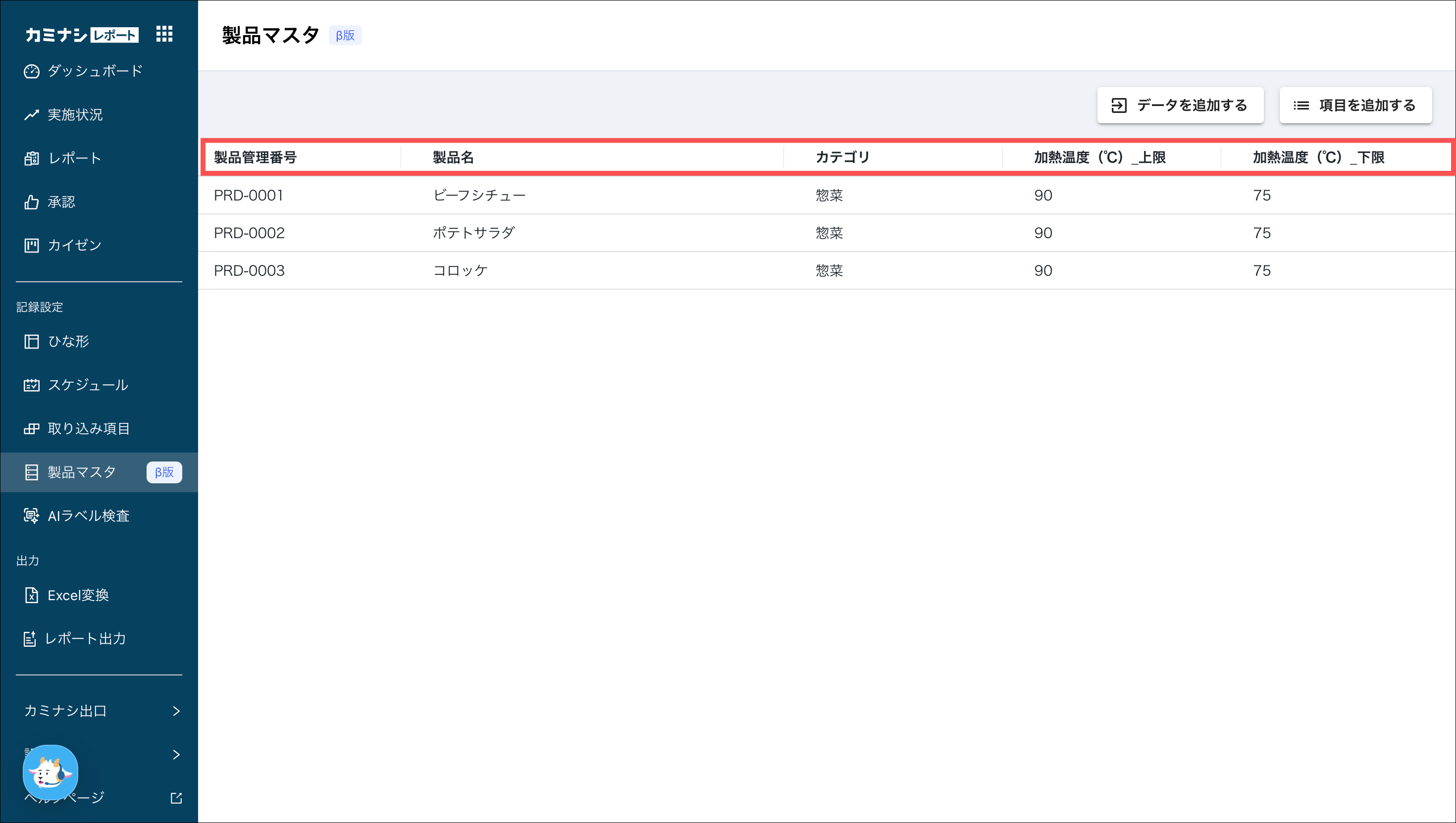 例:製品名/製品管理番号/カテゴリなど