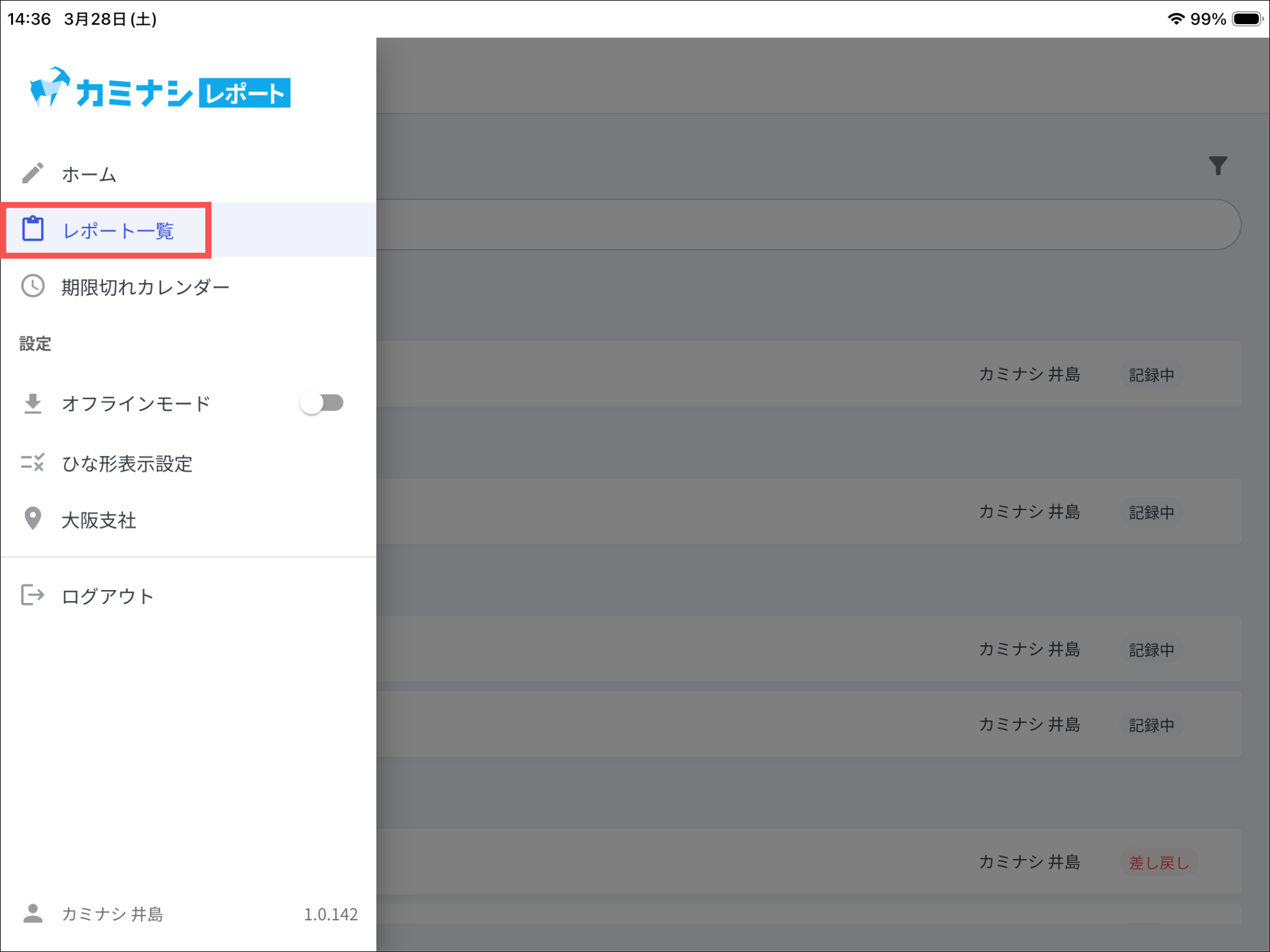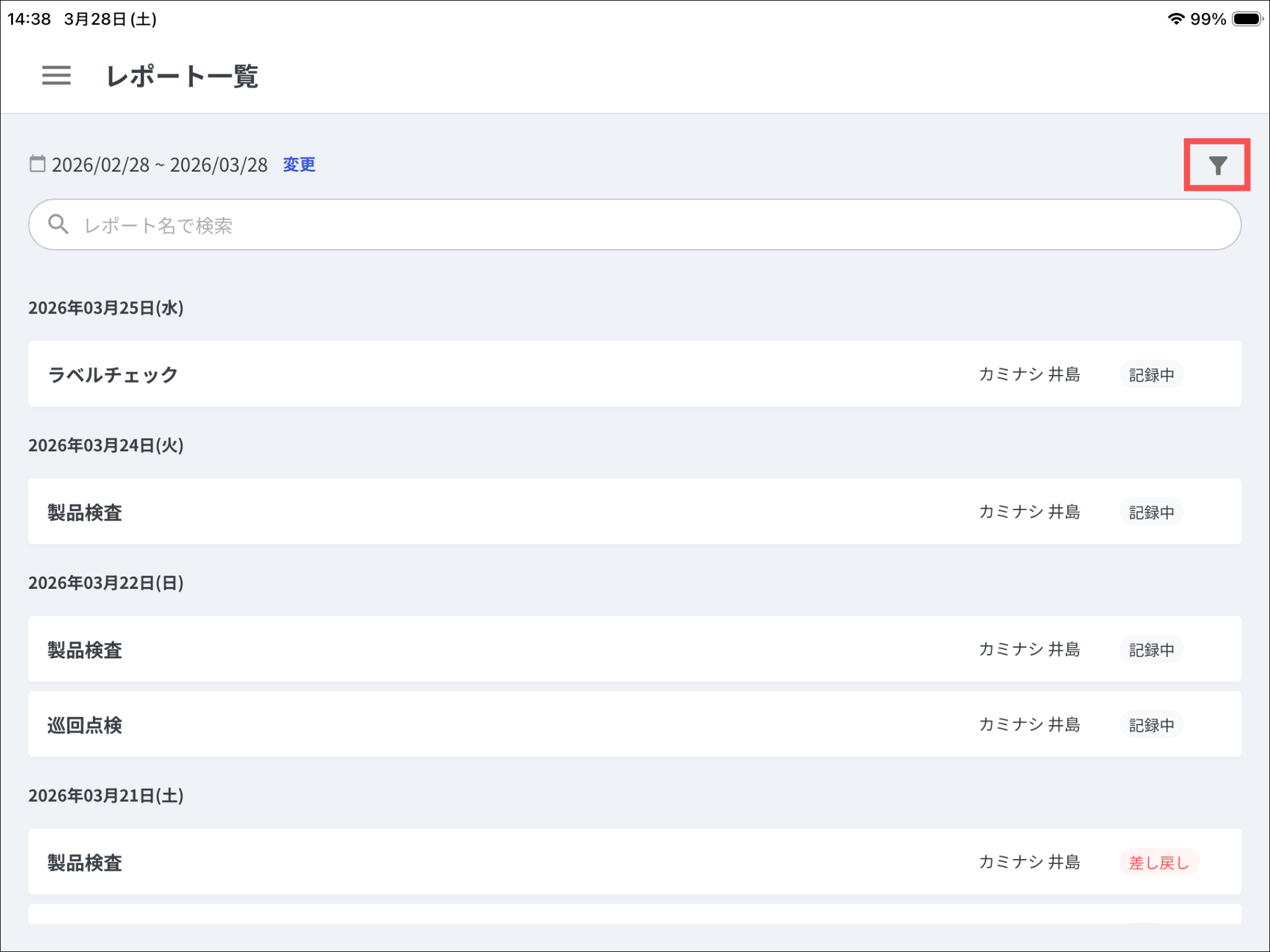 レポート一覧にはログイン中の現場で作成された全レポートと以下の項目が表示されます。