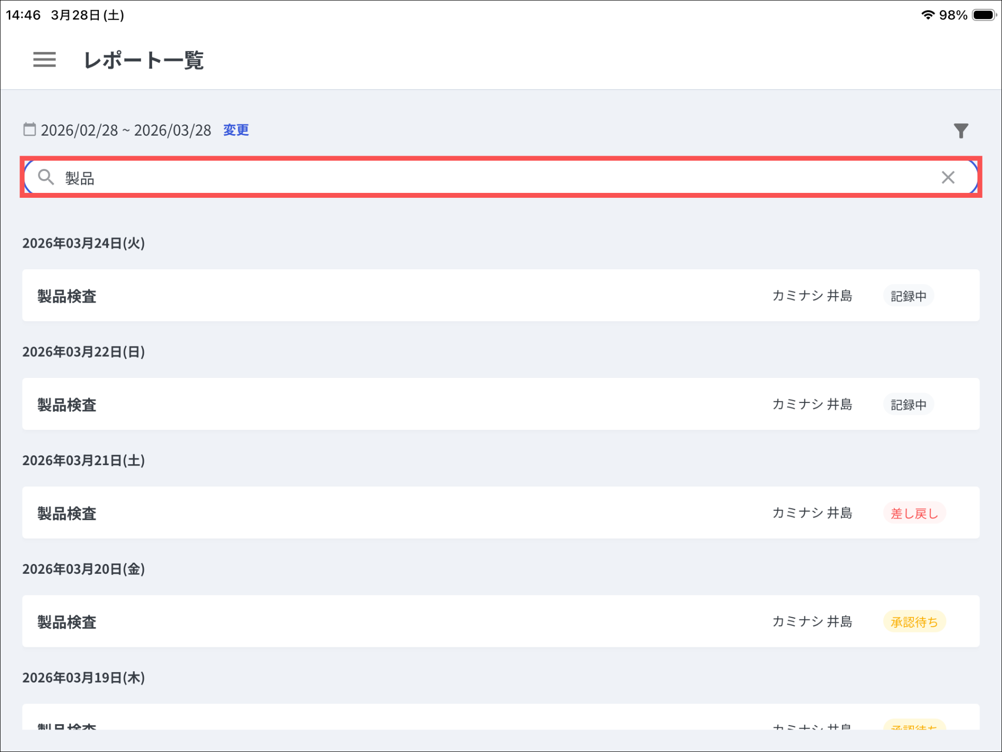 「記録中(一時保存)」「承認待ち」「差し戻し」「完了」の4つのうち、いまどのステータスかが表示されます。