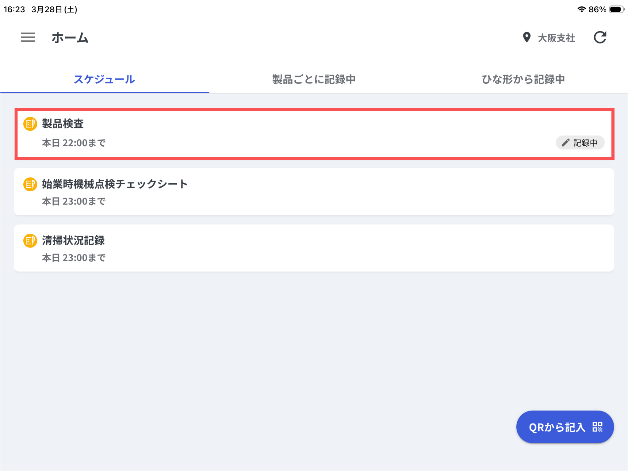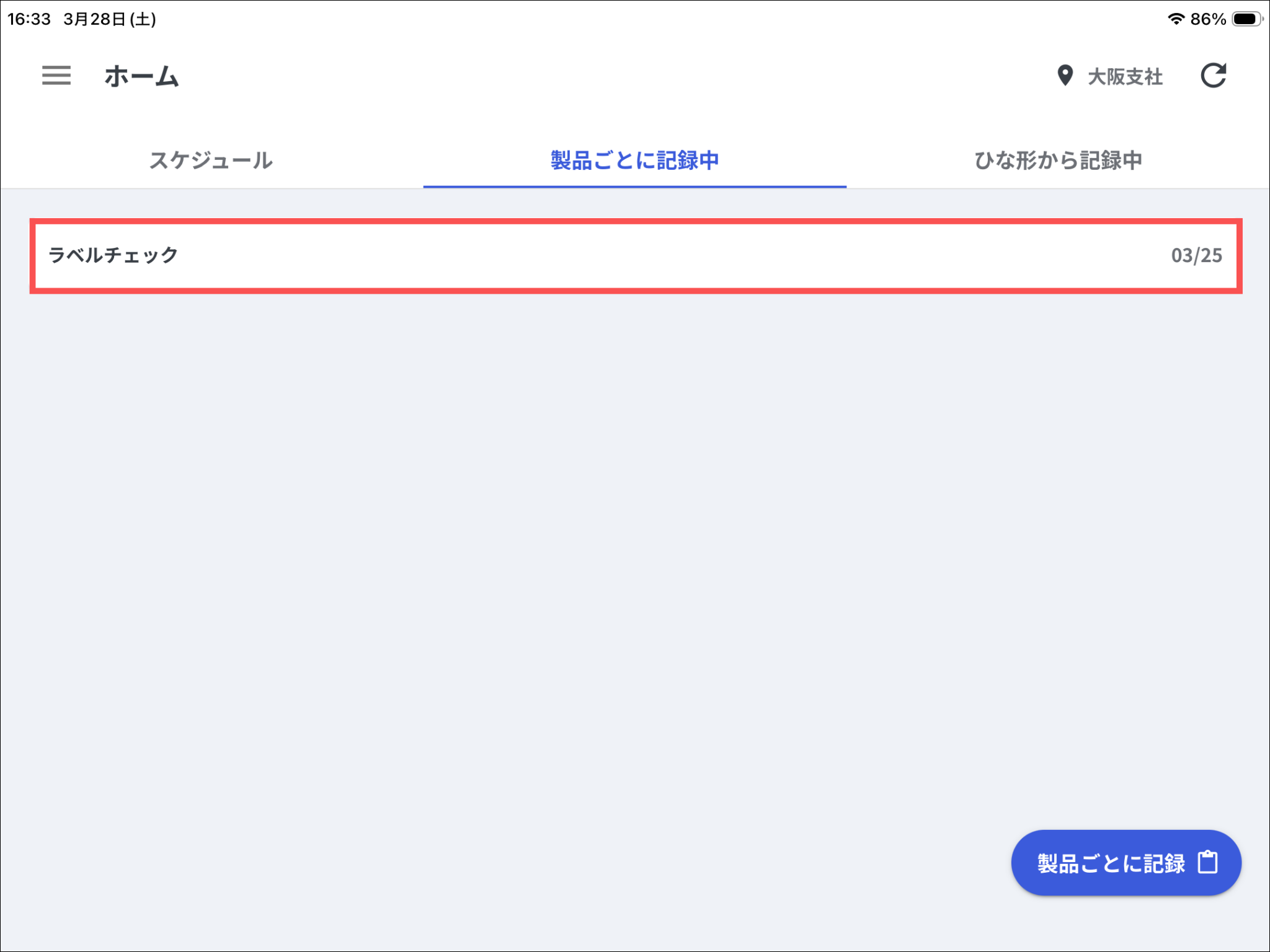 ホーム画面の「製品ごとに記録中」を開き、再開するレポートを押します。