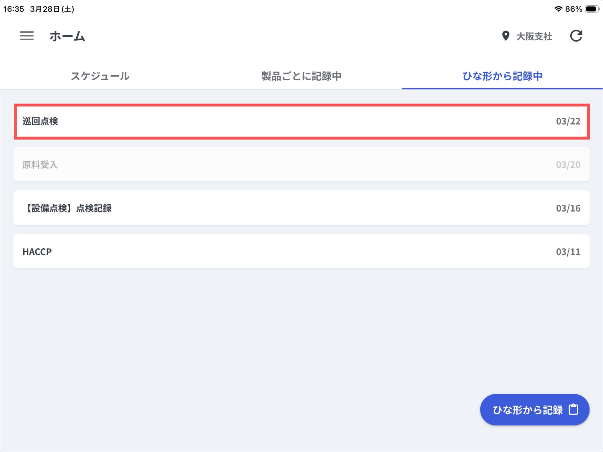ホーム画面の「ひな形から記録中」を開き、再開するレポートを押します。