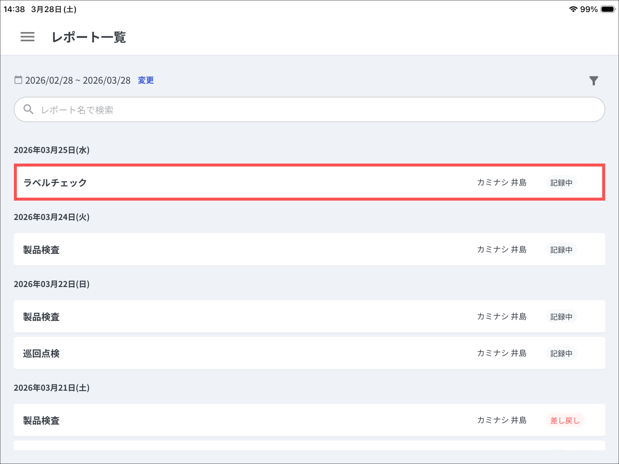 一覧にはひな形から作成されたレポートの実施日降順に表示され、直近30日以内の記録中レポートが最大100件まで表示されます。