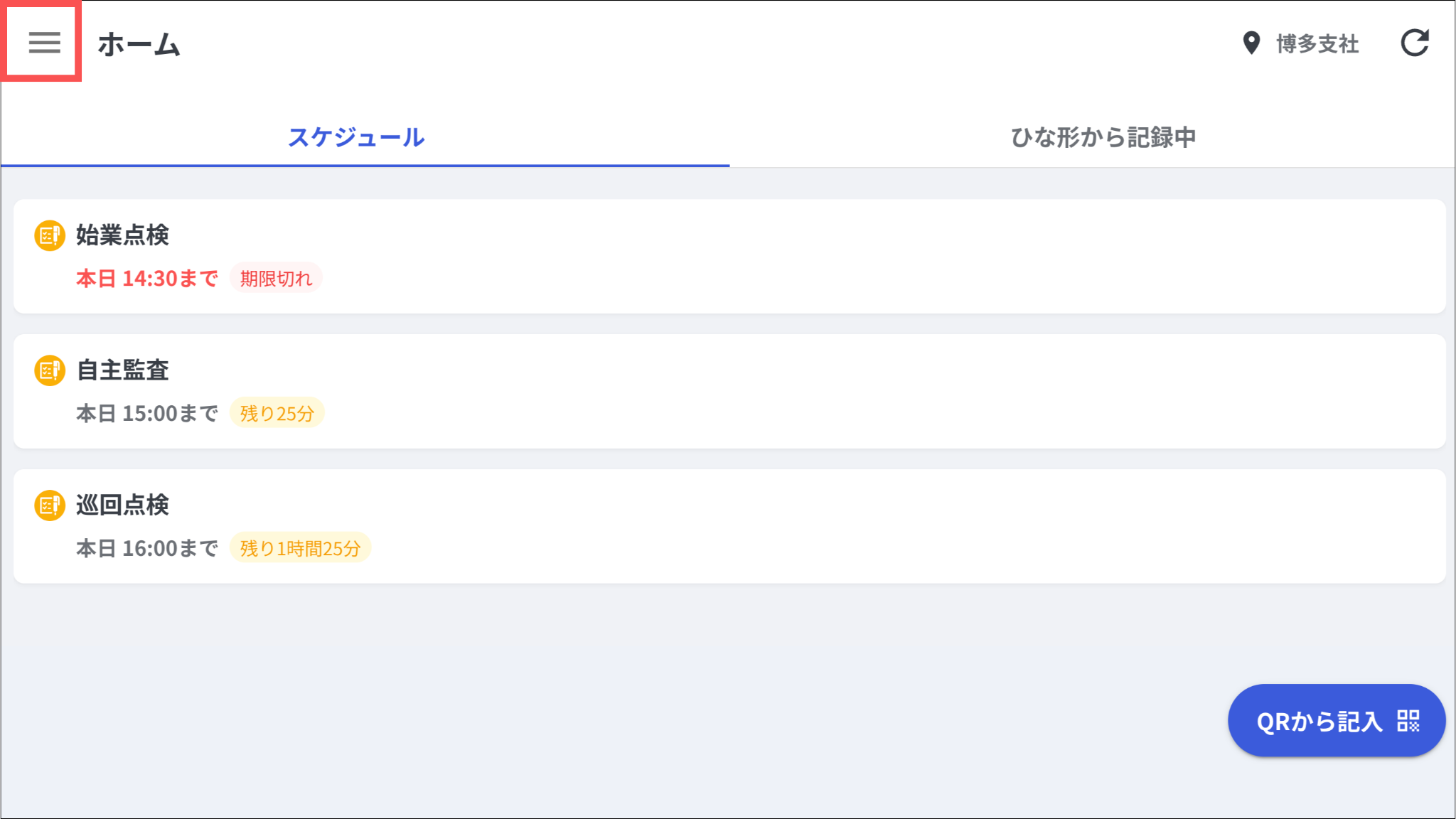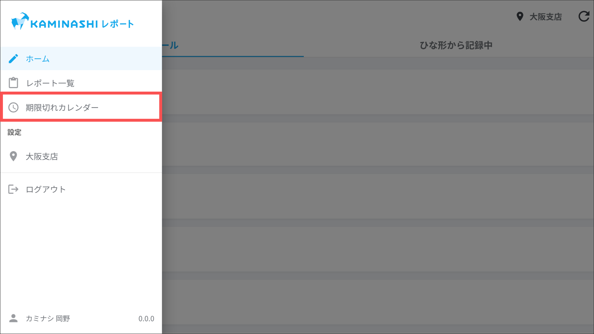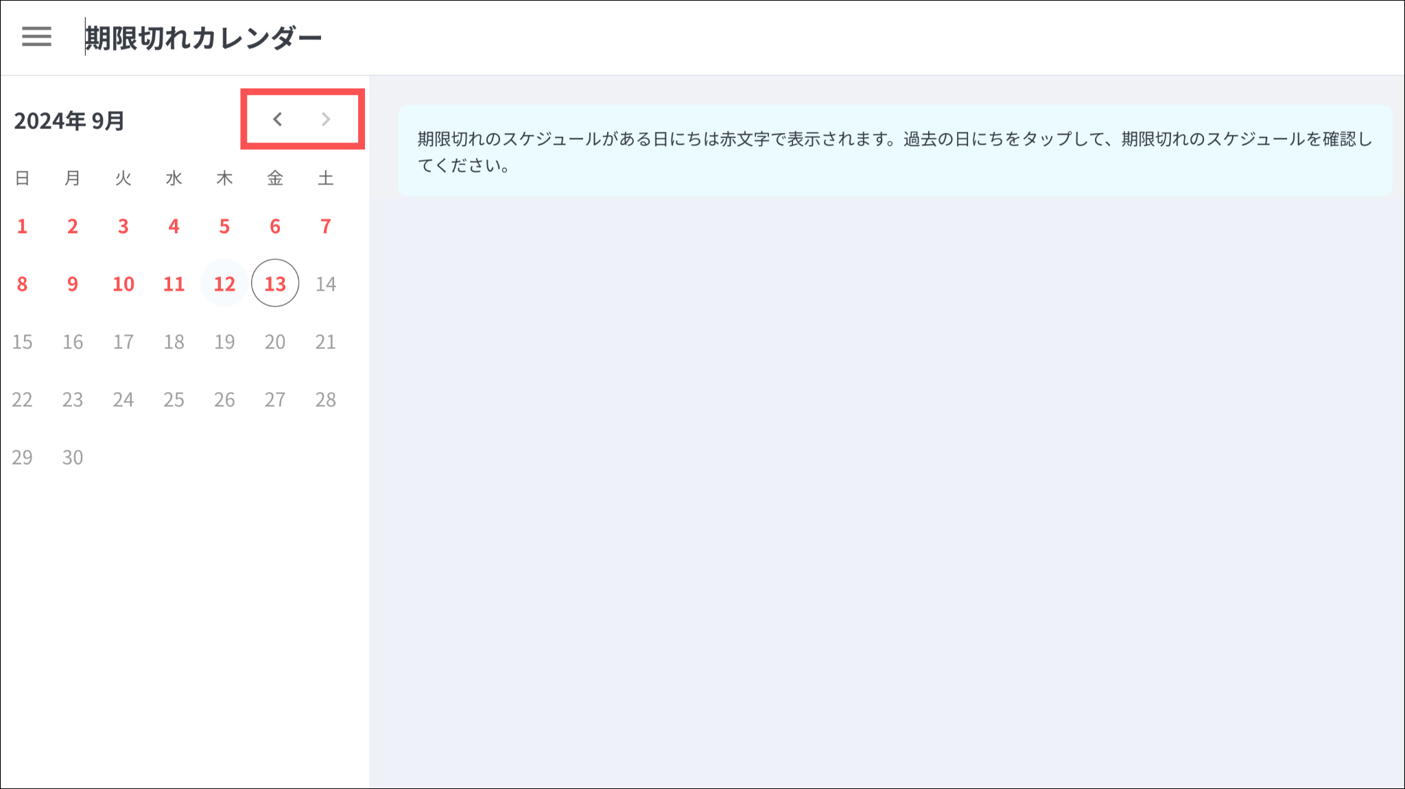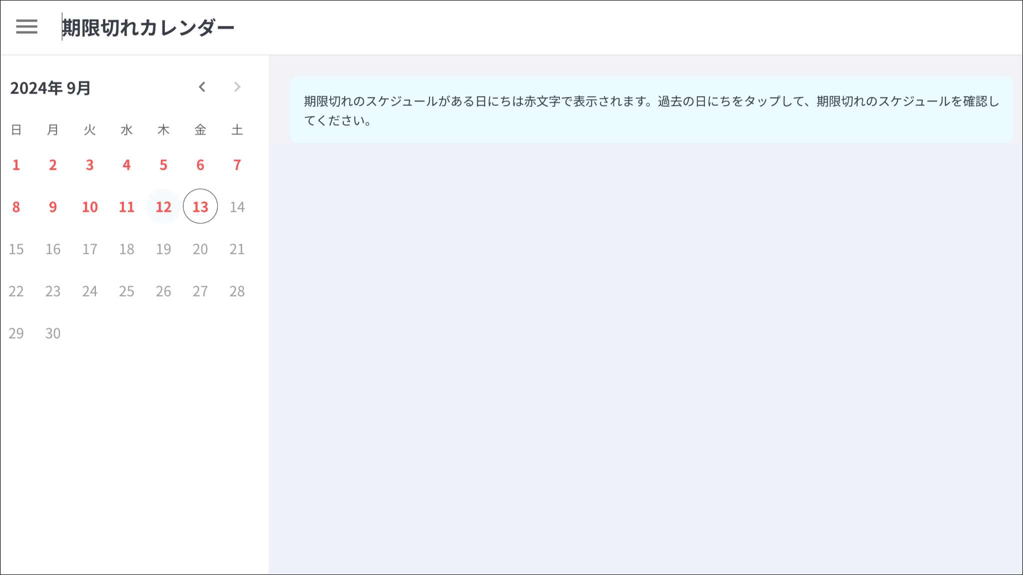 1. カミナシレポート 記録アプリ(Web)にログインする2. 3本線を押す3.「期限切れカレンダー」を押す4. 表示されたカレンダーを確認する5. 確認したい日付を選択し、レポートを押す「未実施」「記録中」「差し戻し」のスケジュールが表示されます。※一時保存されている場合、各スケジュールの右に記録中と表示されます※差し戻しされている場合、各スケジュールの右に差し戻しと表示されます6. (任意)表示期間を変更する場合は「<・>」を押すよくある質問は、こちらからご確認ください。