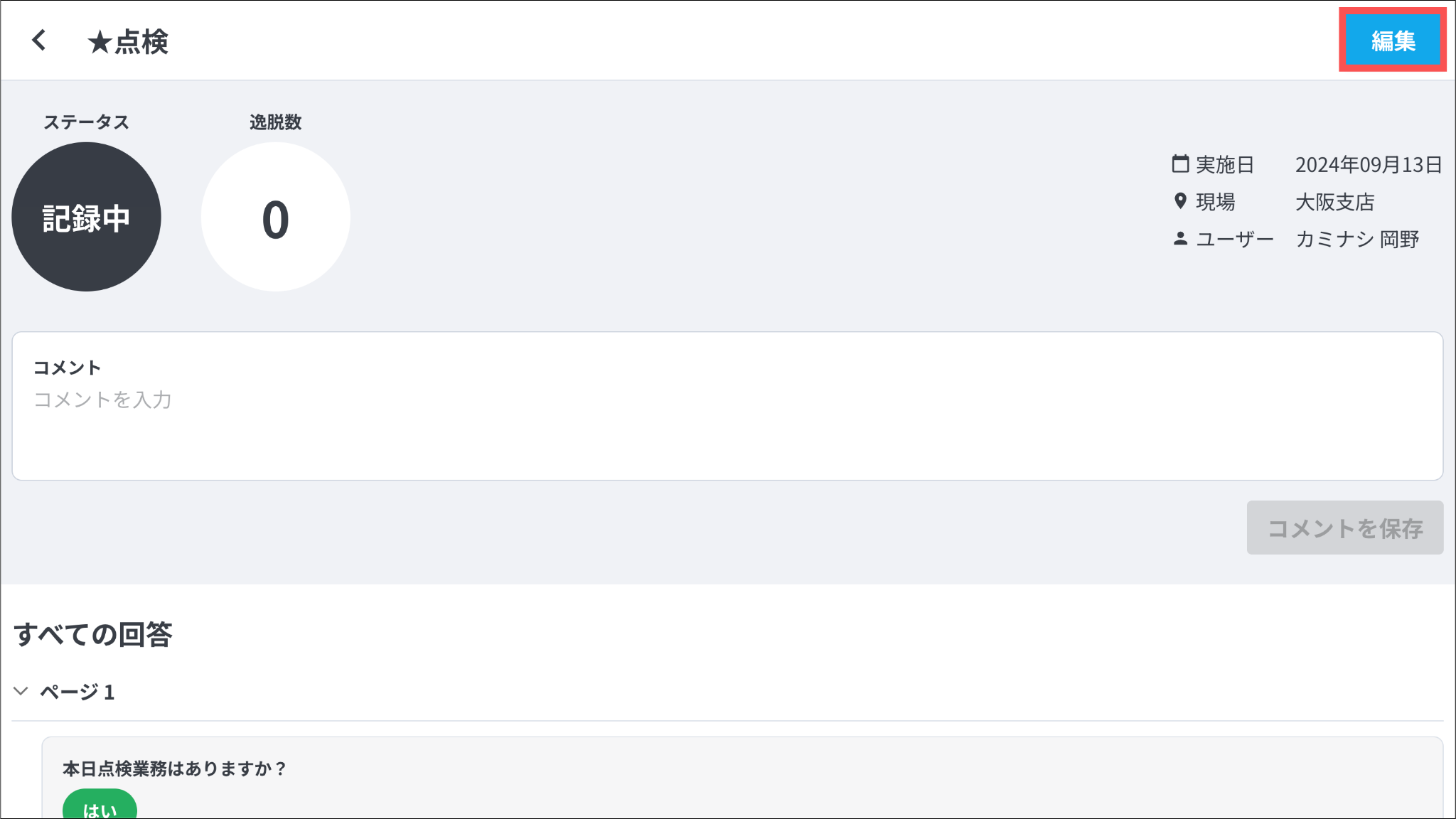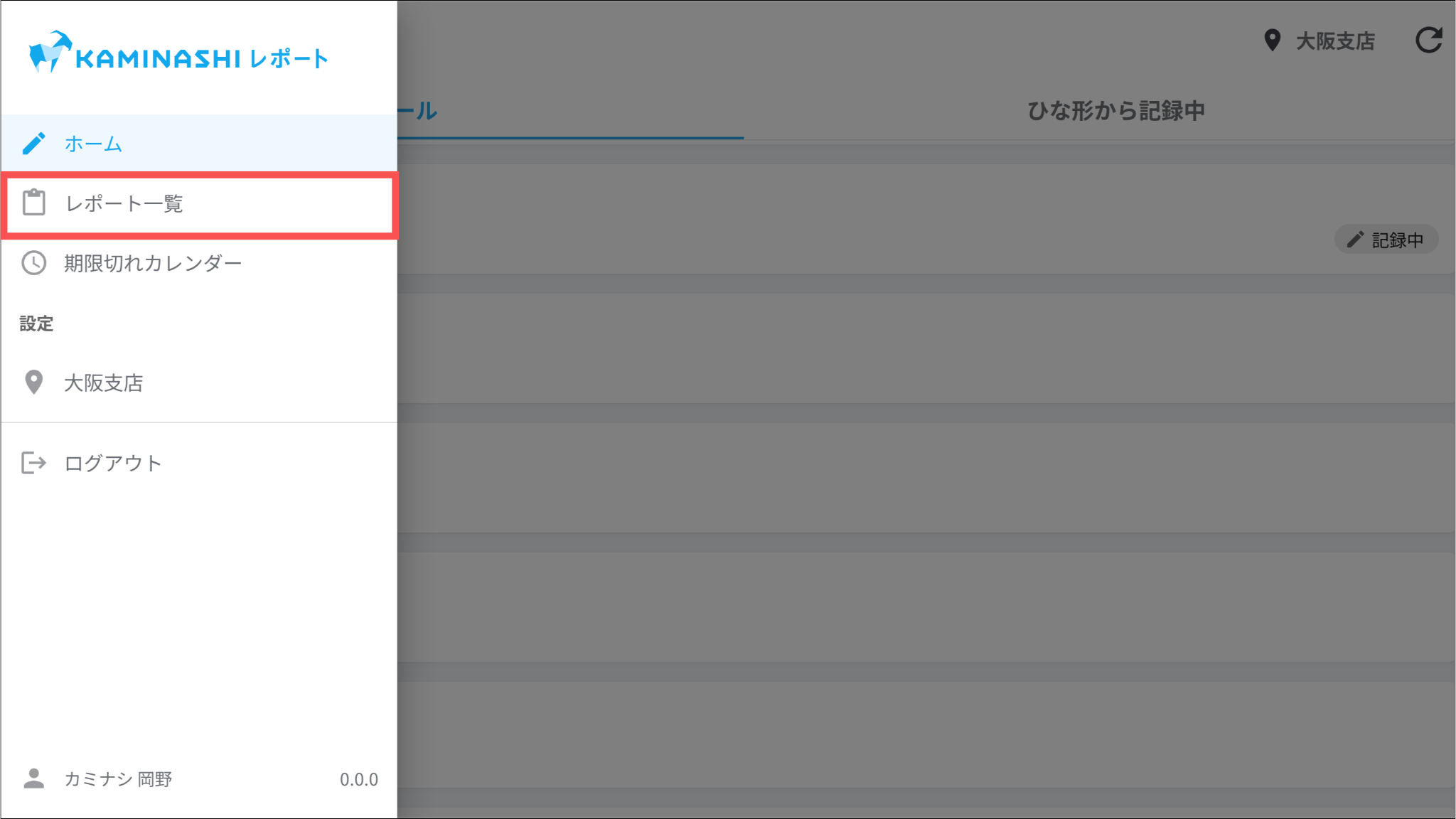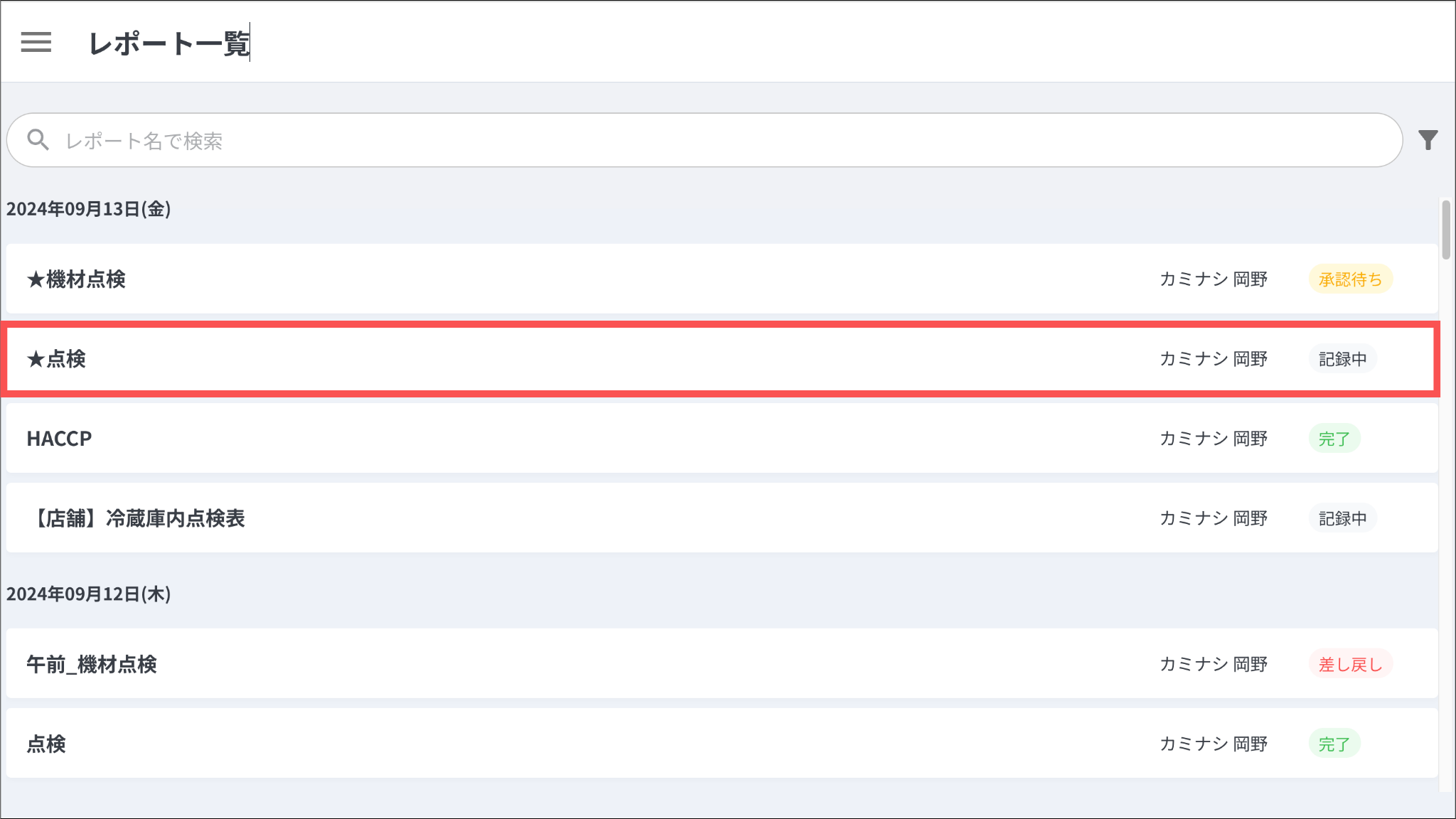 「ひな形から記入中」の並び順は、レポートの実施日降順に表示され、実施日が過去30日以内の記録中レポートが最大100件まで表示されます。
