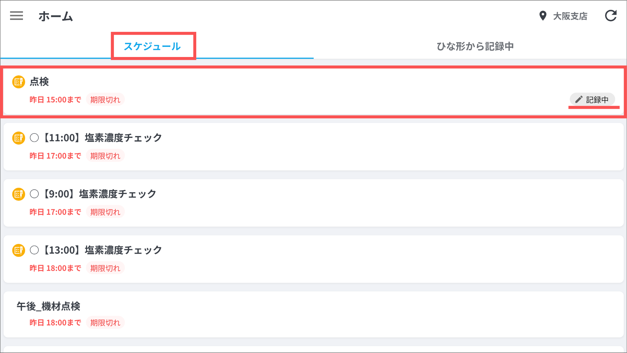 一時保存されているレポートは、スケジュール上に「記録中」と表示されます。