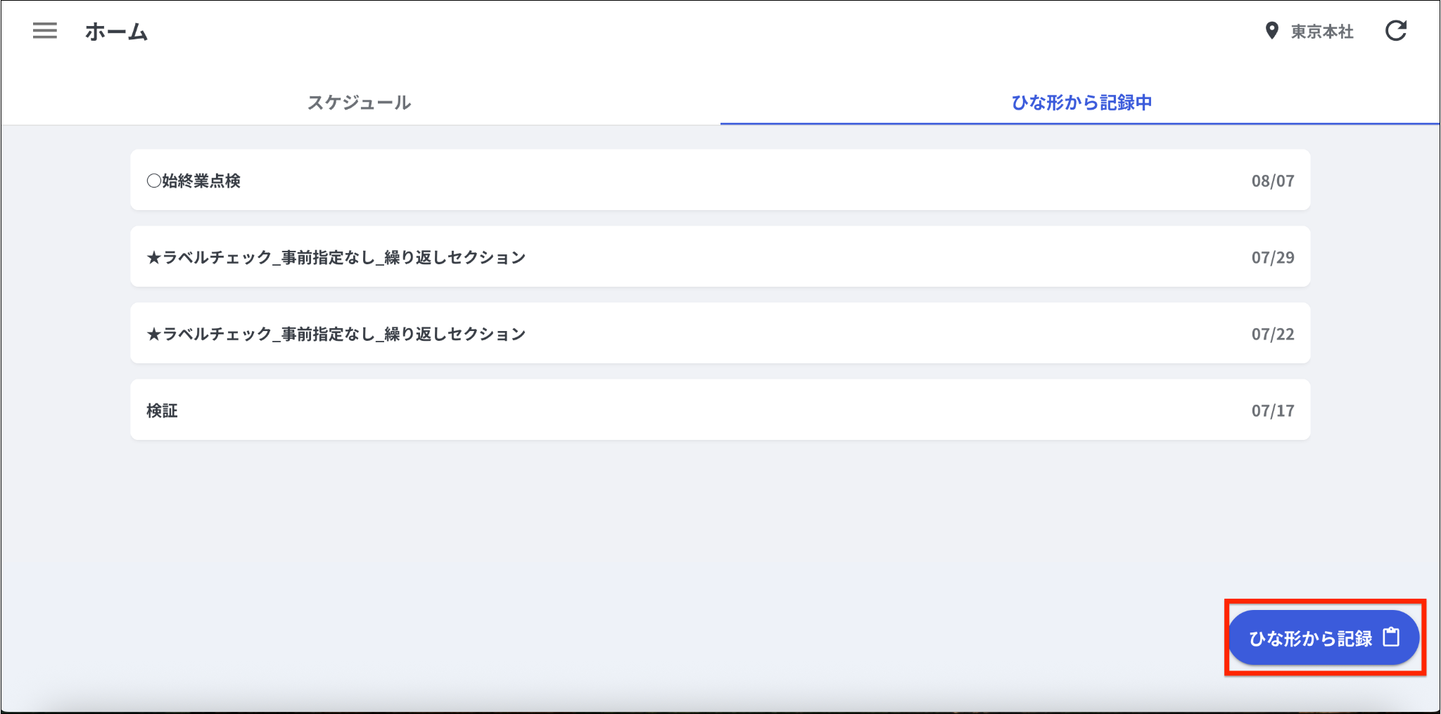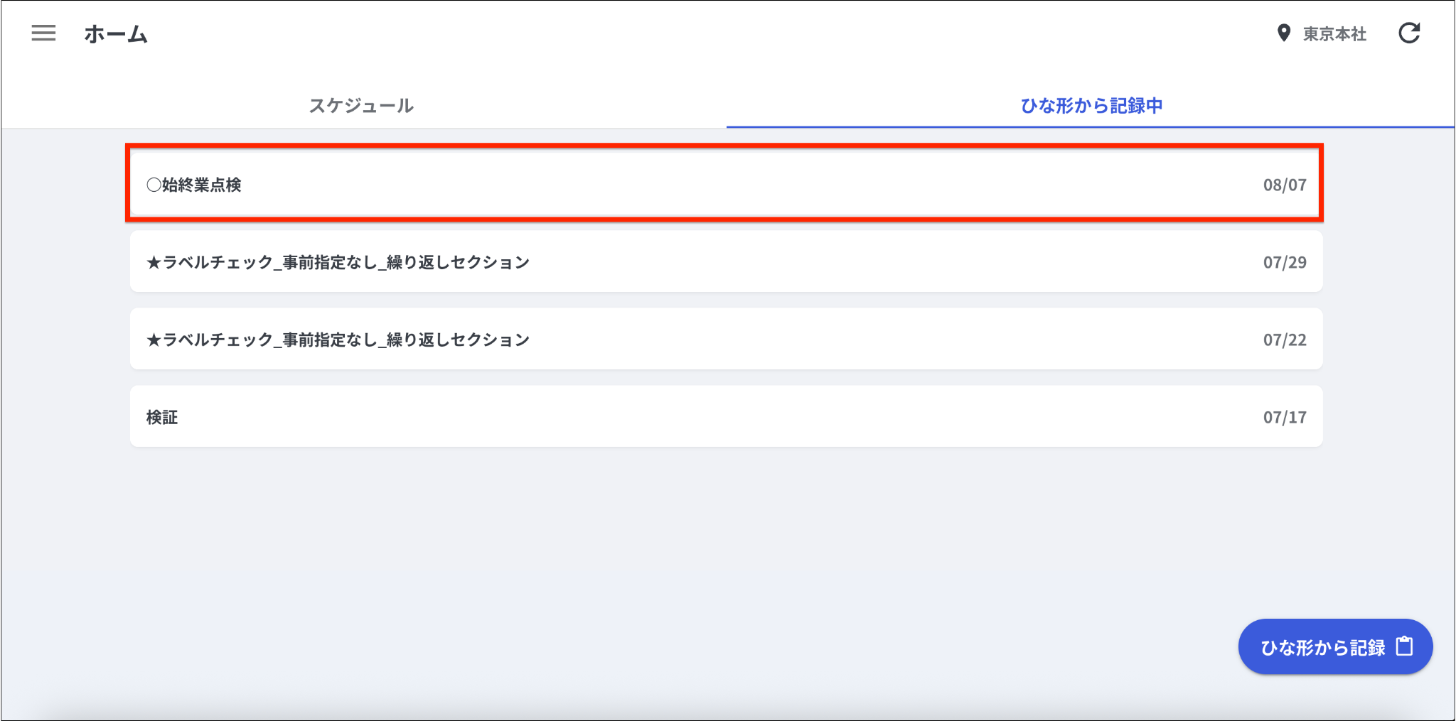 ひな形から作成されたレポートは、「ホーム」の「ひな形から記録中」画面から再開できます。