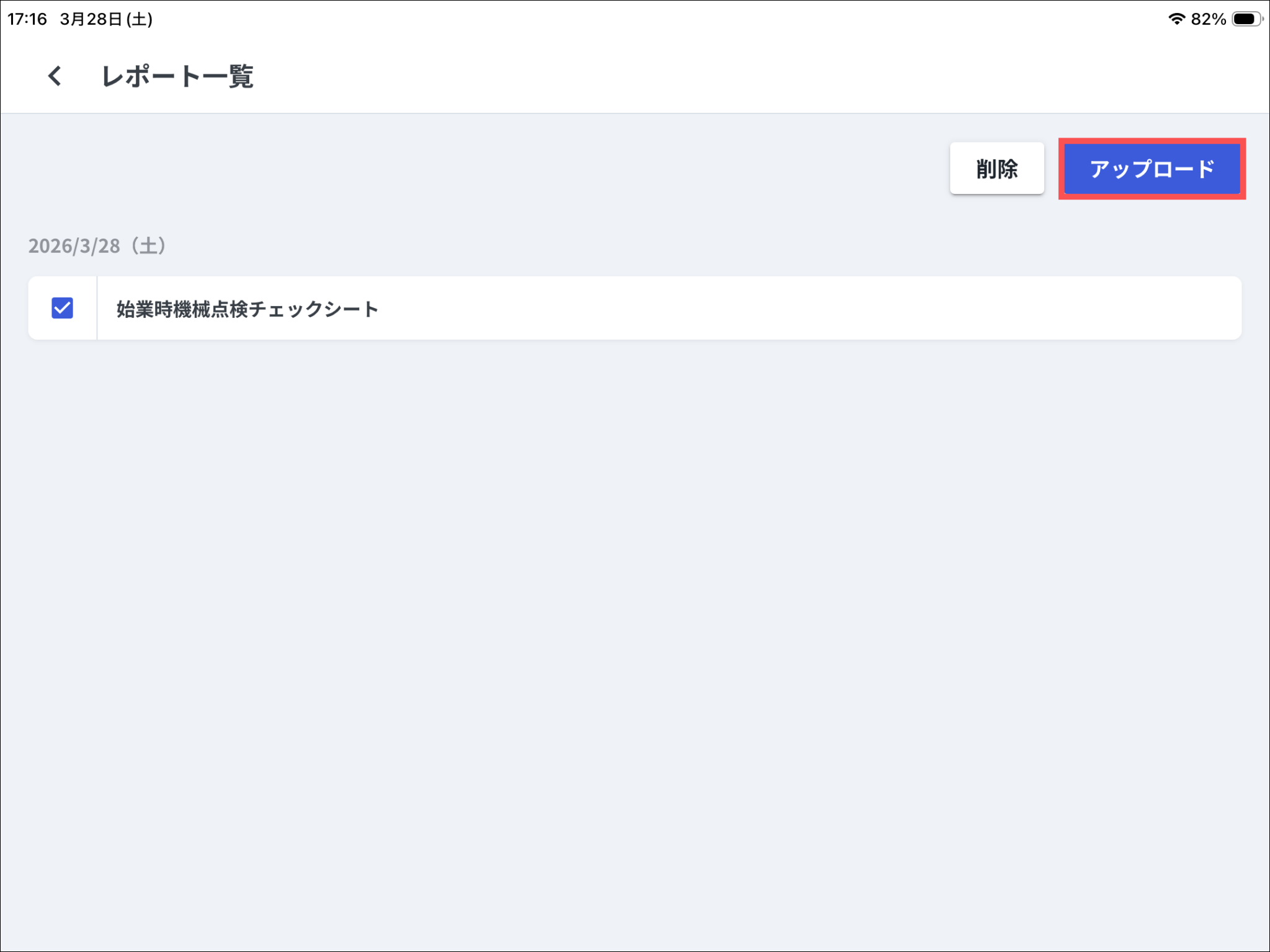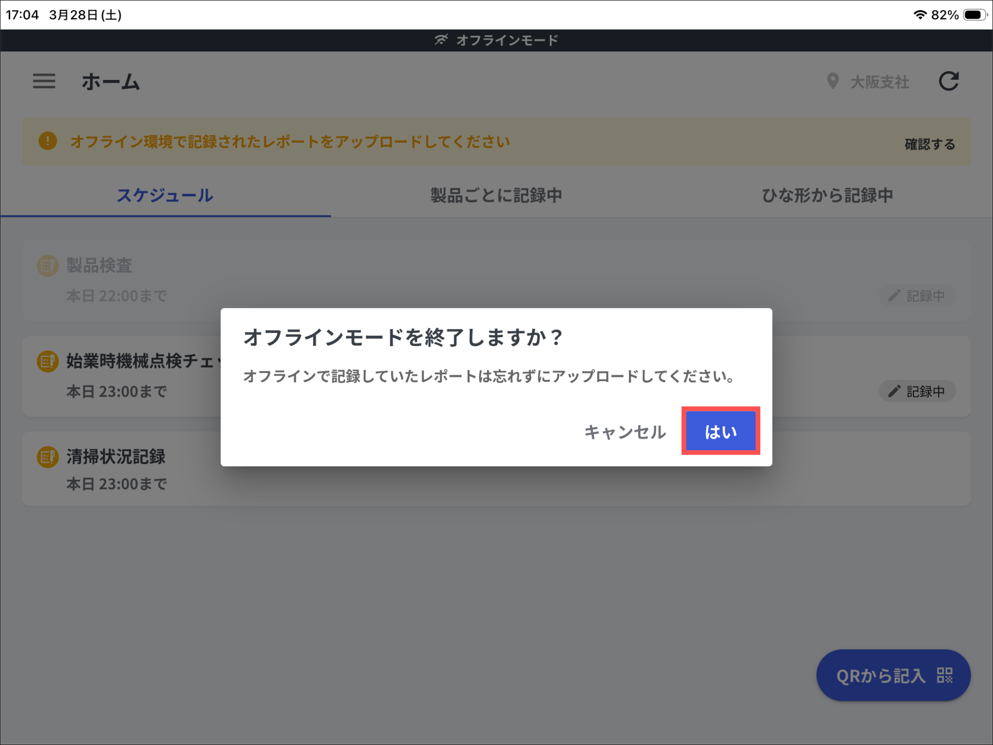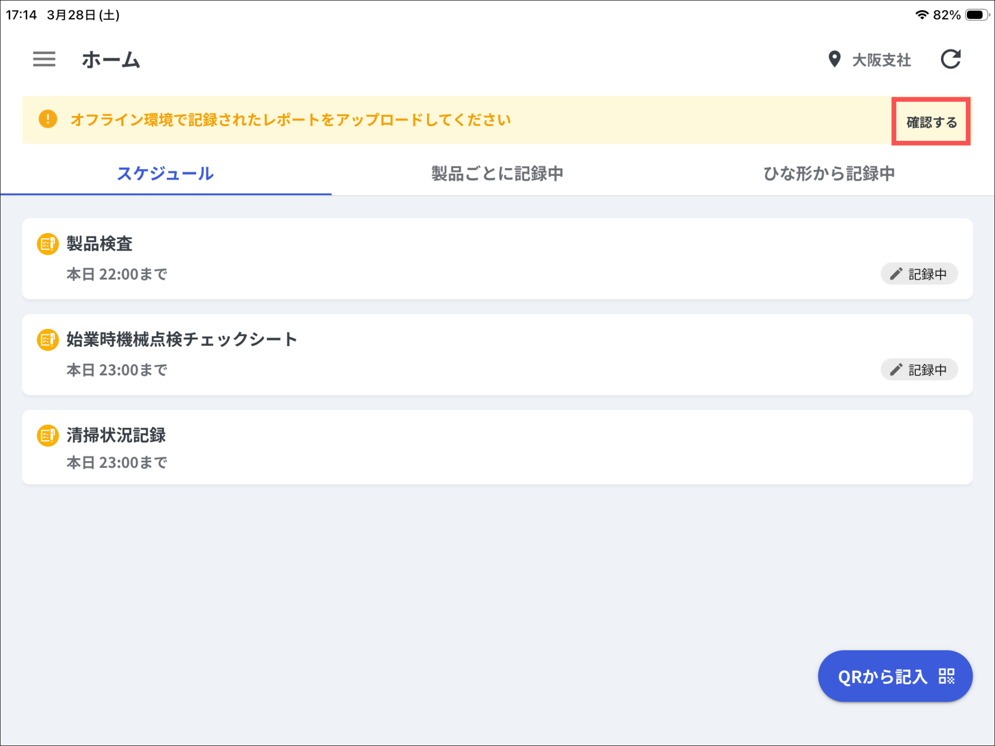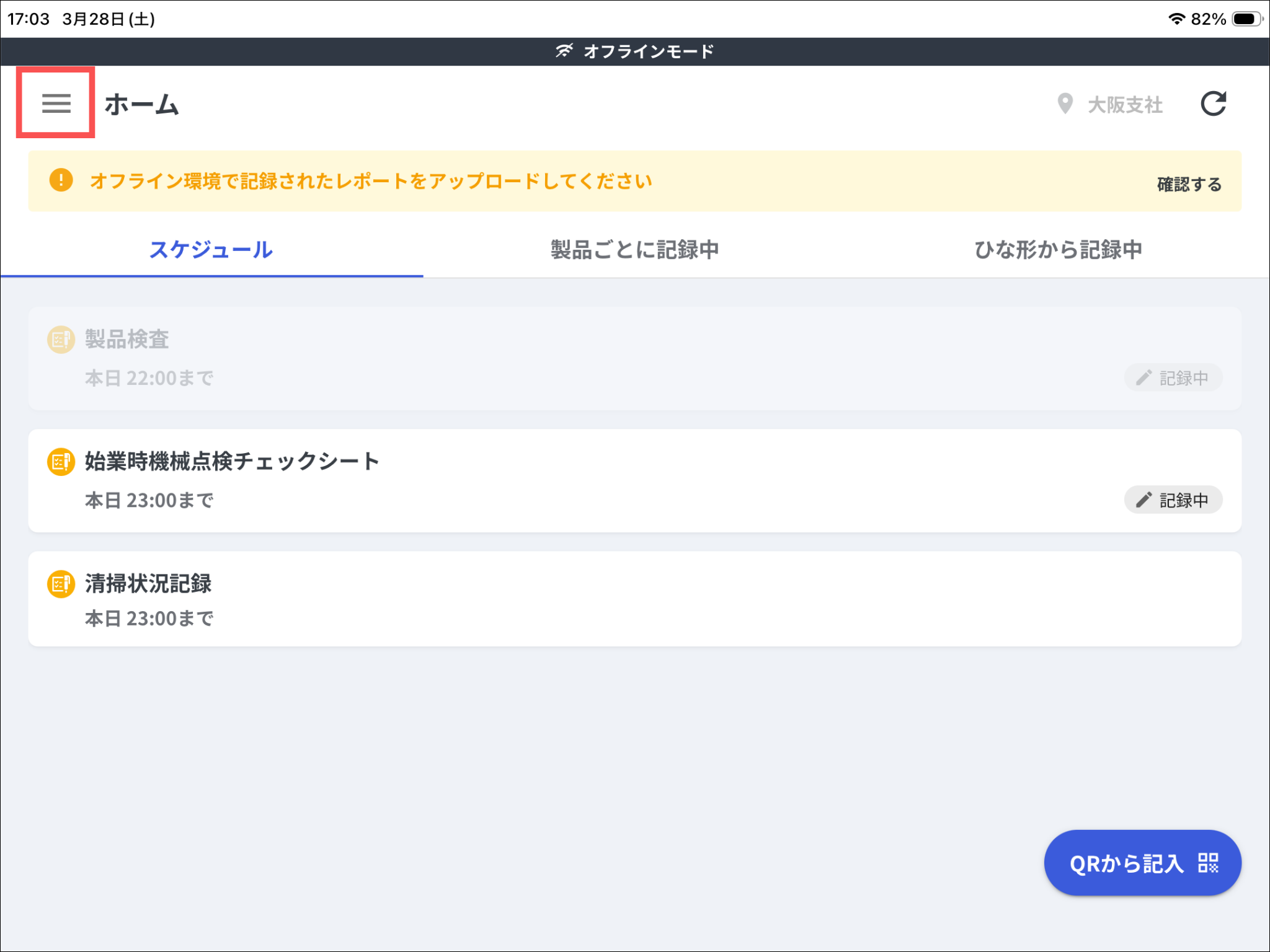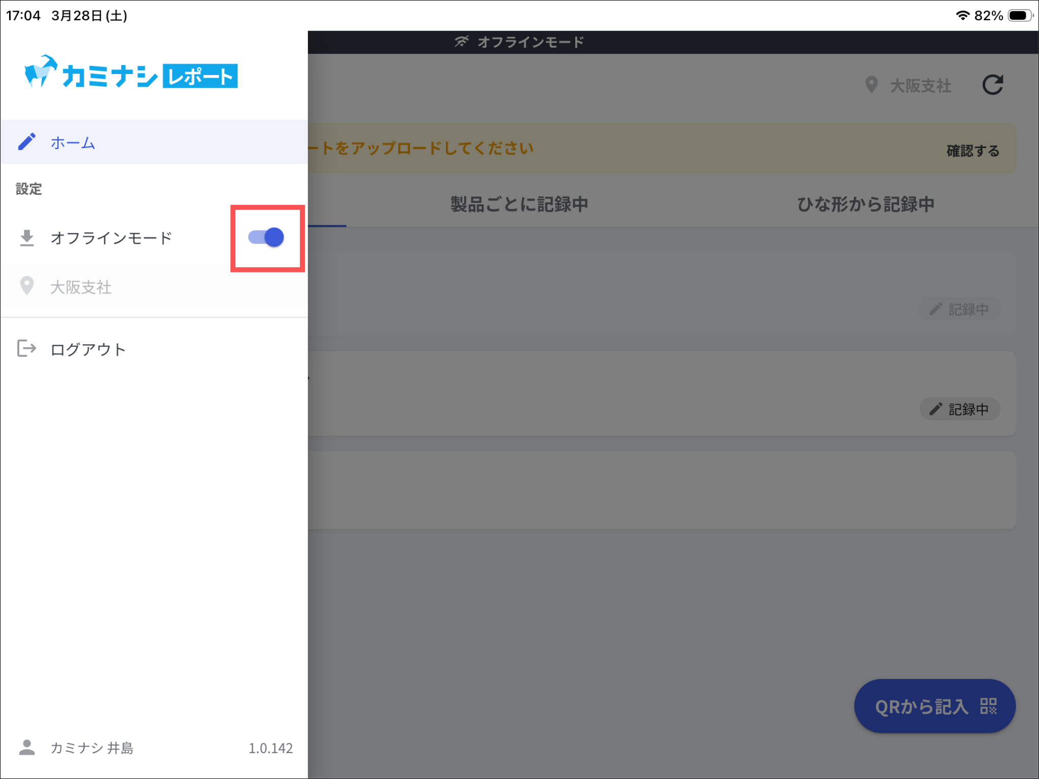オフラインモード中にレポートを保存(一時保存・提出)した現場では、「オフライン環境で記録されたレポートをアップロードしてください」と表示されます。