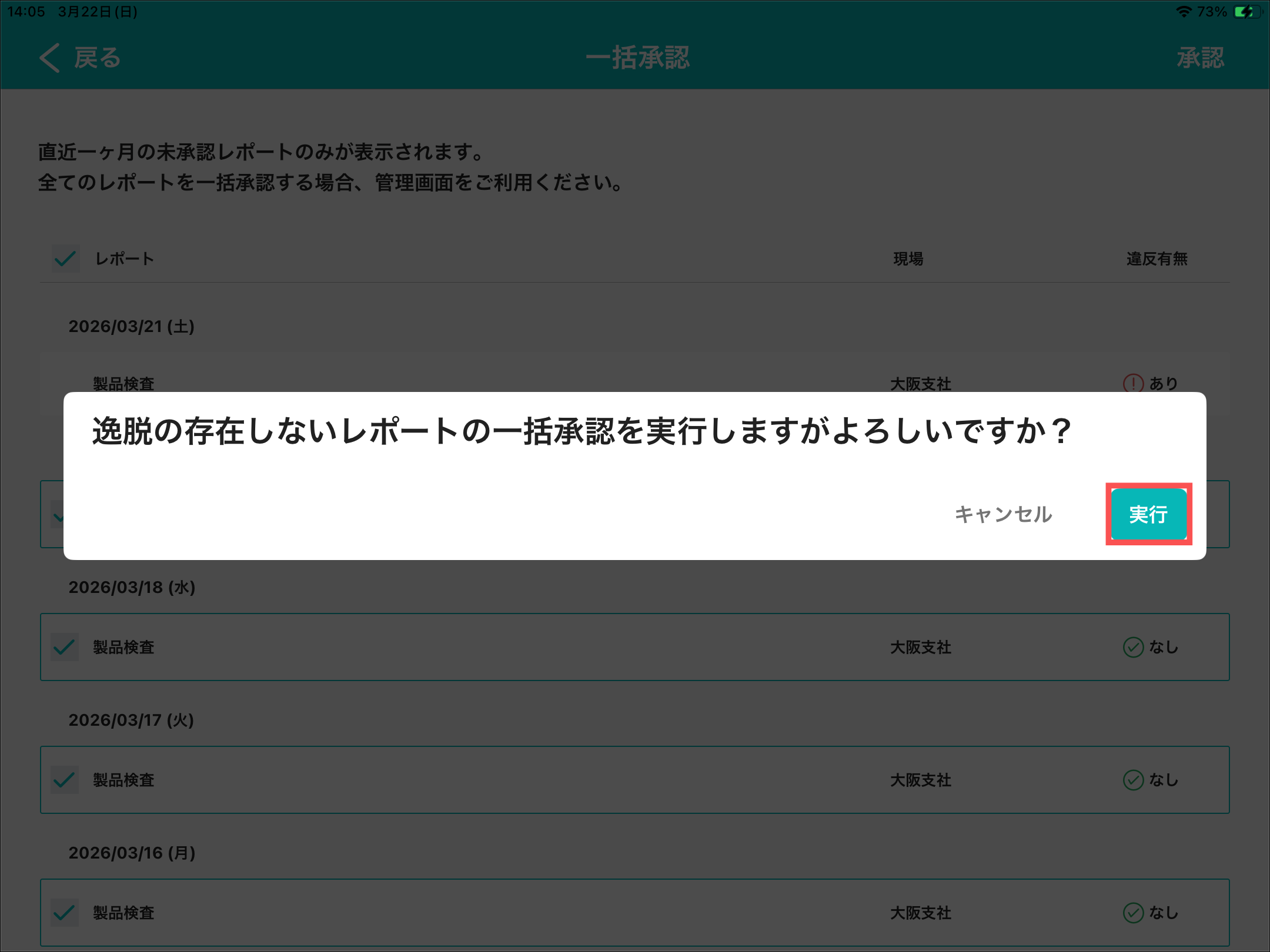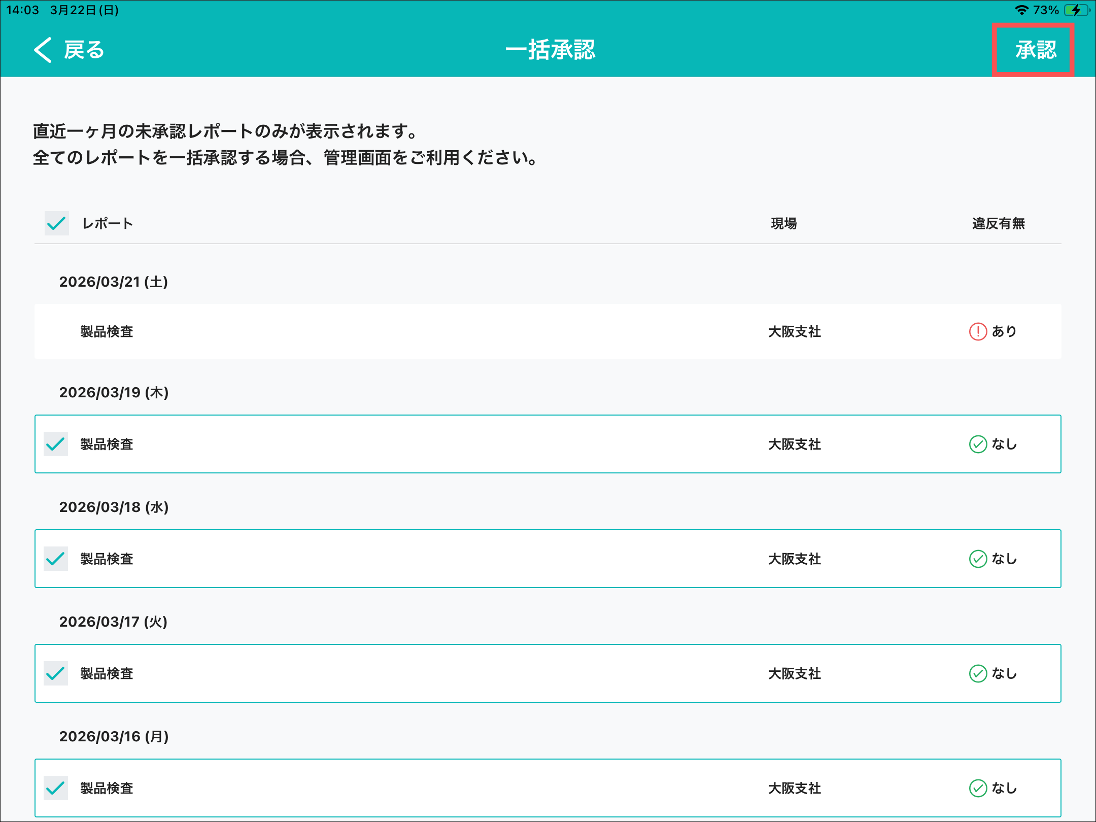 逸脱項目があるレポートはチェックボックスが表示されず、一括承認できません。