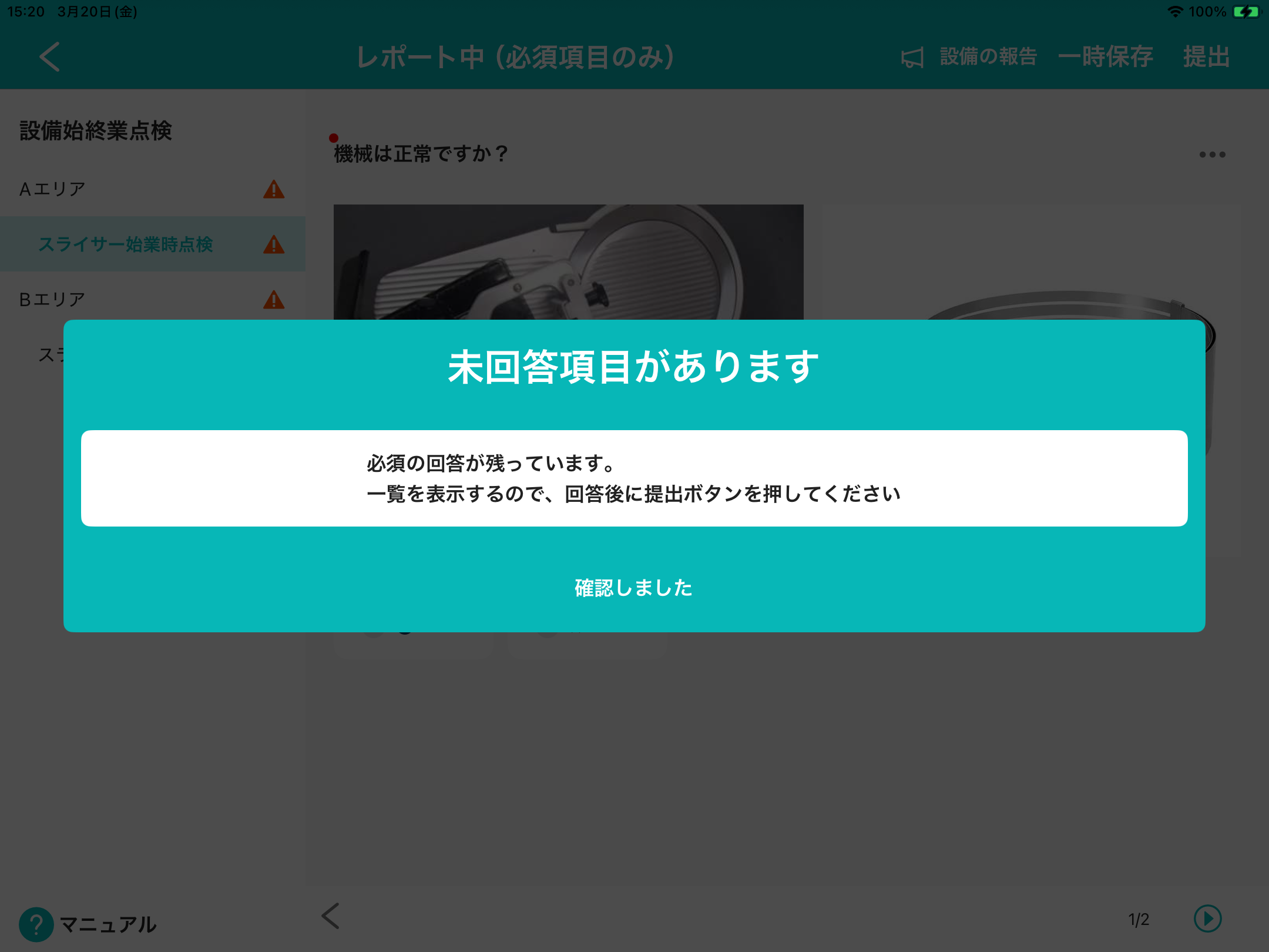 「提出」を押した際に、未回答の必須回答項目が残っている場合は提出できません。