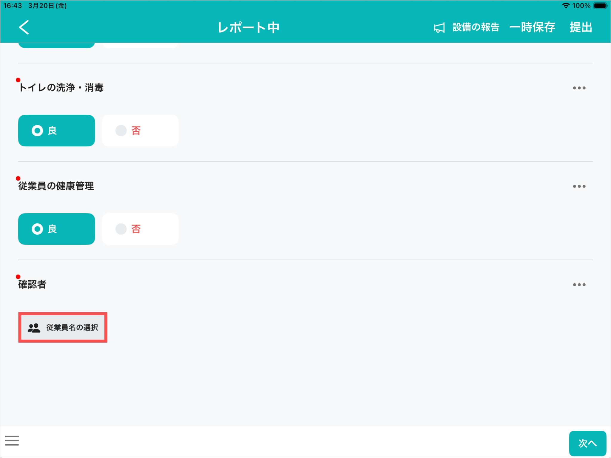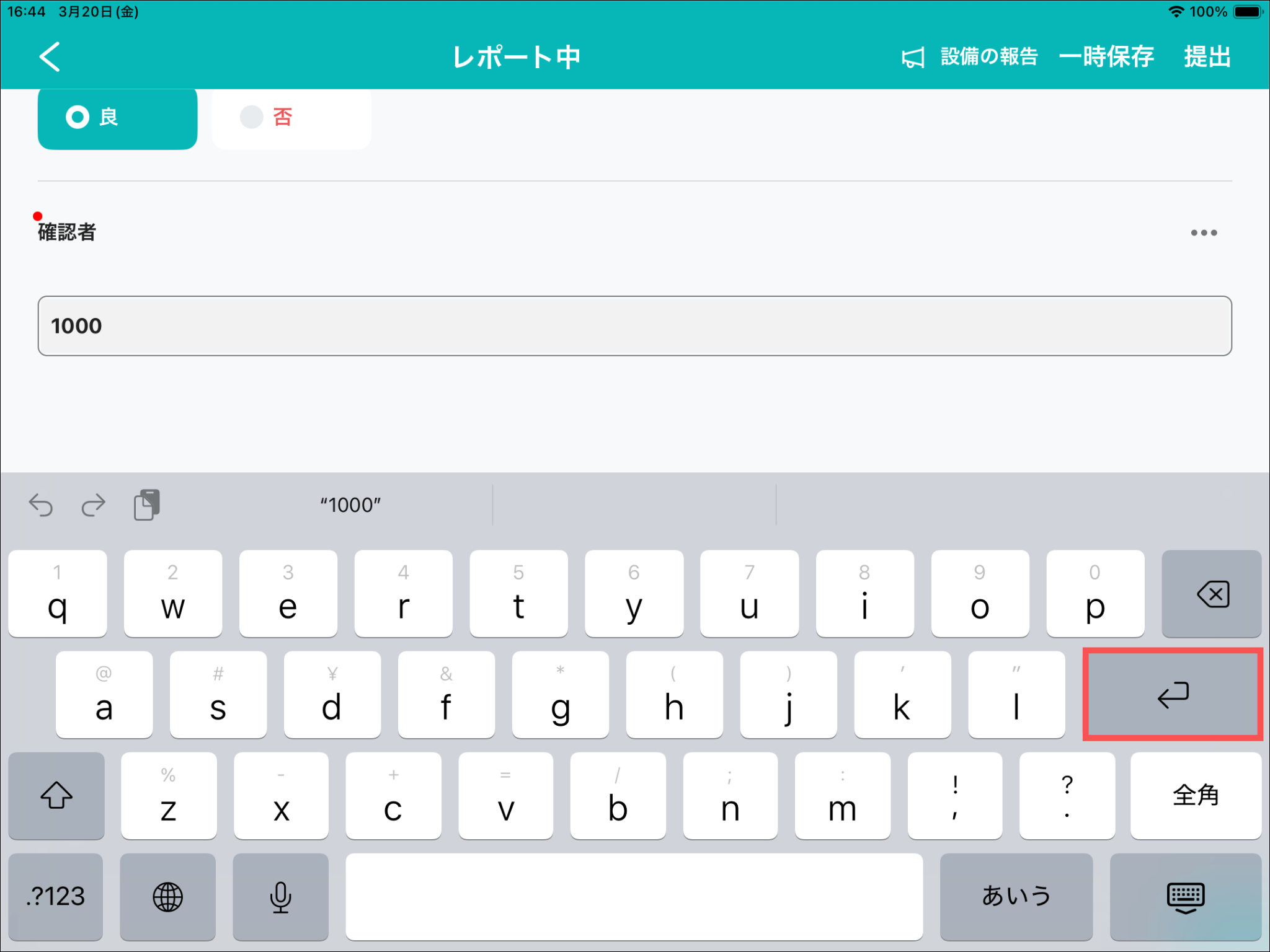 回答後、スクロール・紙芝居形式のレポートの場合は「完了」、表形式のレポートの場合は「確定」を押します。