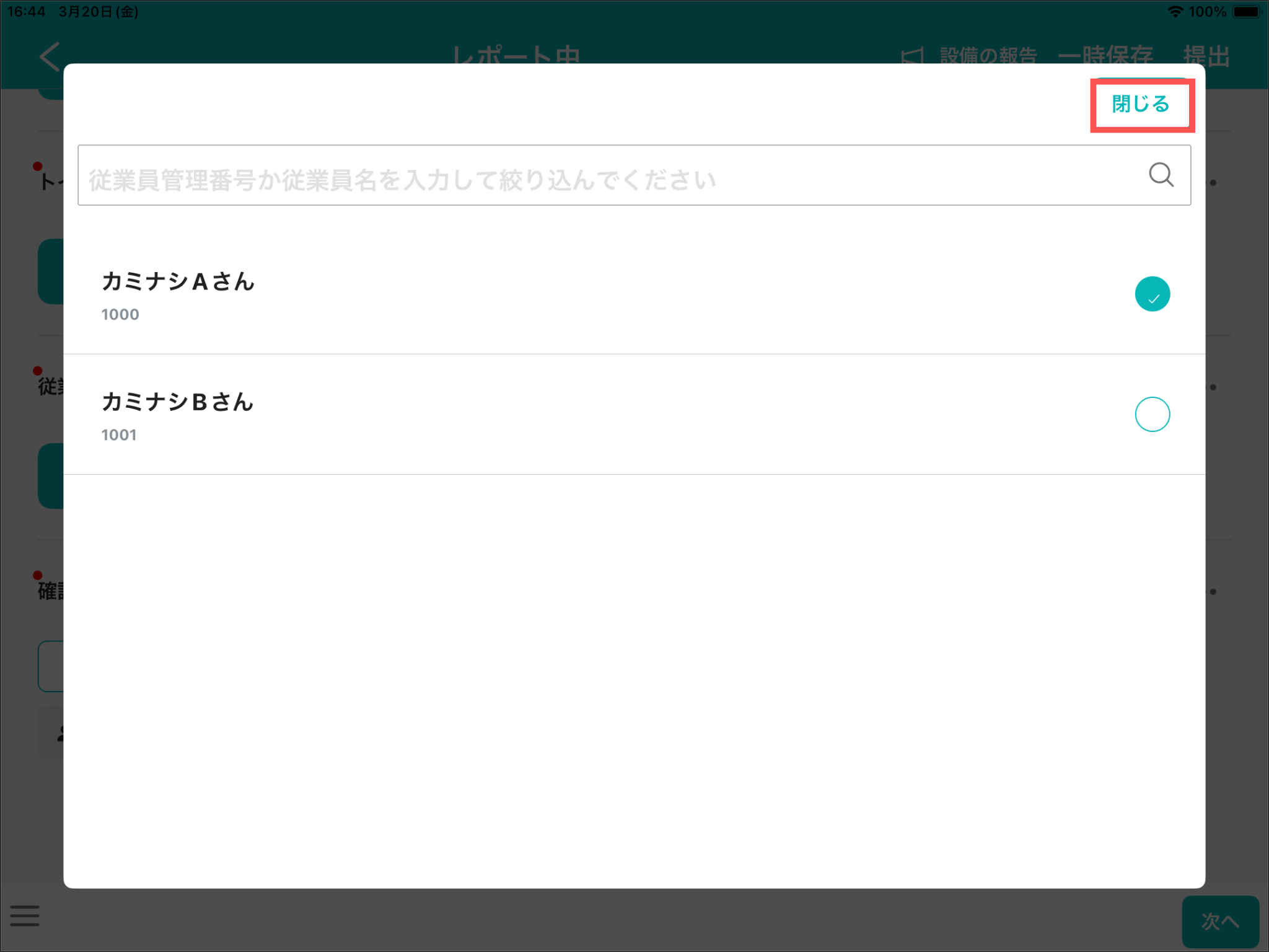 選択した従業員を変更または削除する場合は、「従業員名の選択」を再度押すか、従業員名横の「✕」を押します。