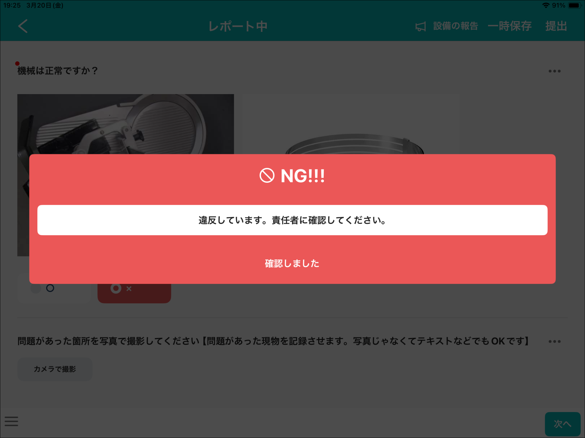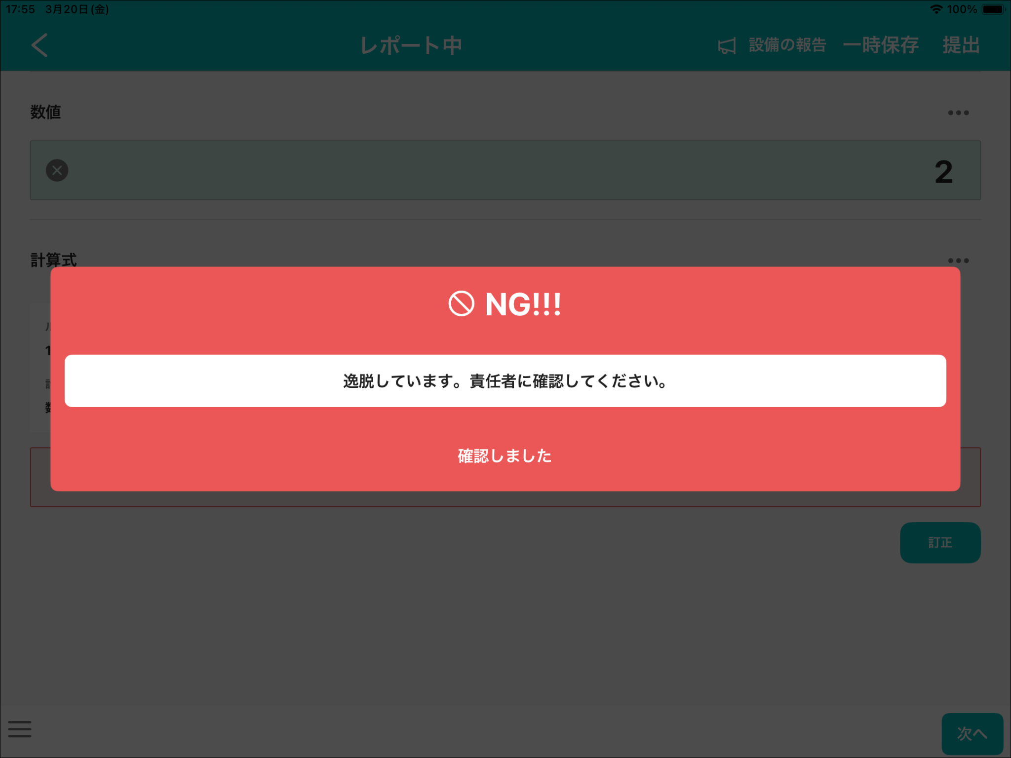 管理画面で逸脱を設定している場合、逸脱の回答をすると逸脱警告メッセージが表示されます。