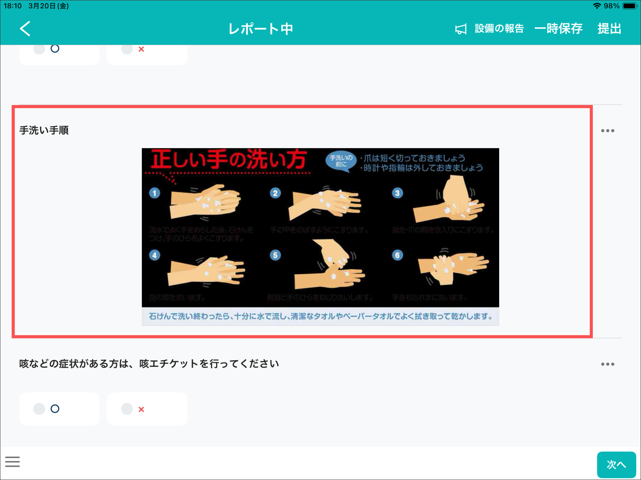 スクロール・紙芝居形式のレポートで、作業をしなかった日など回答できない場合は「該当なし」を押します。