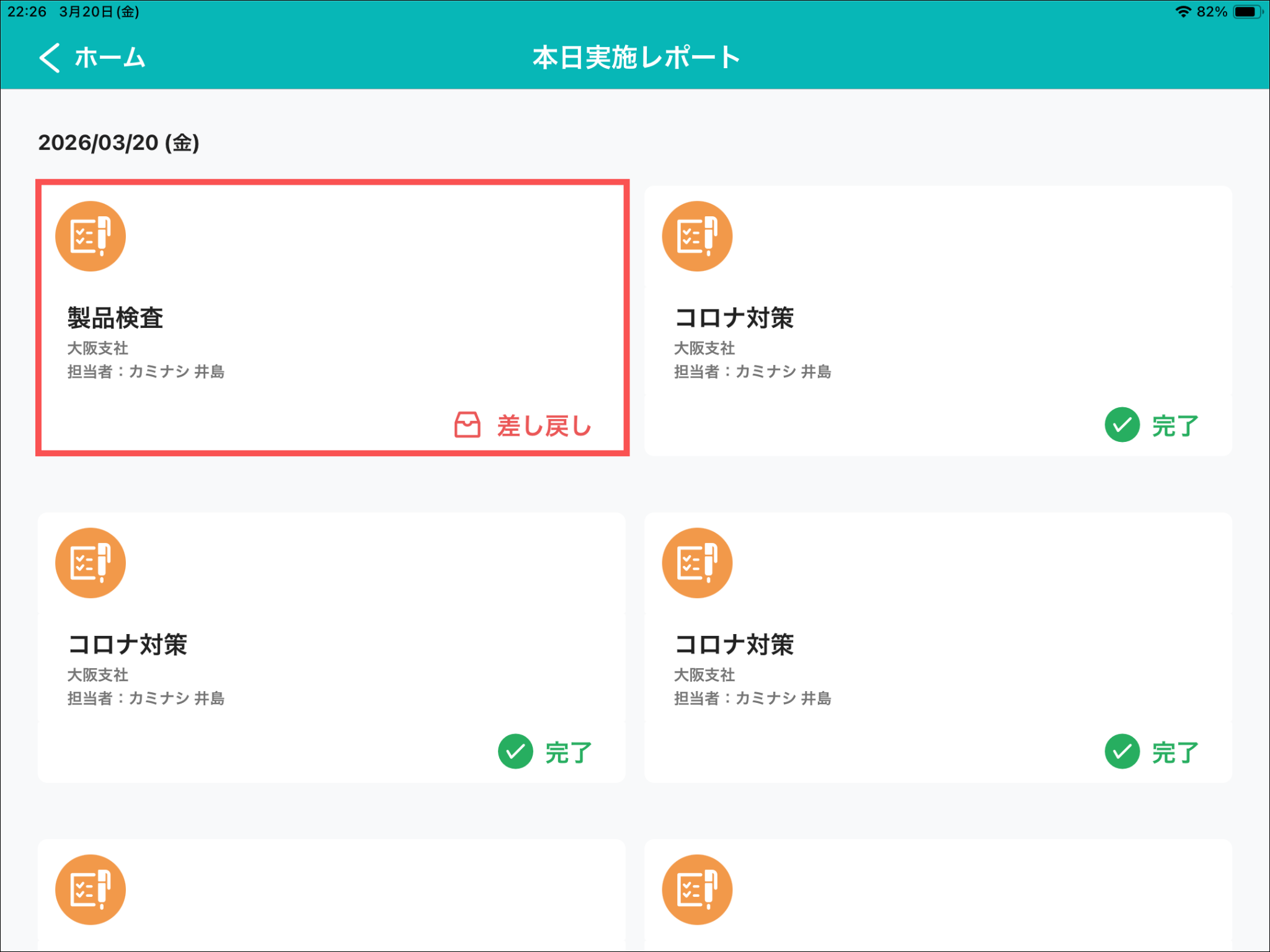 当日その現場で記録した全てのレポートが表示されており、差し戻されたのレポートには「差し戻し」と表示されます。