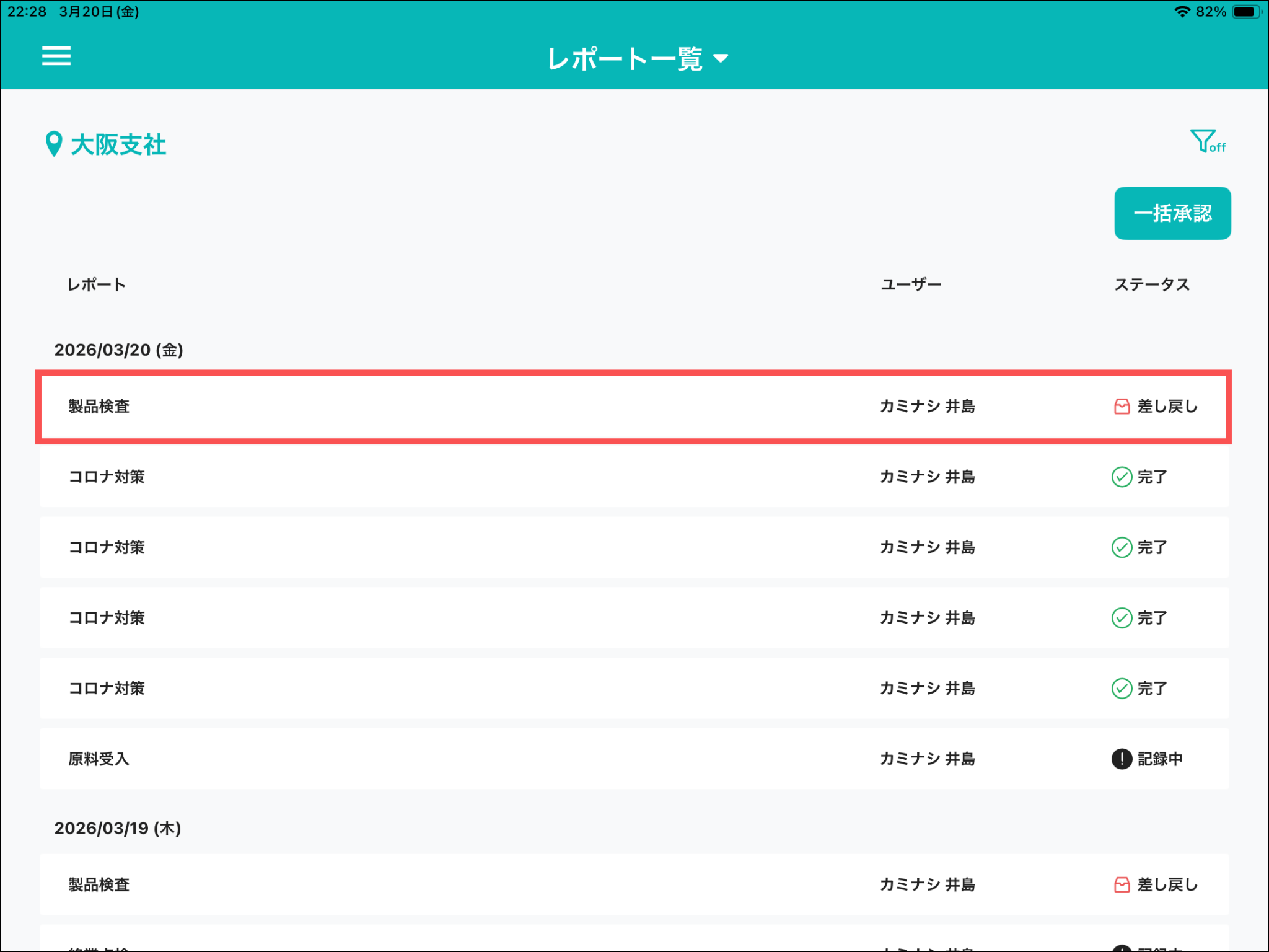 また、ステータスが「差し戻し」のレポートのみを絞り込んで表示することもできます。