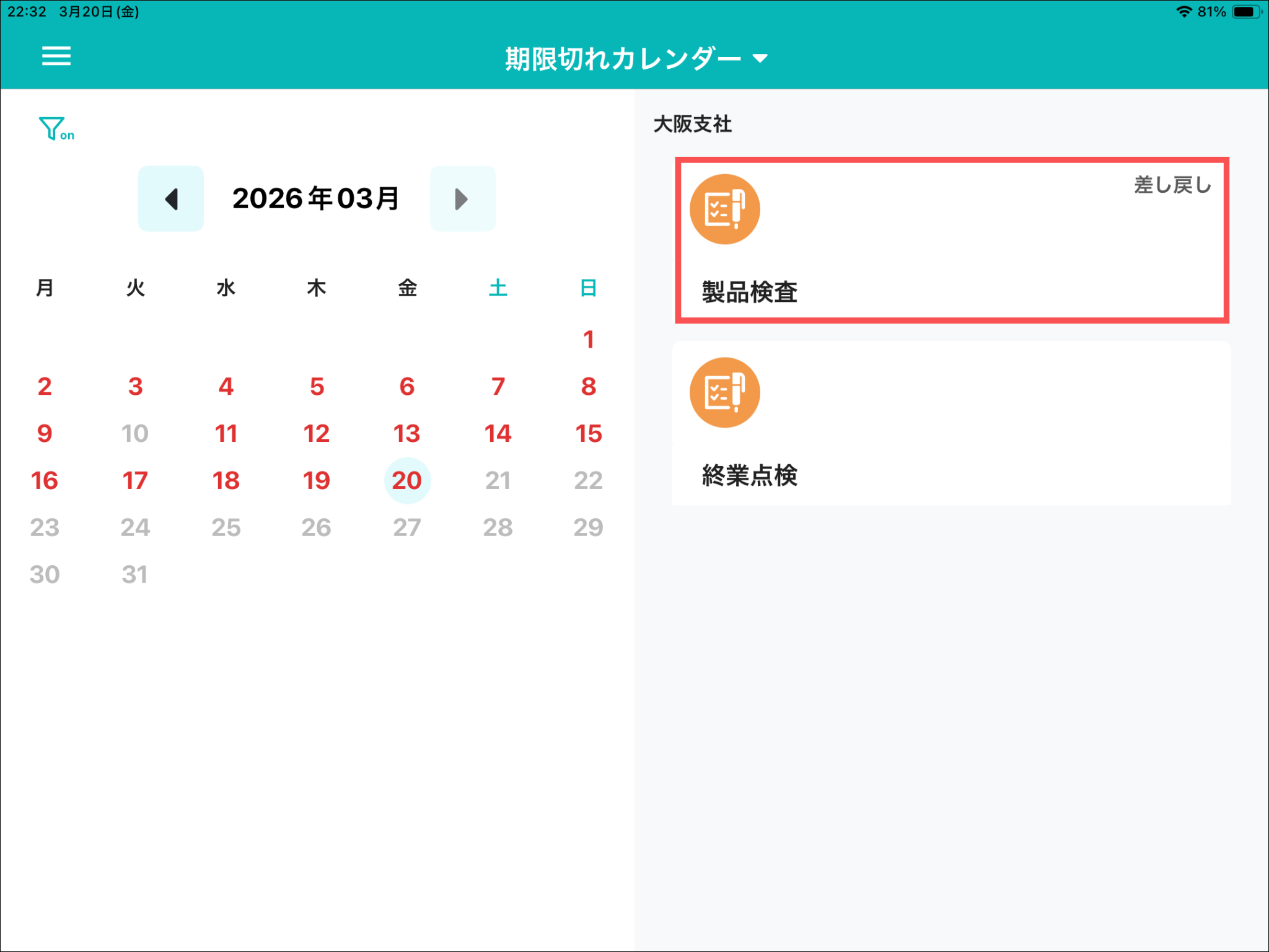 「本日実施分」を押して 、「期限切れカレンダー」を開きます。