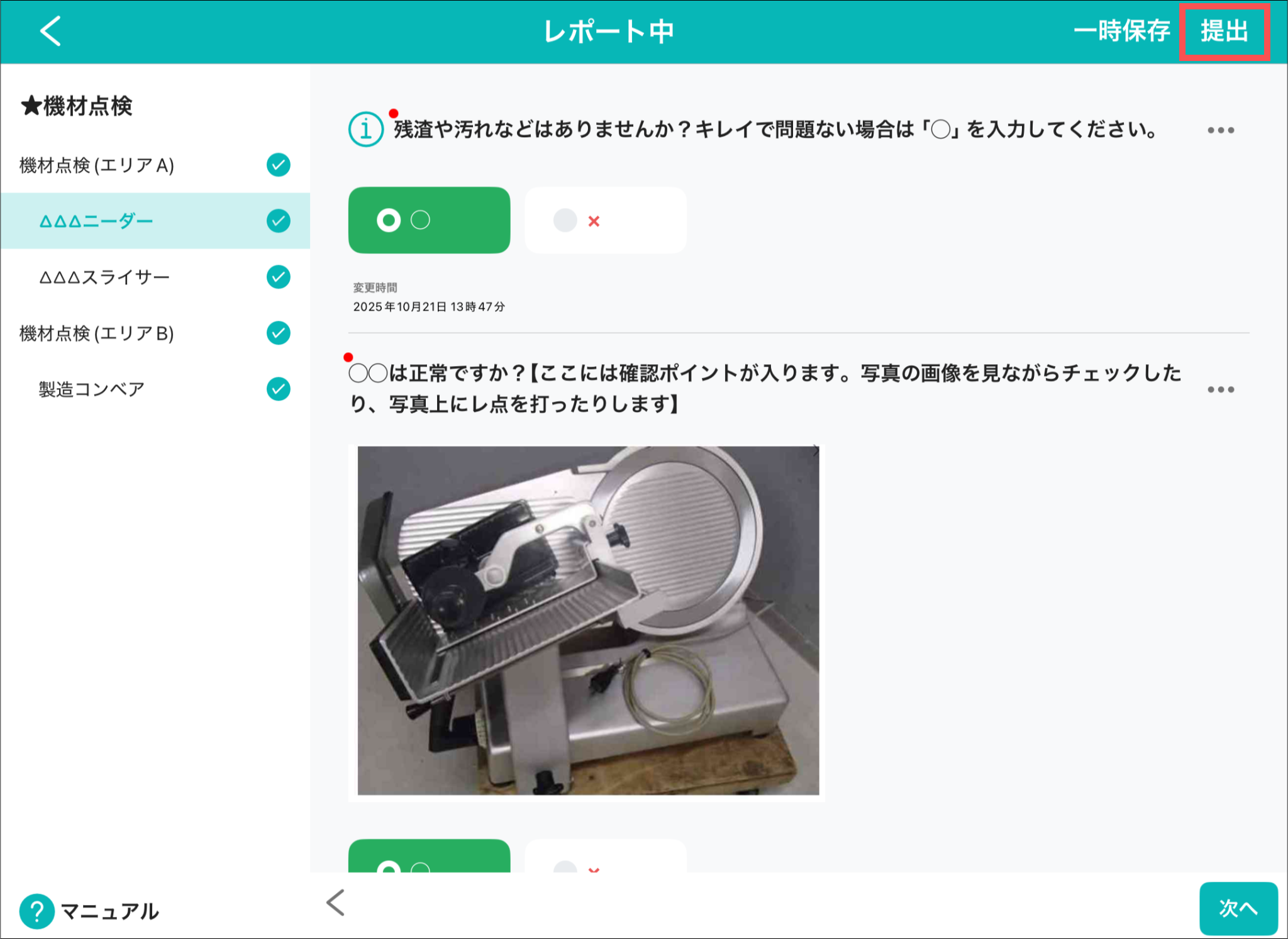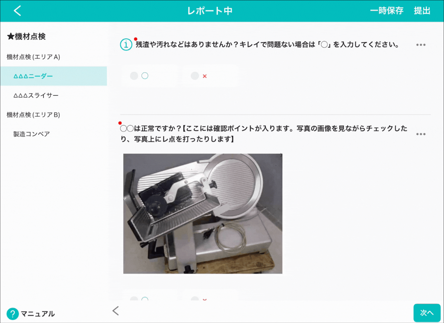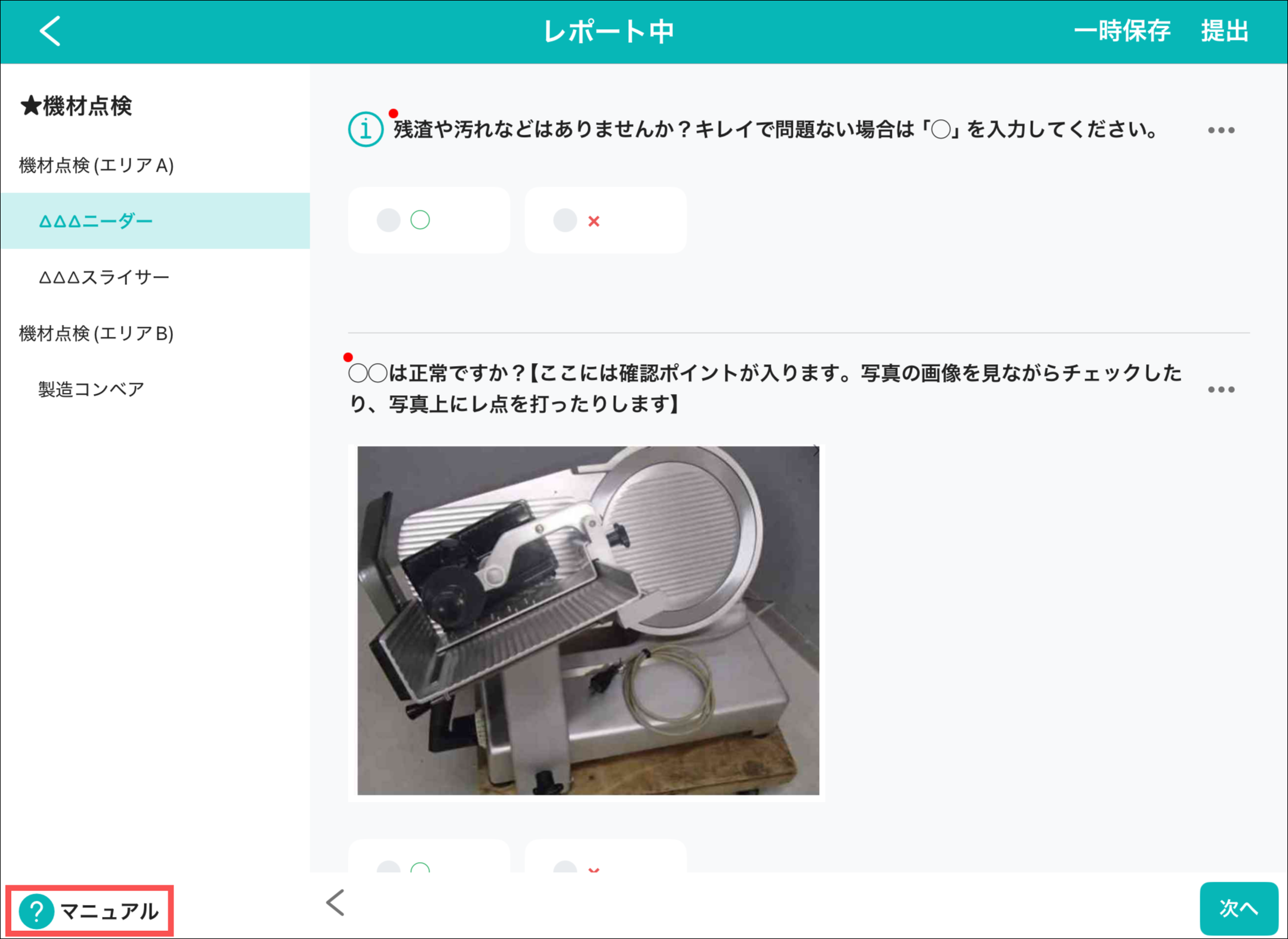 ⑨:マニュアルを表示します。説明は「【記録アプリ(iOS/iPadOS)】レポートを新規作成する:3-3.「マニュアル」を押して、マニュアルを確認する」をご参照ください。