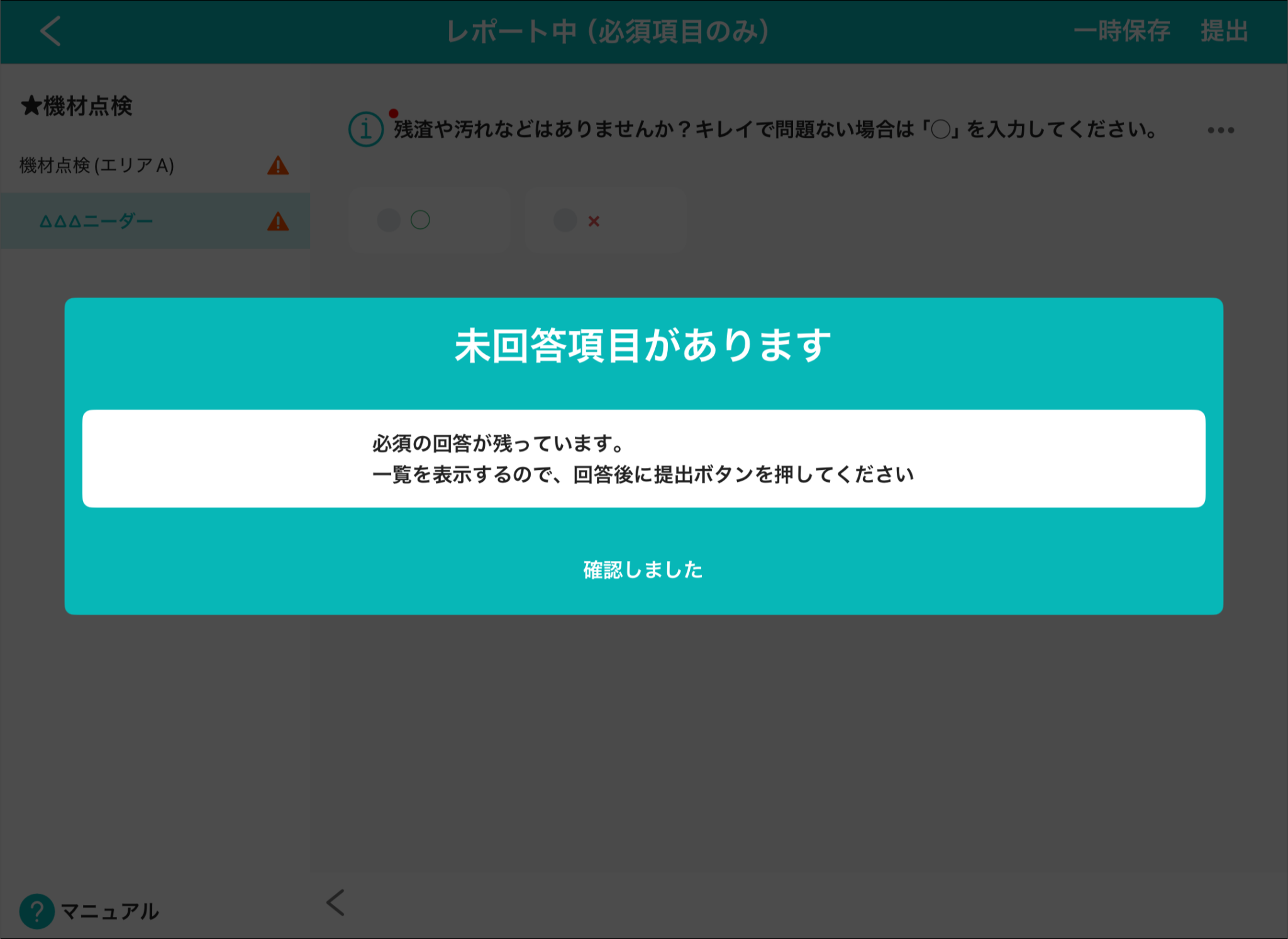 レポートの「提出」を押したときに、未回答の必須回答項目が残っていた場合には、提出ができません。
