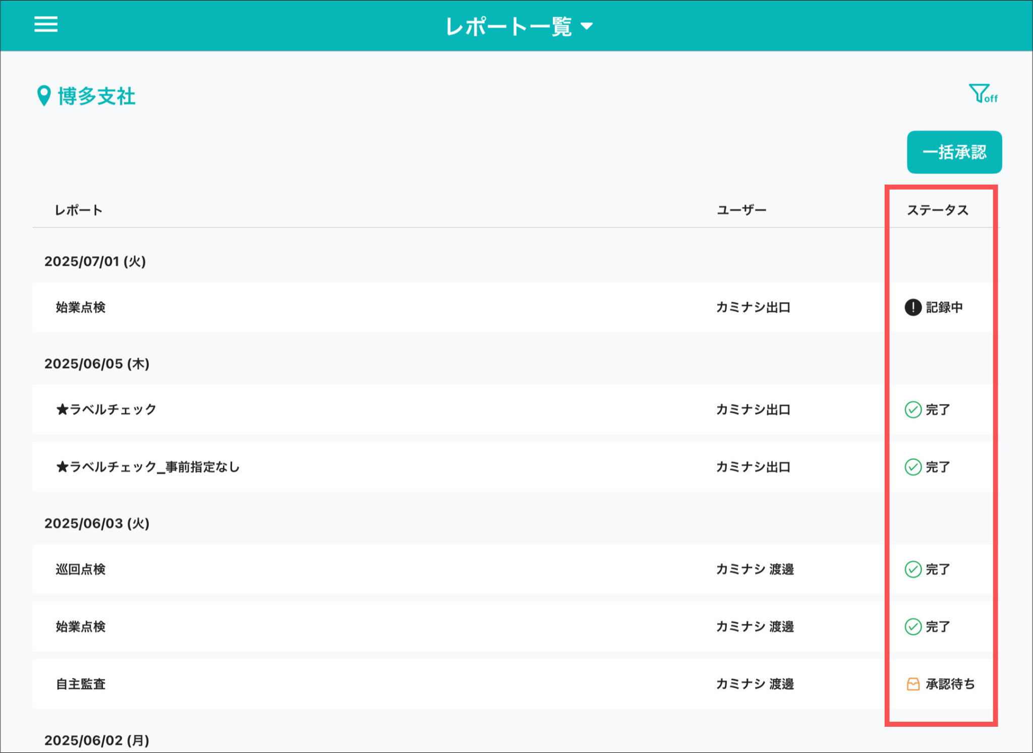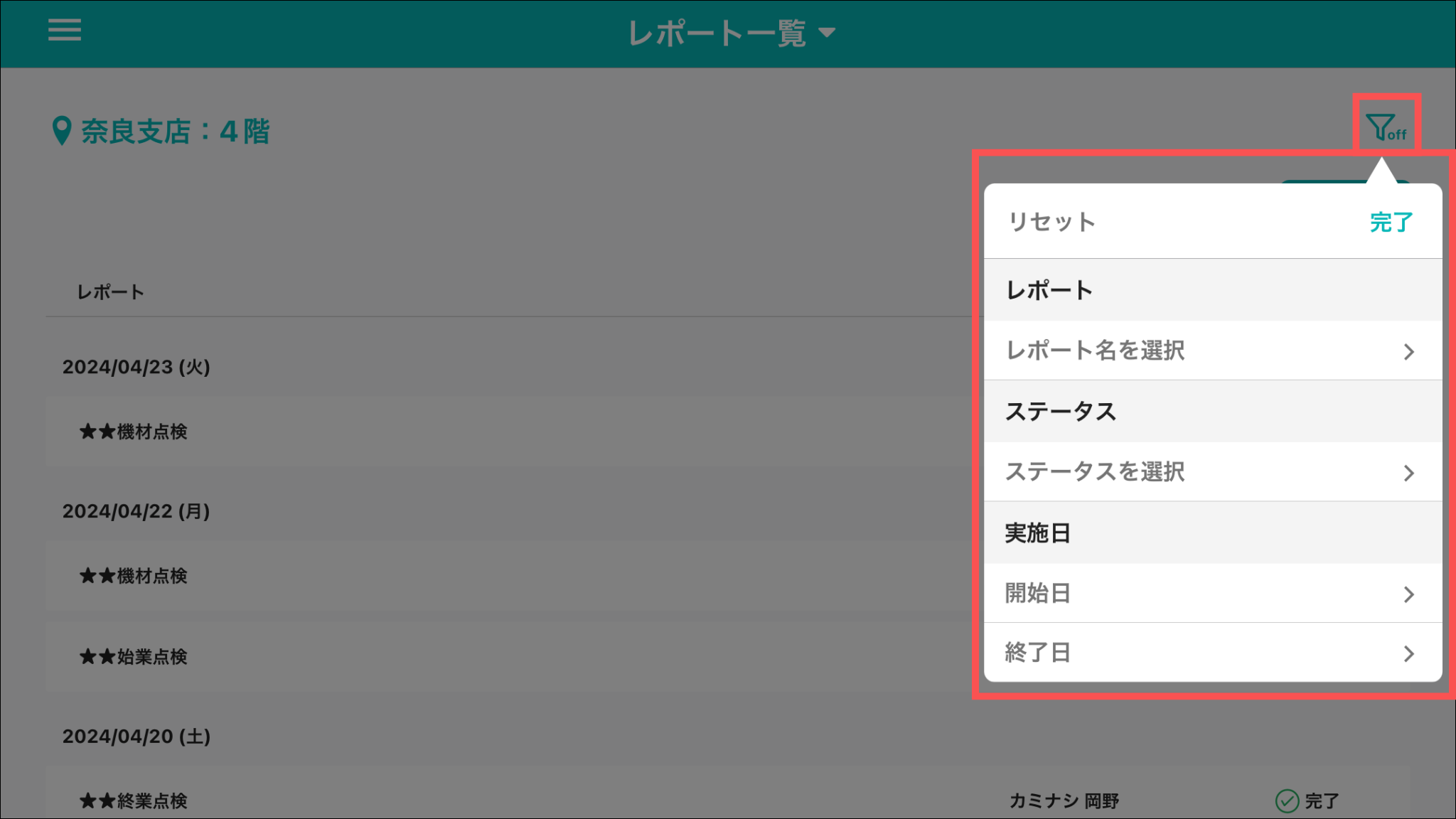 フィルターを押して、レポート・ステータス・実施日を絞って検索できます。