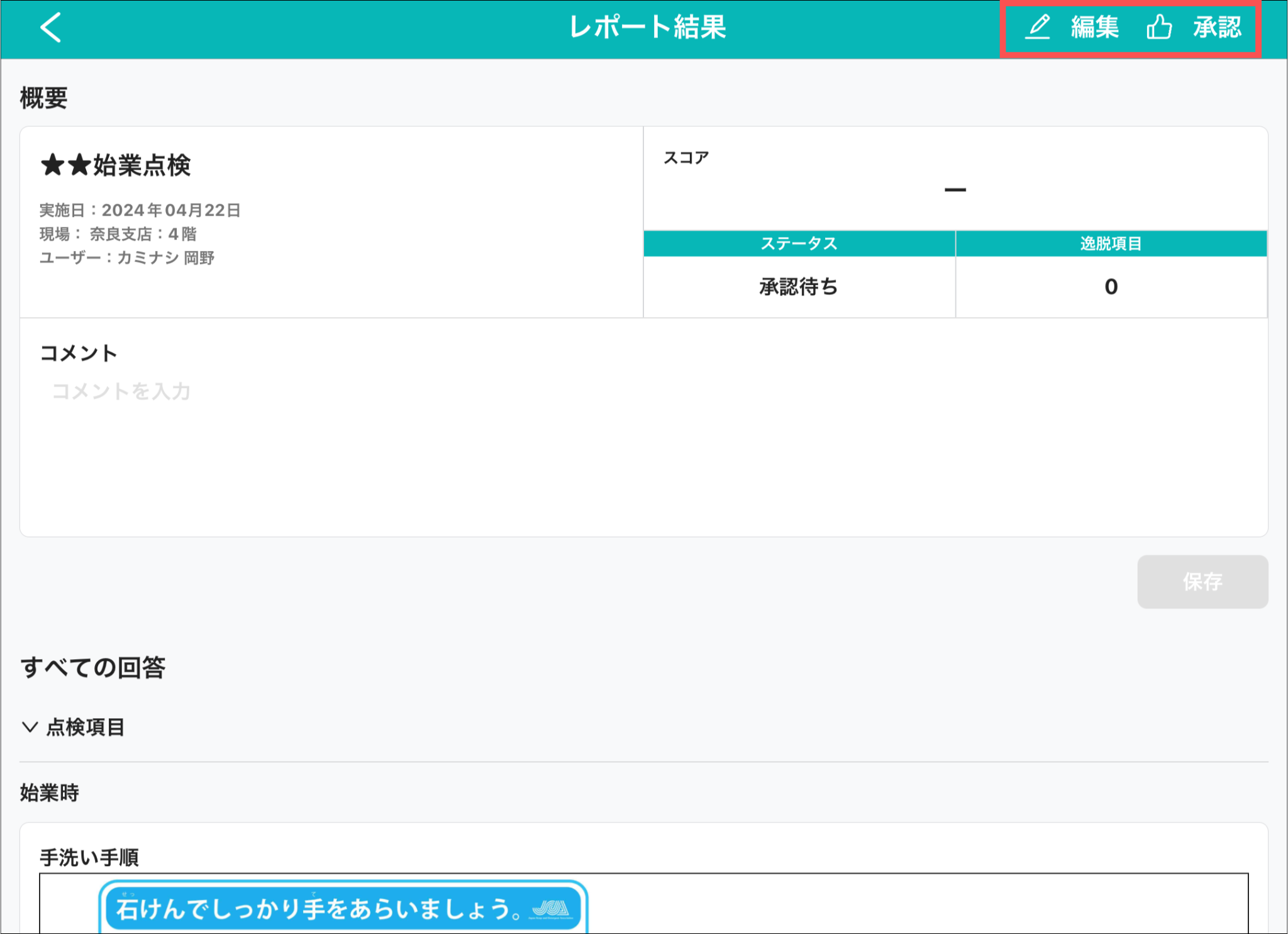 「承認」からレポートの承認をすることができます。承認フローに設定されているユーザーでログインした場合のみ承認を行うことができます。